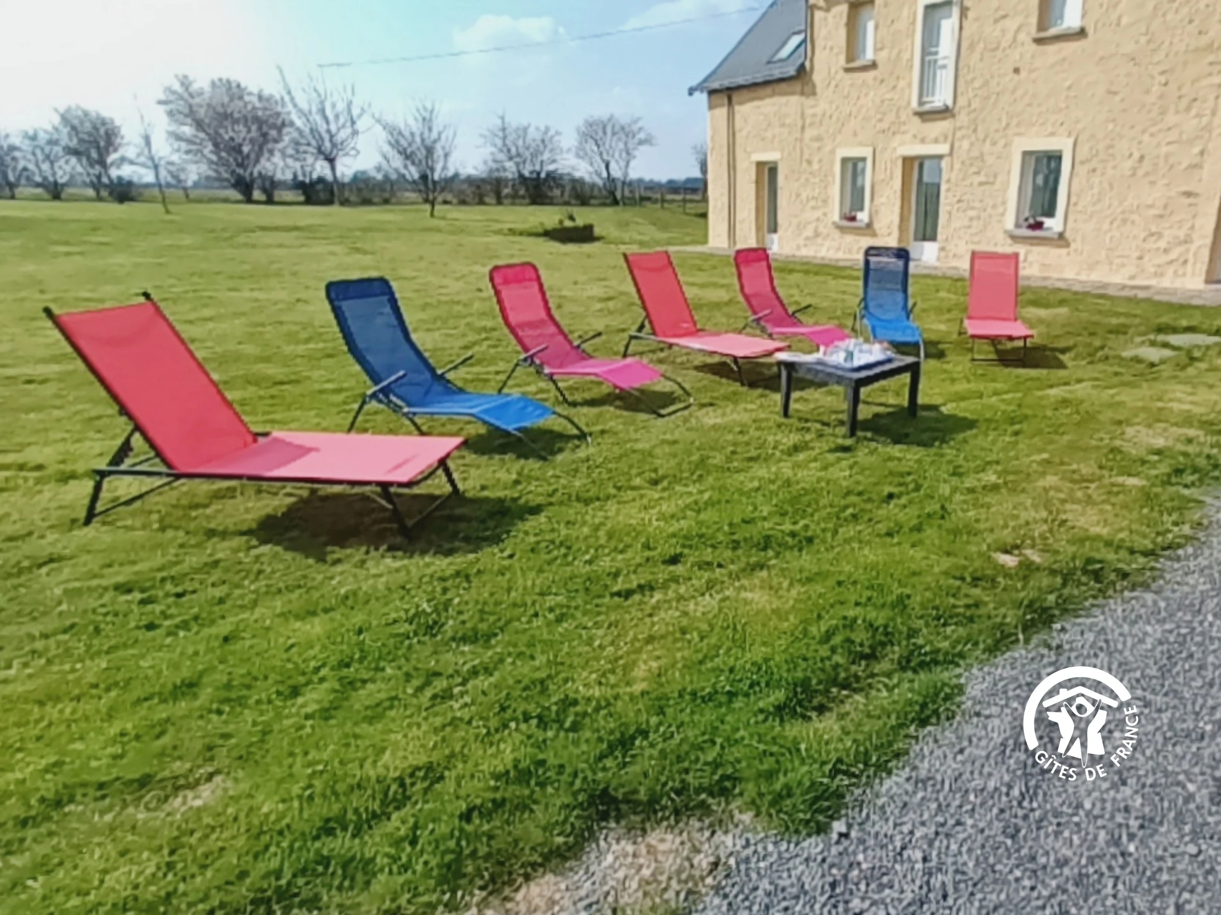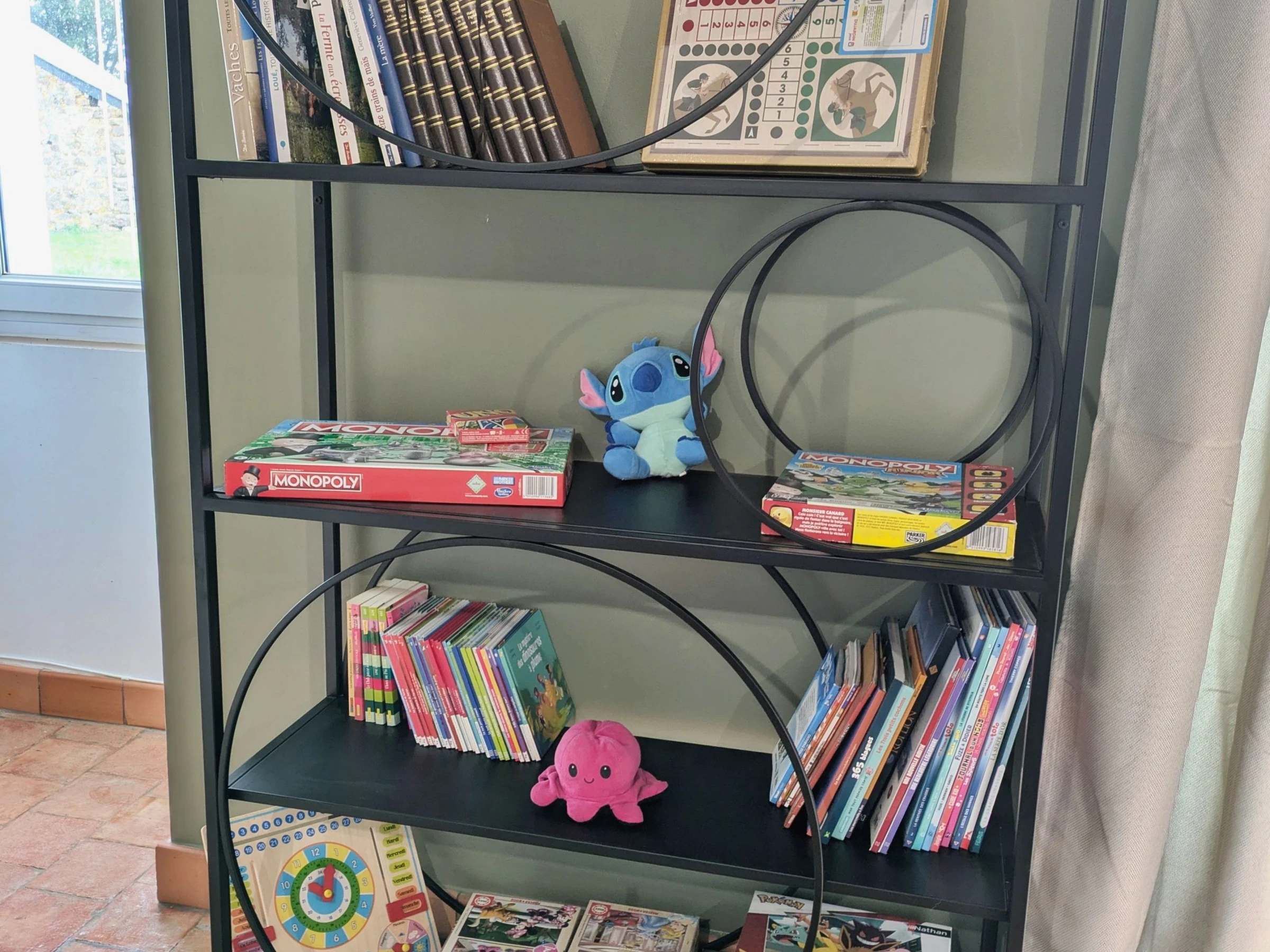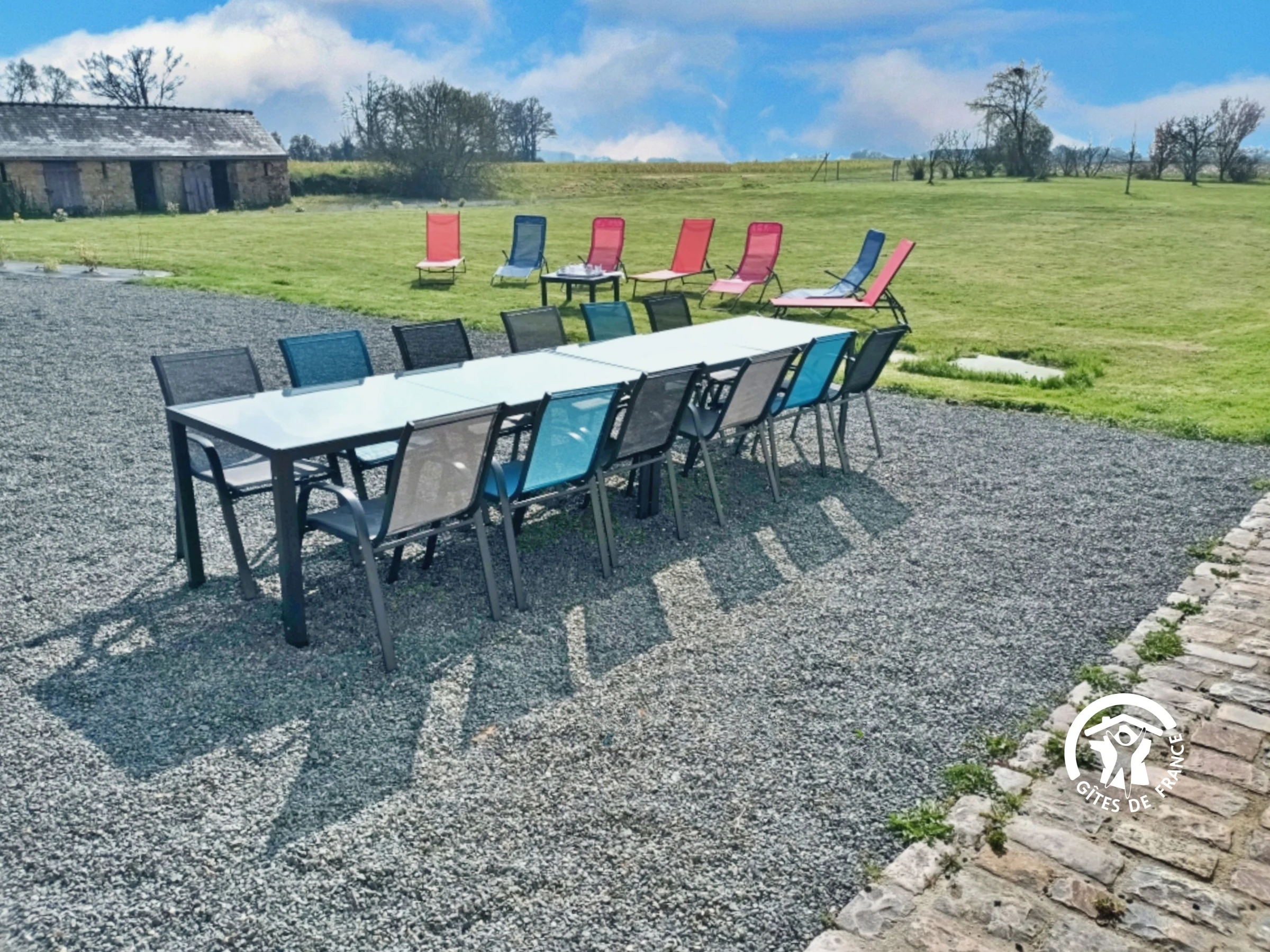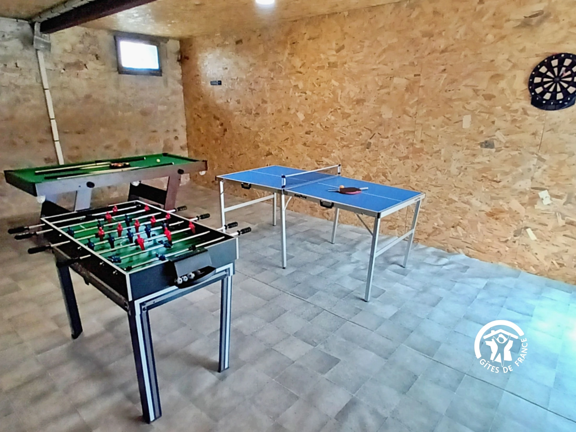 Terrace with dining table and chairs, deckchairs, and an electric grill. Games: Ping-pong table, foosball, pétanque balls, Mölkky, racket balls, and board games in the house.
