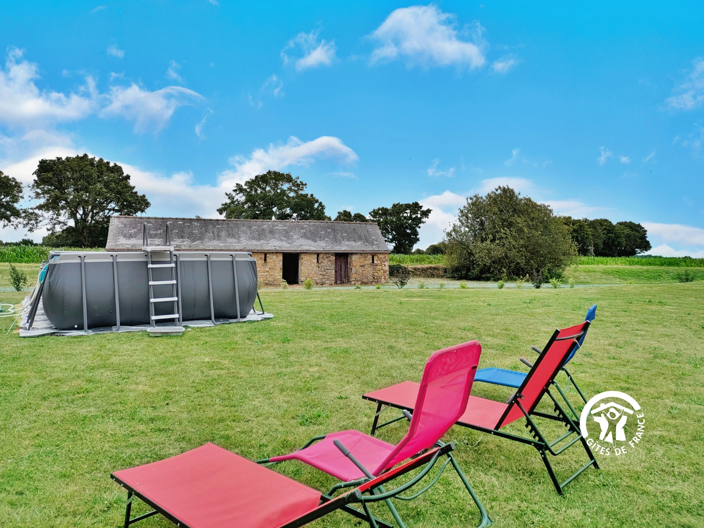 7.3m x 3.66m self-supporting swimming pool, 1.33m high. Safety provided by a 1.4m high removable ladder. From June to September.