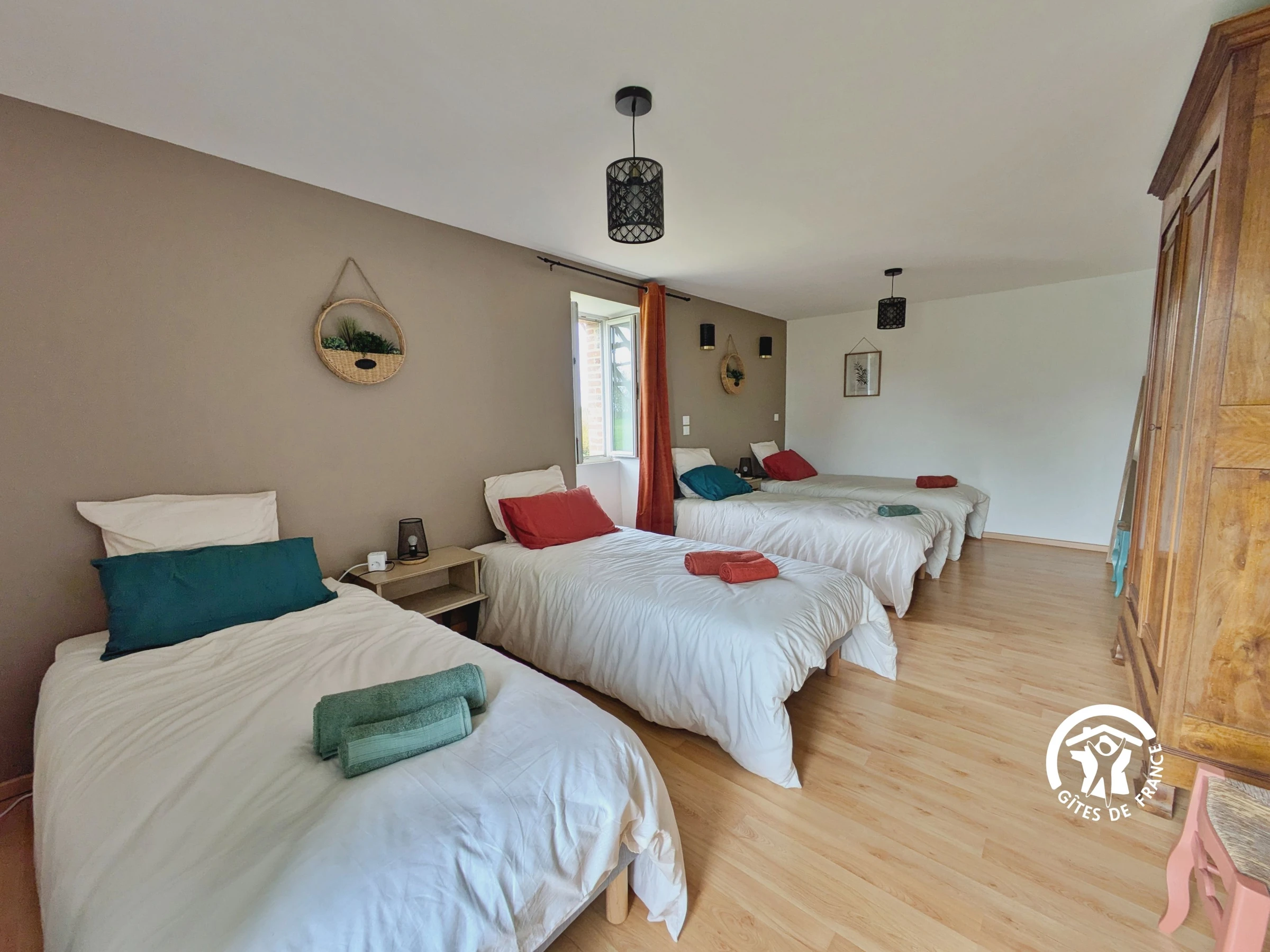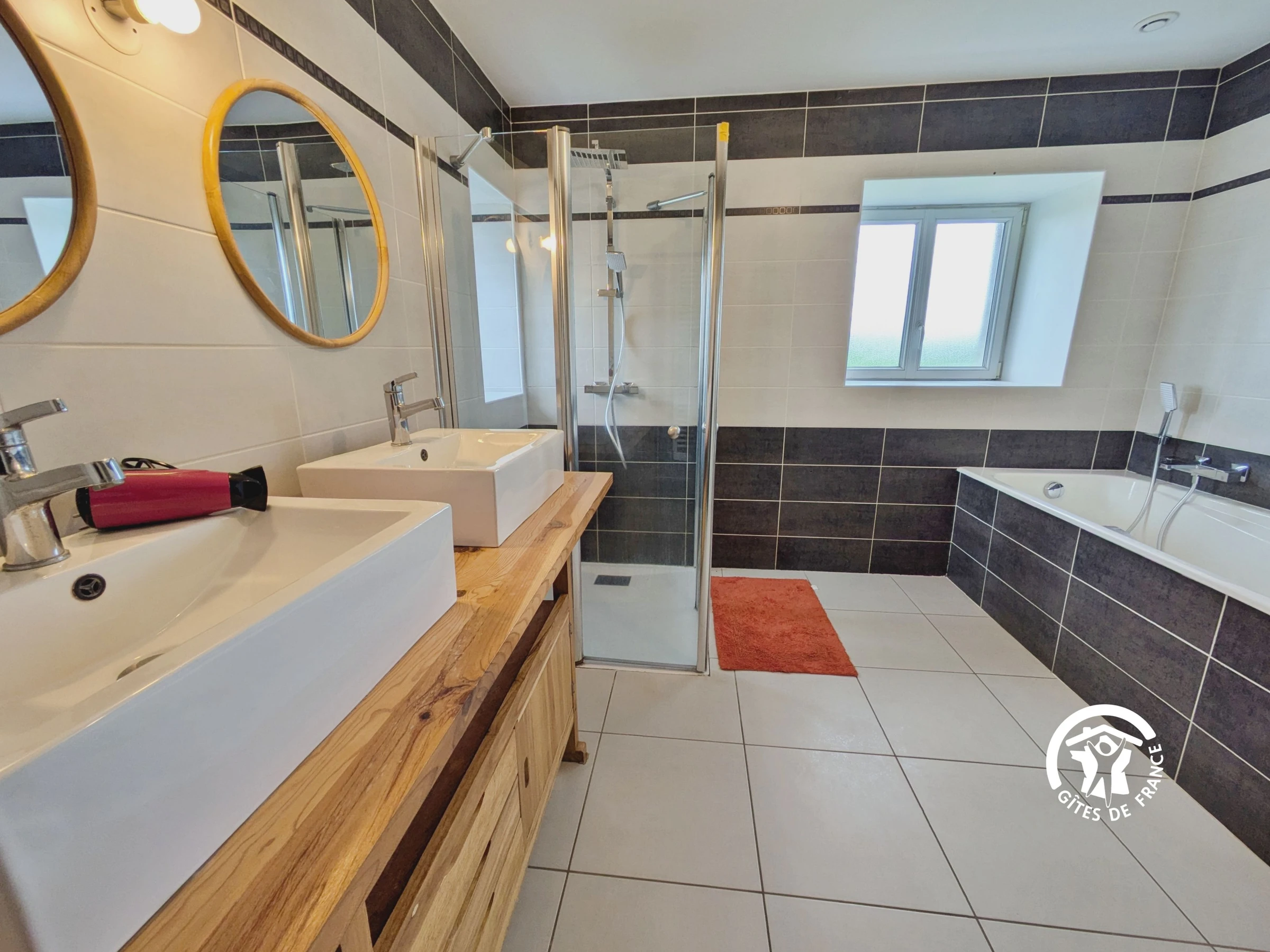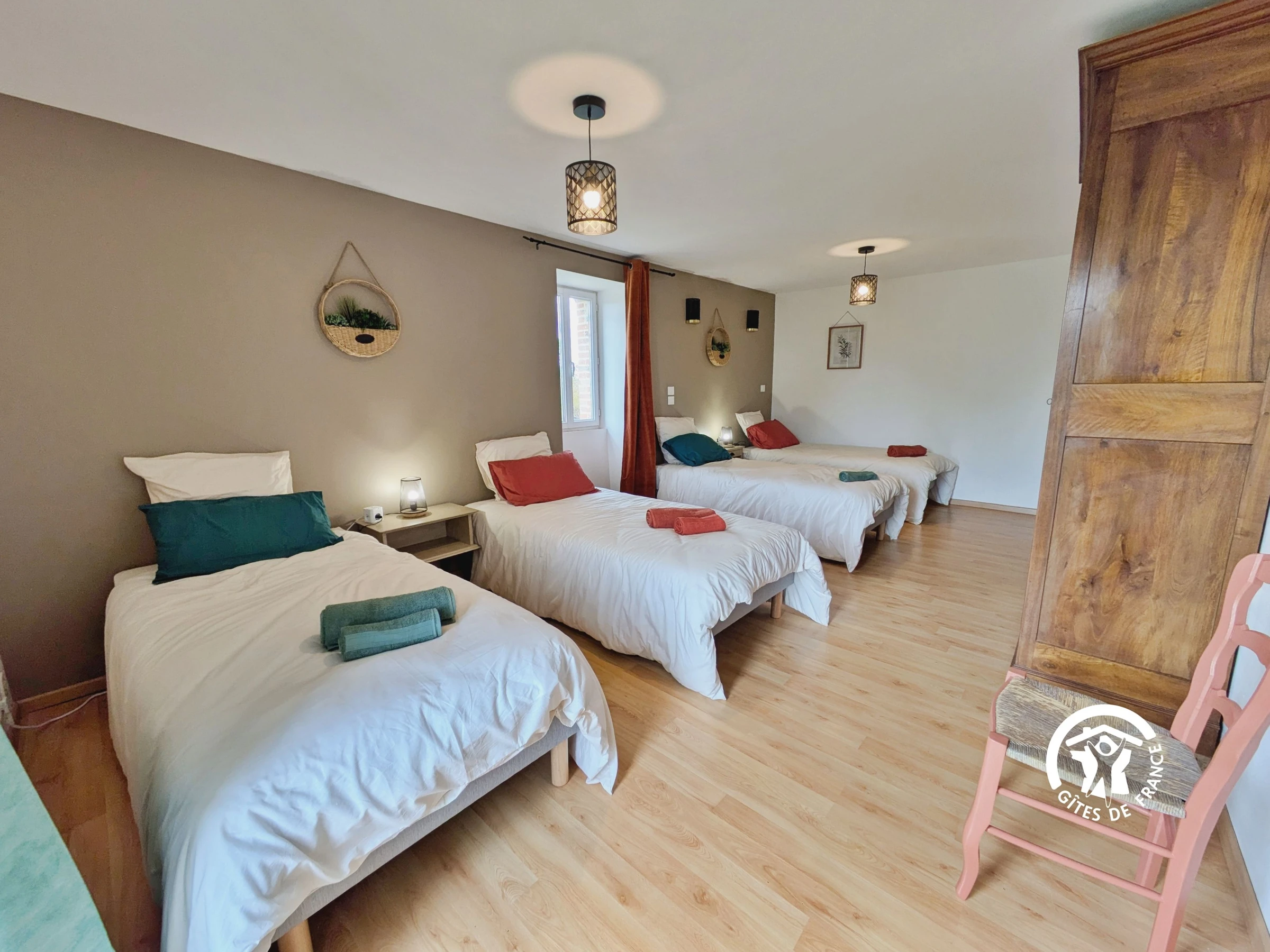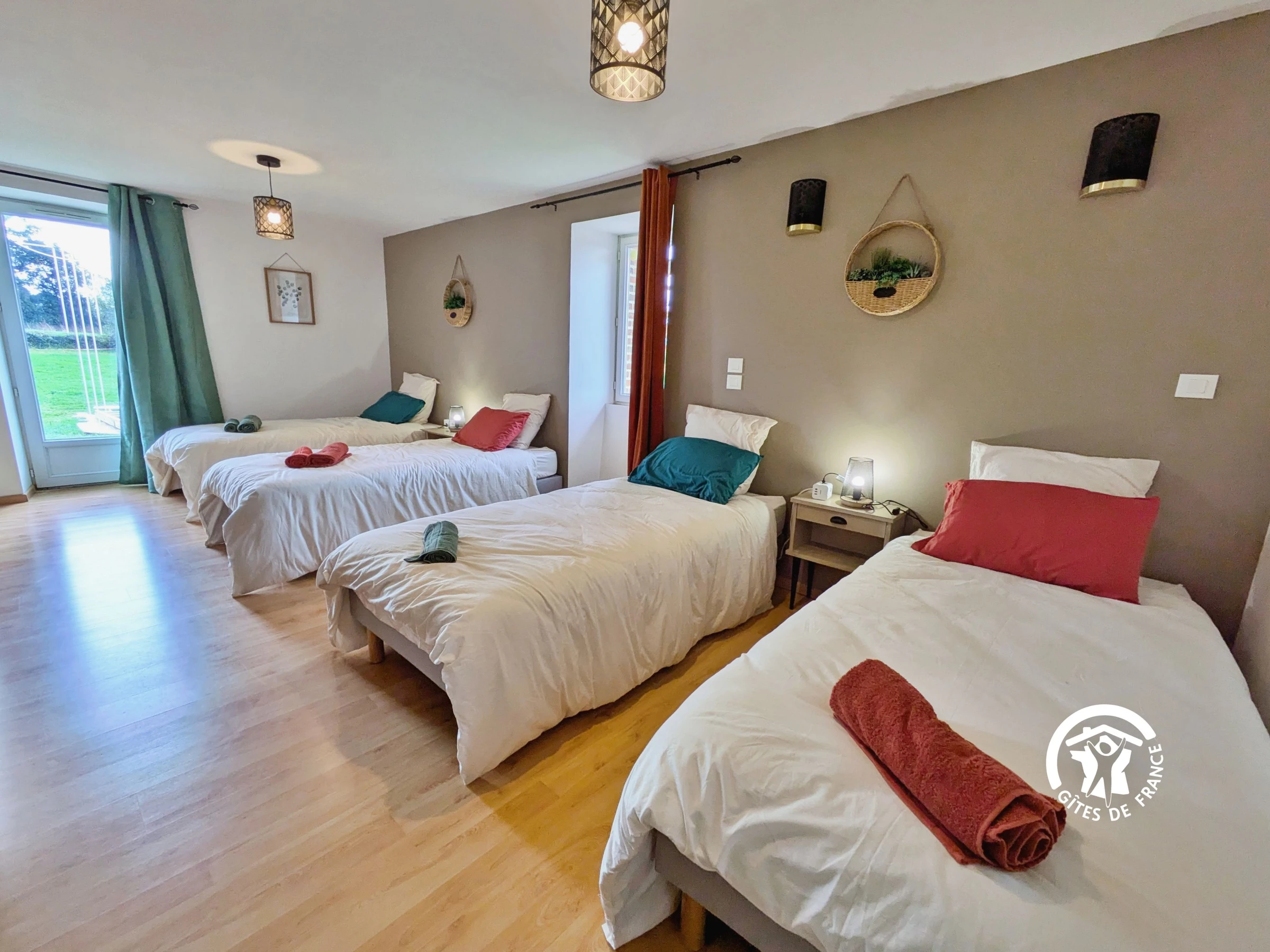 NOTE: The house is not certified as a Youth and Sports Center or a public access building (ERP), and is therefore not suitable for youth stays with supervisors. This detached house is spread over two levels. LEVEL 0: dining room and equipped kitchen 50m² (oven, 3-burner hob, microwave, dishwasher, refrigerator, freezer, kettle, filter coffee maker and pod coffee maker, kettle, toaster, blender, television) - living room 43m² with sofas, television and wood stove - bedroom (1) 23m² with 4 beds 90x200, storage - bedroom (2) 10m² with 1 bed 140x200, large closet - bathroom, double sink and shower, towel dryer, hair dryer - separate toilet - laundry room with washing machine. LEVEL 1: Landing furnished with desk, armchair, RJ45 socket, sofa, television - Bedroom (3) 10m² with two 90x200 beds, storage - Bedroom (4) 10.4m² with two 90x200 beds, storage - Bedroom (5) 12m² with one 160x200 bed, storage, one baby bed and private bathroom with shower and sink, hairdryer - separate toilet.