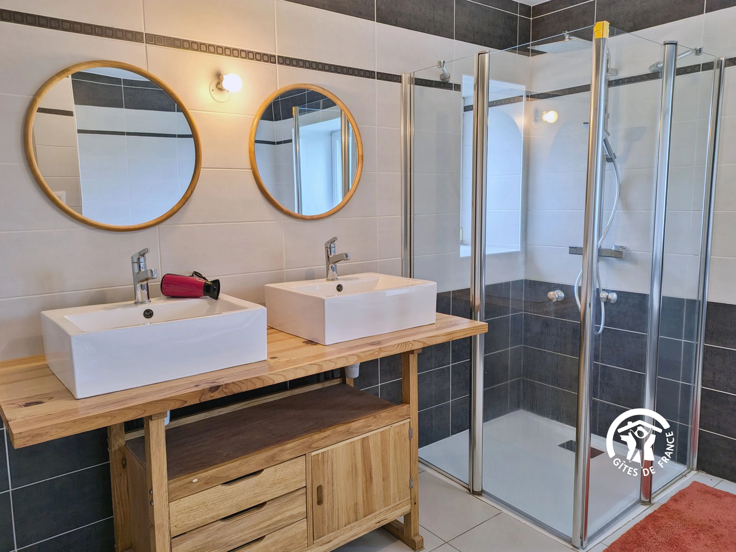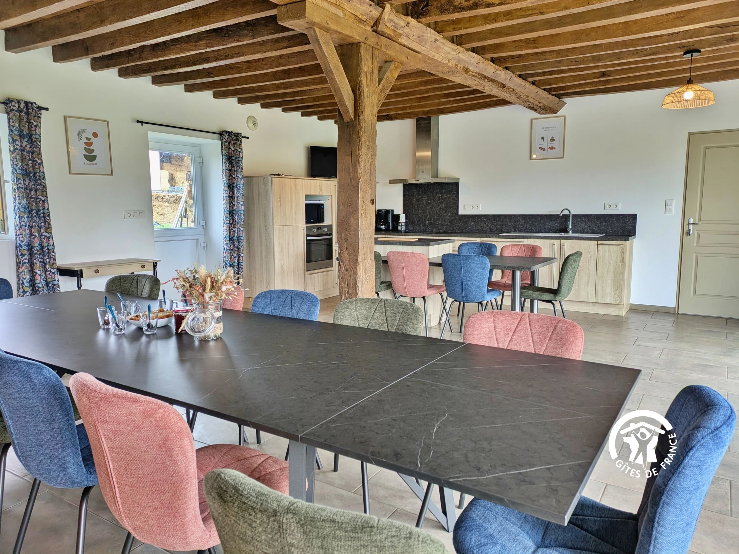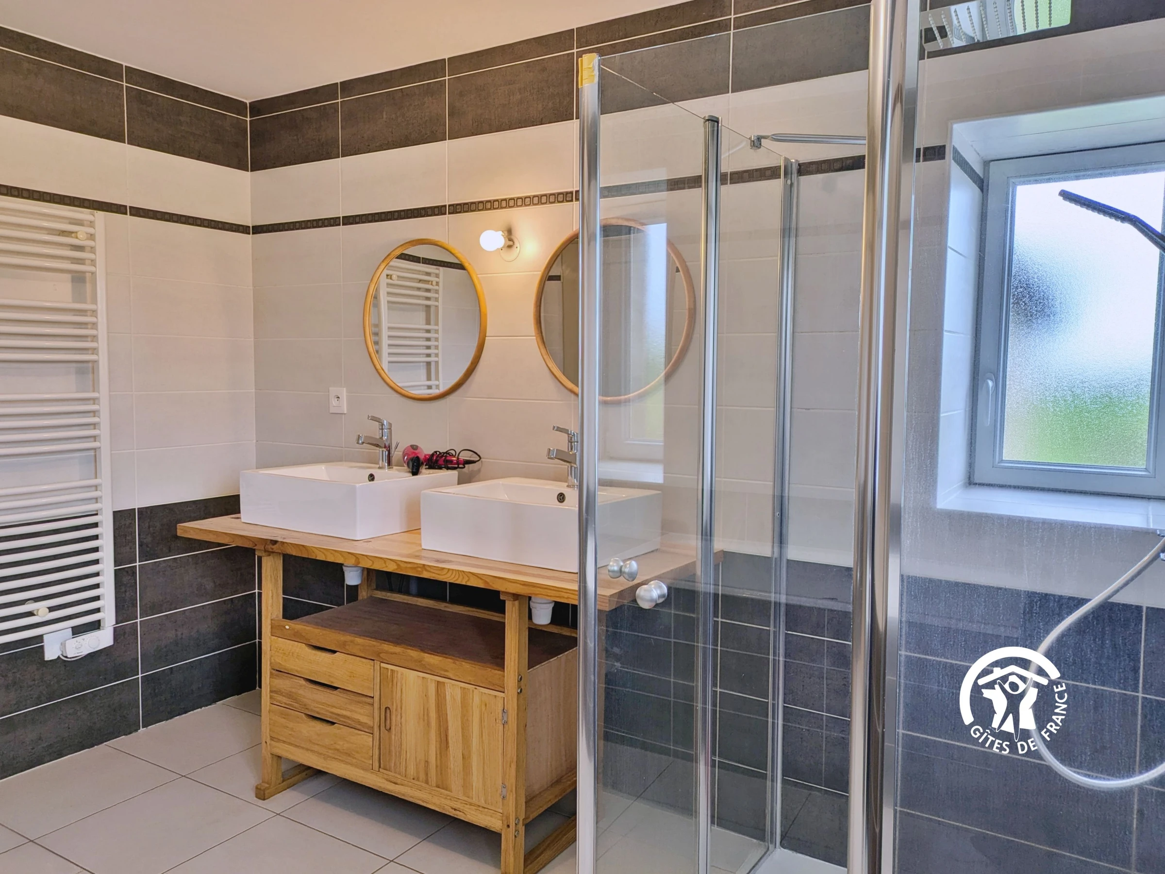 NOTE: The house is not certified as a Youth and Sports Center or a public access building (ERP), and is therefore not suitable for youth stays with supervisors. This detached house is spread over two levels. LEVEL 0: dining room and equipped kitchen 50m² (oven, 3-burner hob, microwave, dishwasher, refrigerator, freezer, kettle, filter coffee maker and pod coffee maker, kettle, toaster, blender, television) - living room 43m² with sofas, television and wood stove - bedroom (1) 23m² with 4 beds 90x200, storage - bedroom (2) 10m² with 1 bed 140x200, large closet - bathroom, double sink and shower, towel dryer, hair dryer - separate toilet - laundry room with washing machine. LEVEL 1: Landing furnished with desk, armchair, RJ45 socket, sofa, television - Bedroom (3) 10m² with two 90x200 beds, storage - Bedroom (4) 10.4m² with two 90x200 beds, storage - Bedroom (5) 12m² with one 160x200 bed, storage, one baby bed and private bathroom with shower and sink, hairdryer - separate toilet.