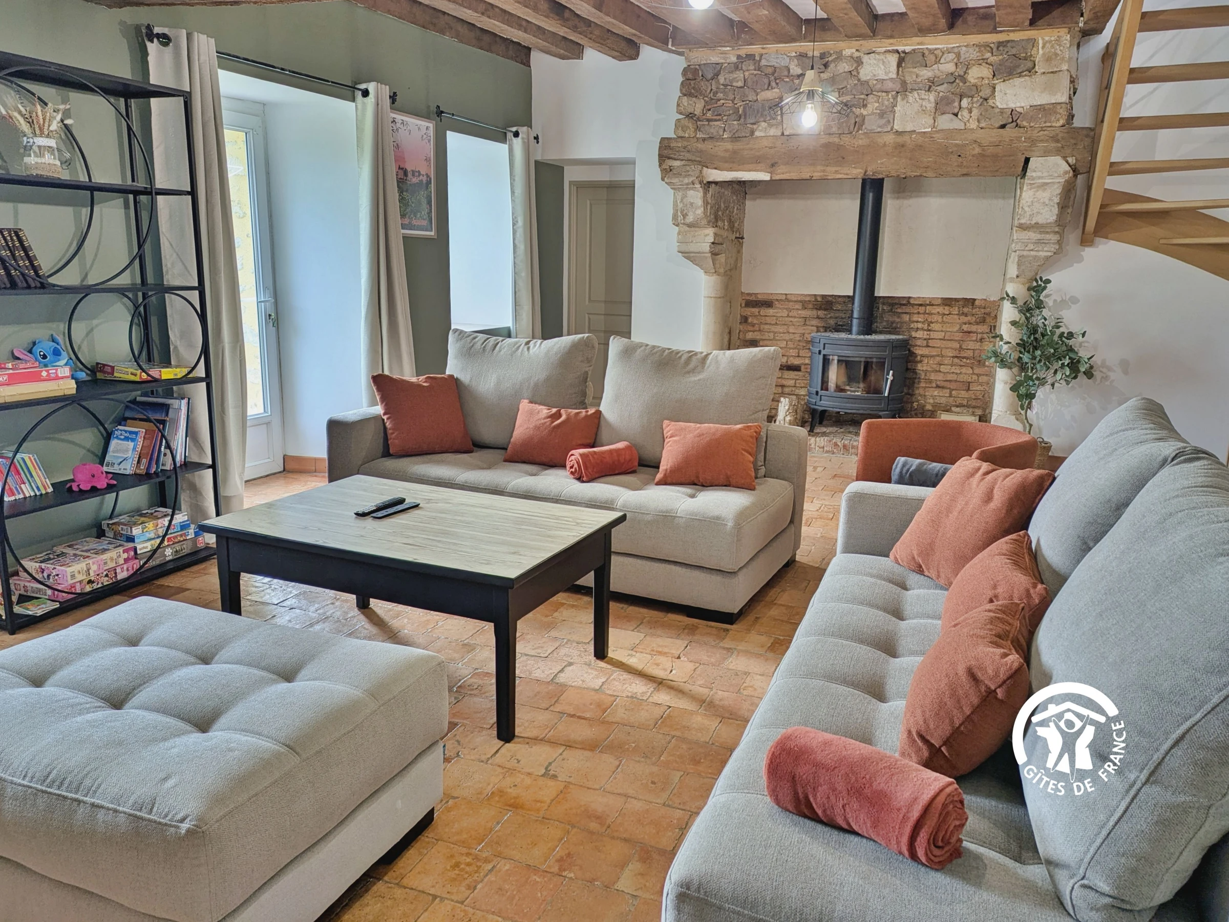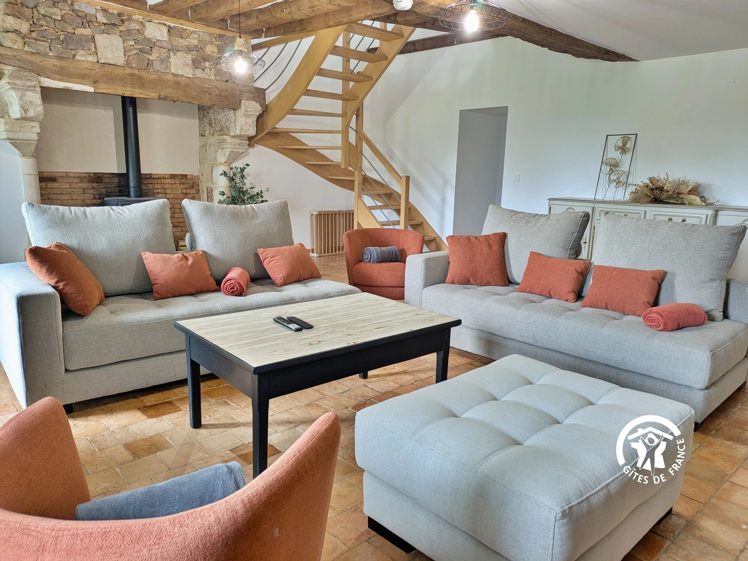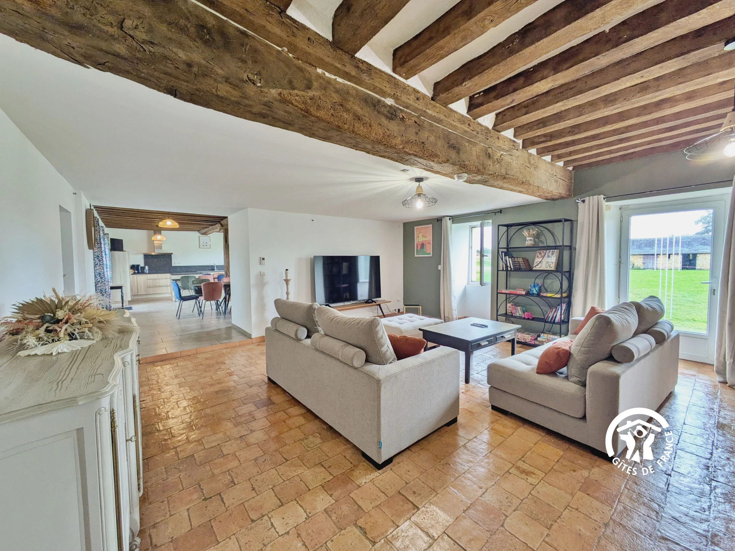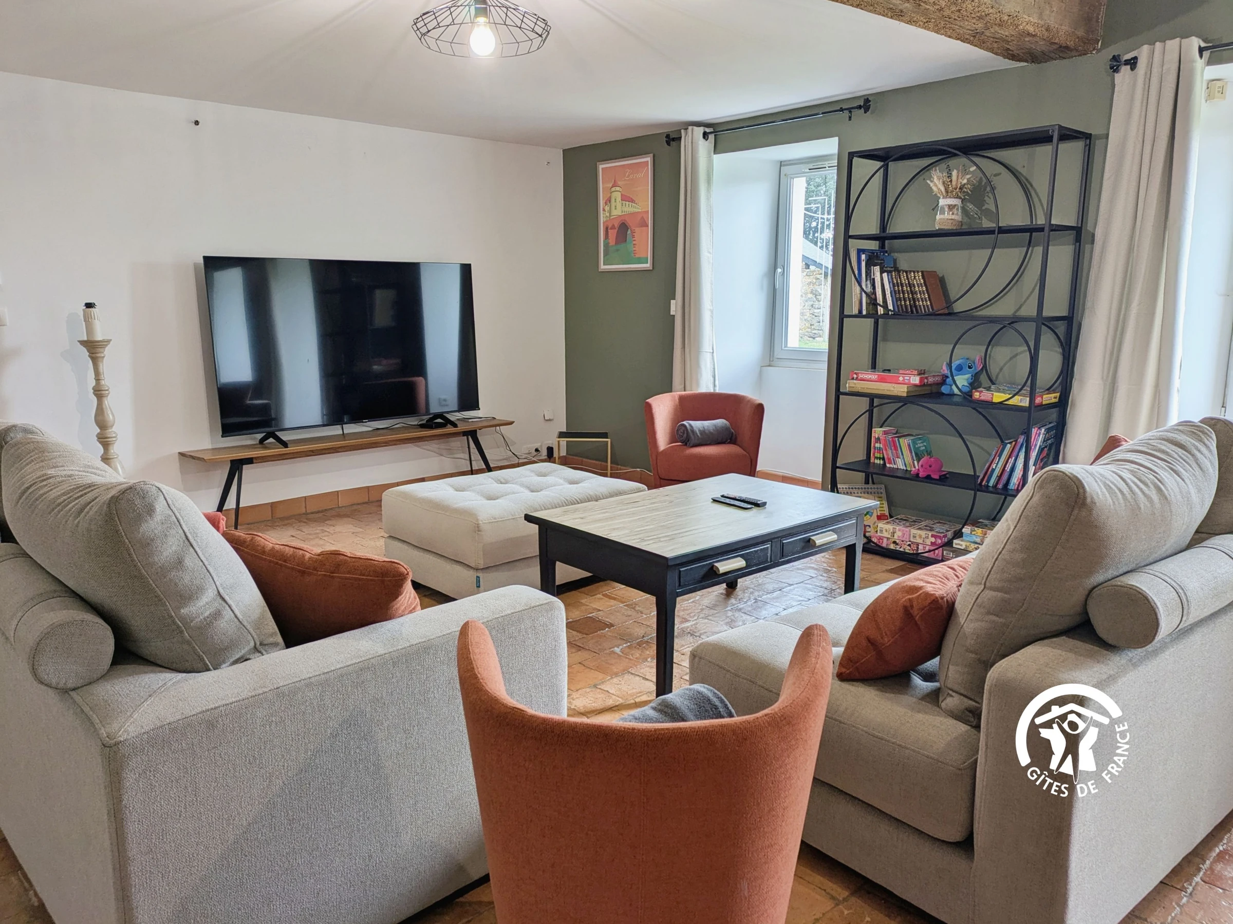 NOTE: The house is not certified as a Youth and Sports Center or a public access building (ERP), and is therefore not suitable for youth stays with supervisors. This detached house is spread over two levels. LEVEL 0: dining room and equipped kitchen 50m² (oven, 3-burner hob, microwave, dishwasher, refrigerator, freezer, kettle, filter coffee maker and pod coffee maker, kettle, toaster, blender, television) - living room 43m² with sofas, television and wood stove - bedroom (1) 23m² with 4 beds 90x200, storage - bedroom (2) 10m² with 1 bed 140x200, large closet - bathroom, double sink and shower, towel dryer, hair dryer - separate toilet - laundry room with washing machine. LEVEL 1: Landing furnished with desk, armchair, RJ45 socket, sofa, television - Bedroom (3) 10m² with two 90x200 beds, storage - Bedroom (4) 10.4m² with two 90x200 beds, storage - Bedroom (5) 12m² with one 160x200 bed, storage, one baby bed and private bathroom with shower and sink, hairdryer - separate toilet.
