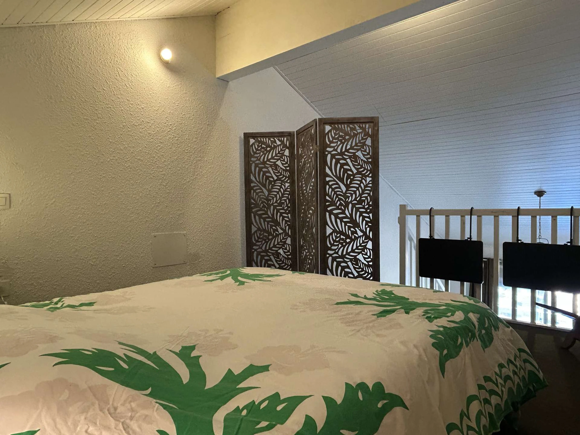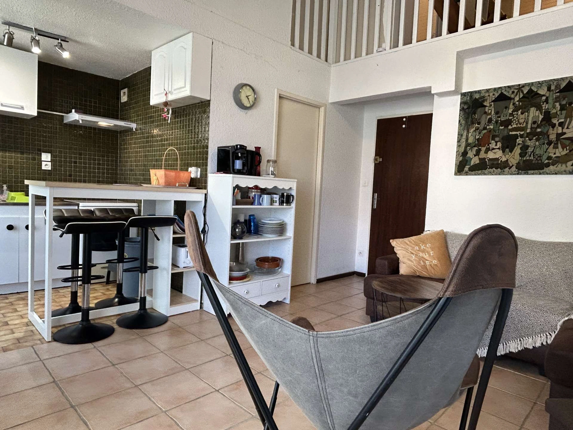 Cet appartement de vacances en duplex, situé au rez-de-chaussée, se compose d'une cuisine équipée ouverte sur le séjour, une mezzanine avec un couchage double (160*190 cm) qui dessert une chambre avec un lit double (140*190 cm), une salle de bain avec WC, une spacieuse terrasse et une place de parking privative.