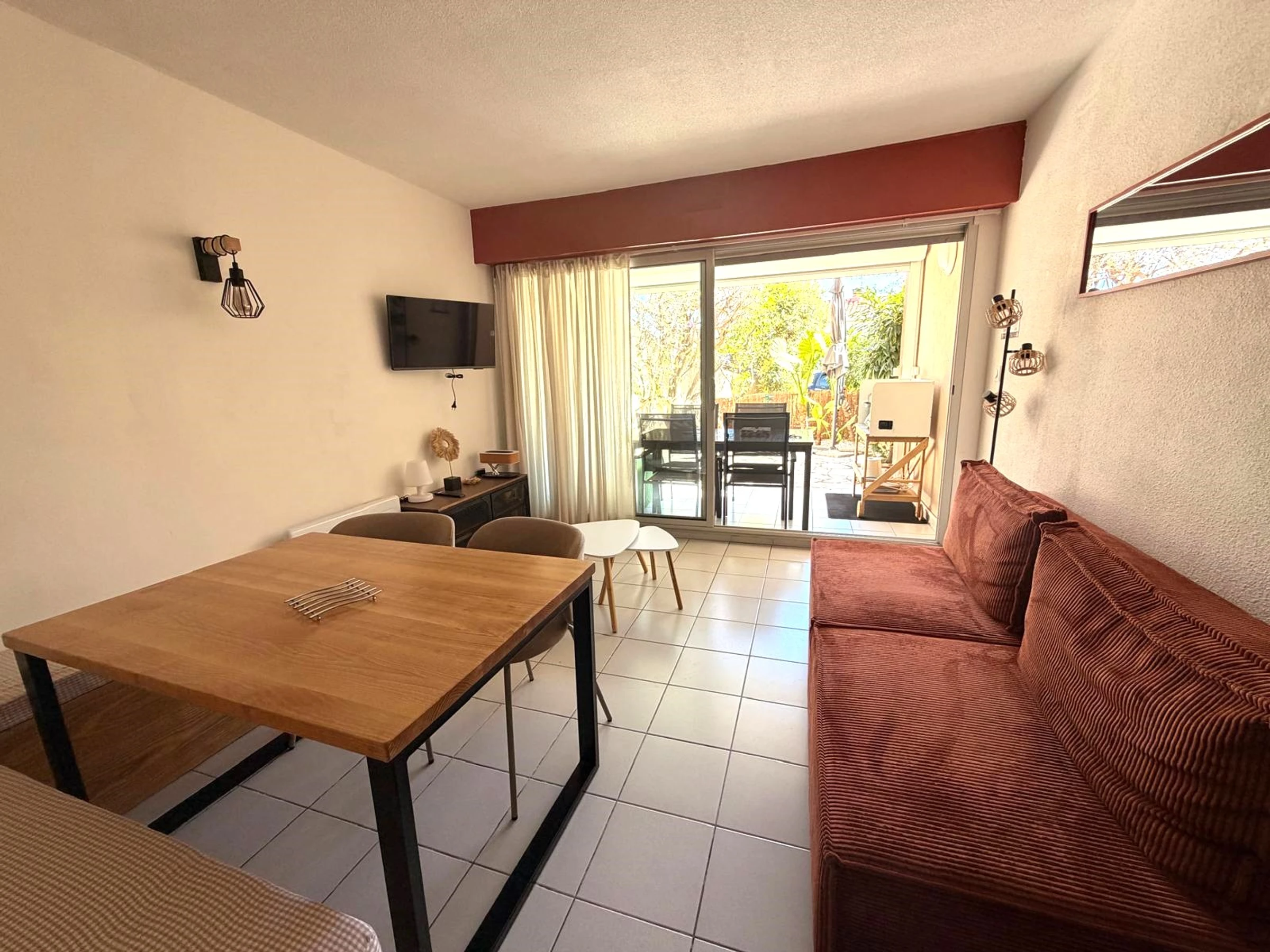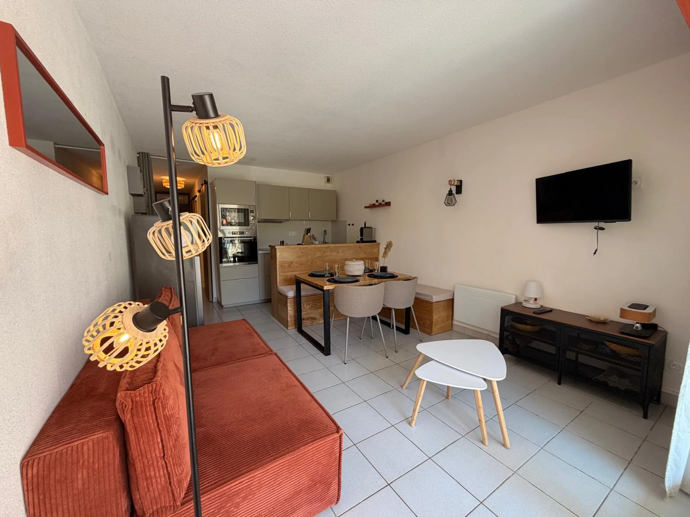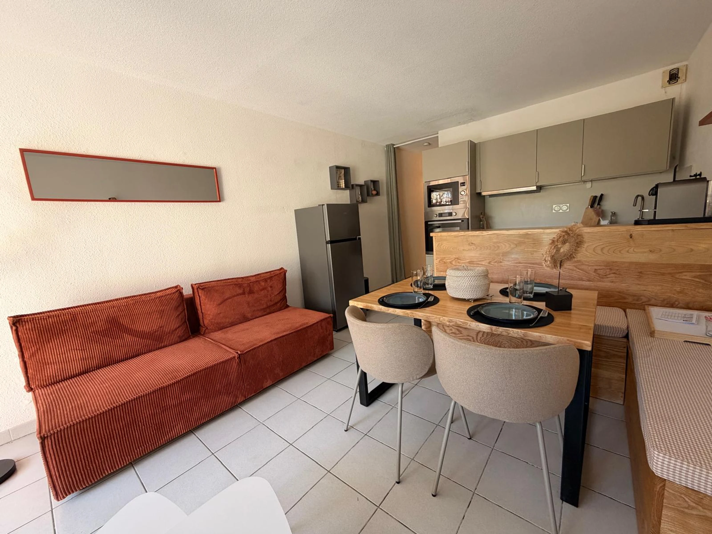 Perfect for 4 people, it comprises a living room with a 160/200 cm sofa bed, a fully equipped kitchenette (Nespresso coffee machine), a bedroom (140/200 cm bed), and a bathroom with a separate toilet.