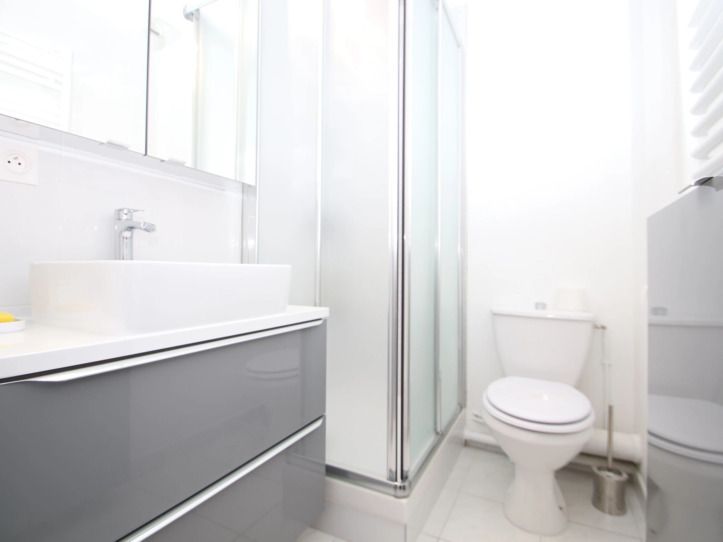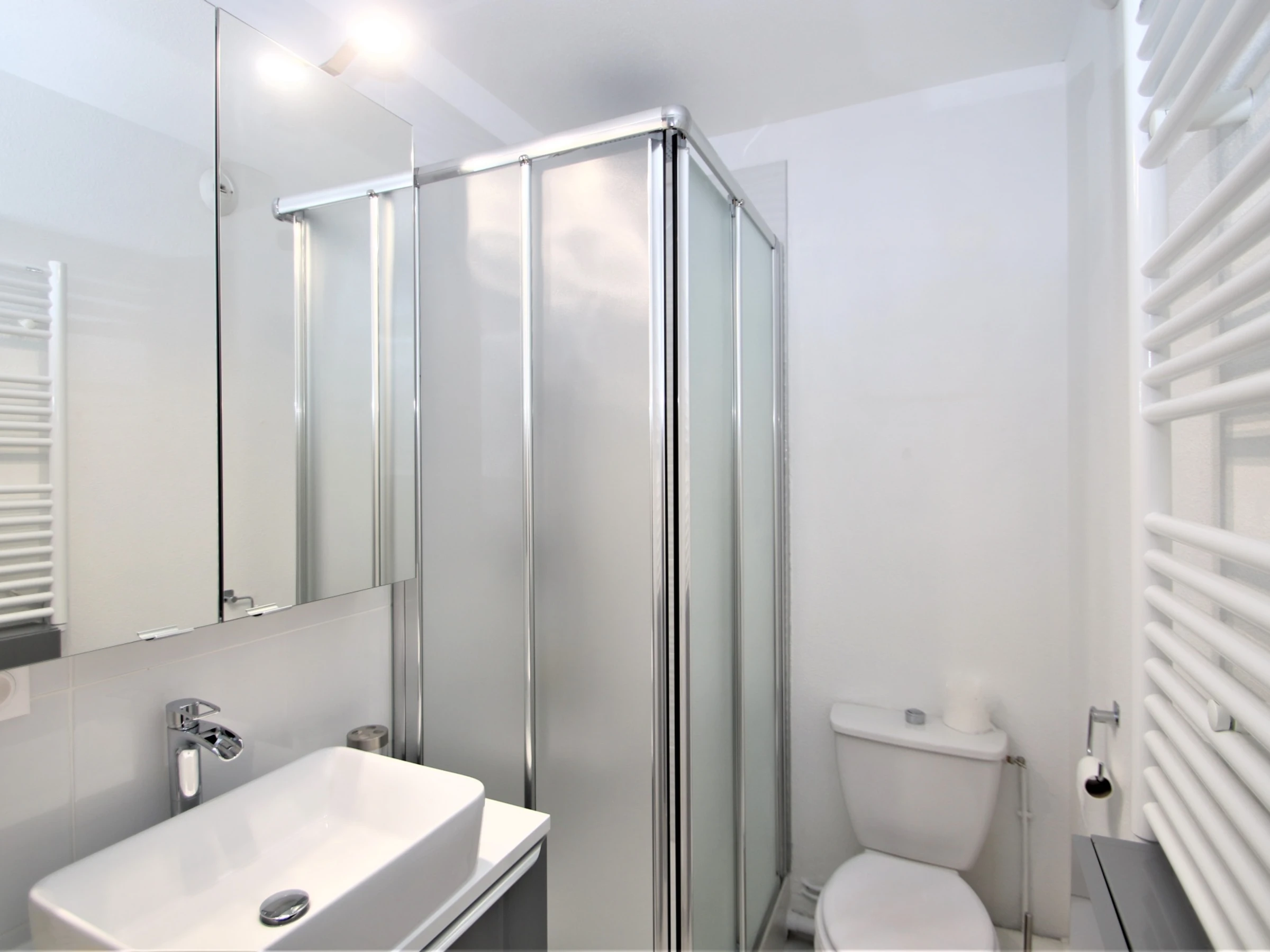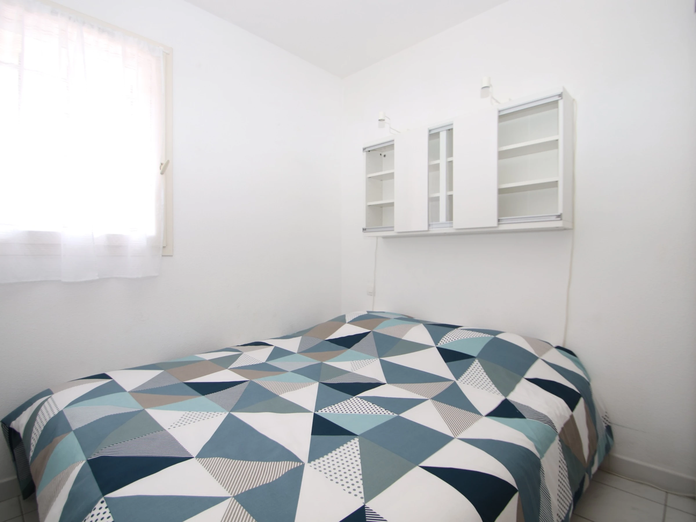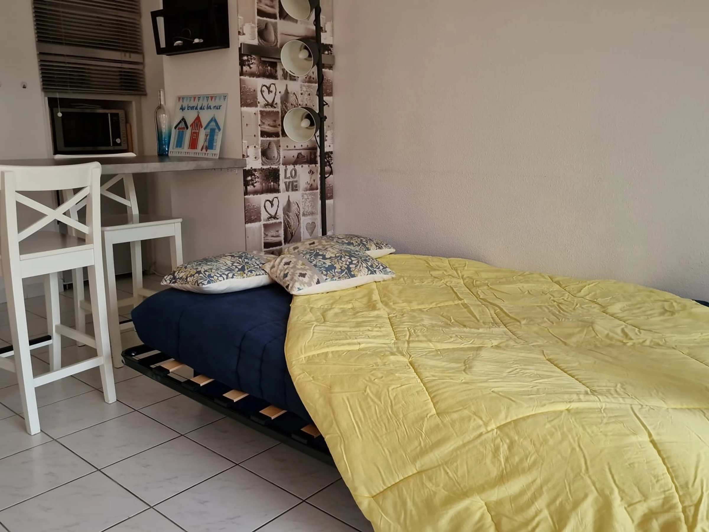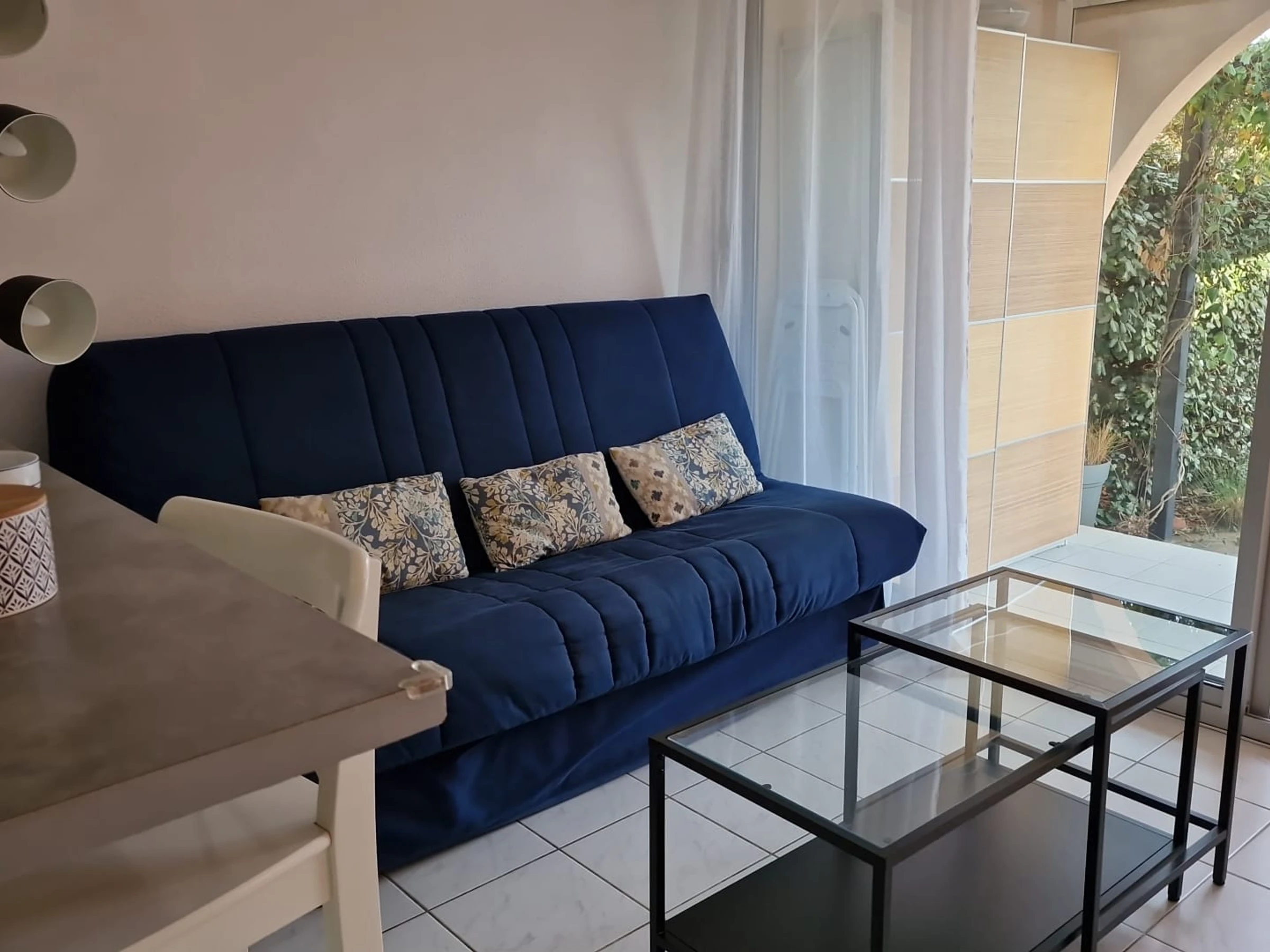 Equipped for 4 people, it features a living room with a sofa bed, a fully equipped kitchenette, a bedroom, and a fully renovated bathroom with toilet.