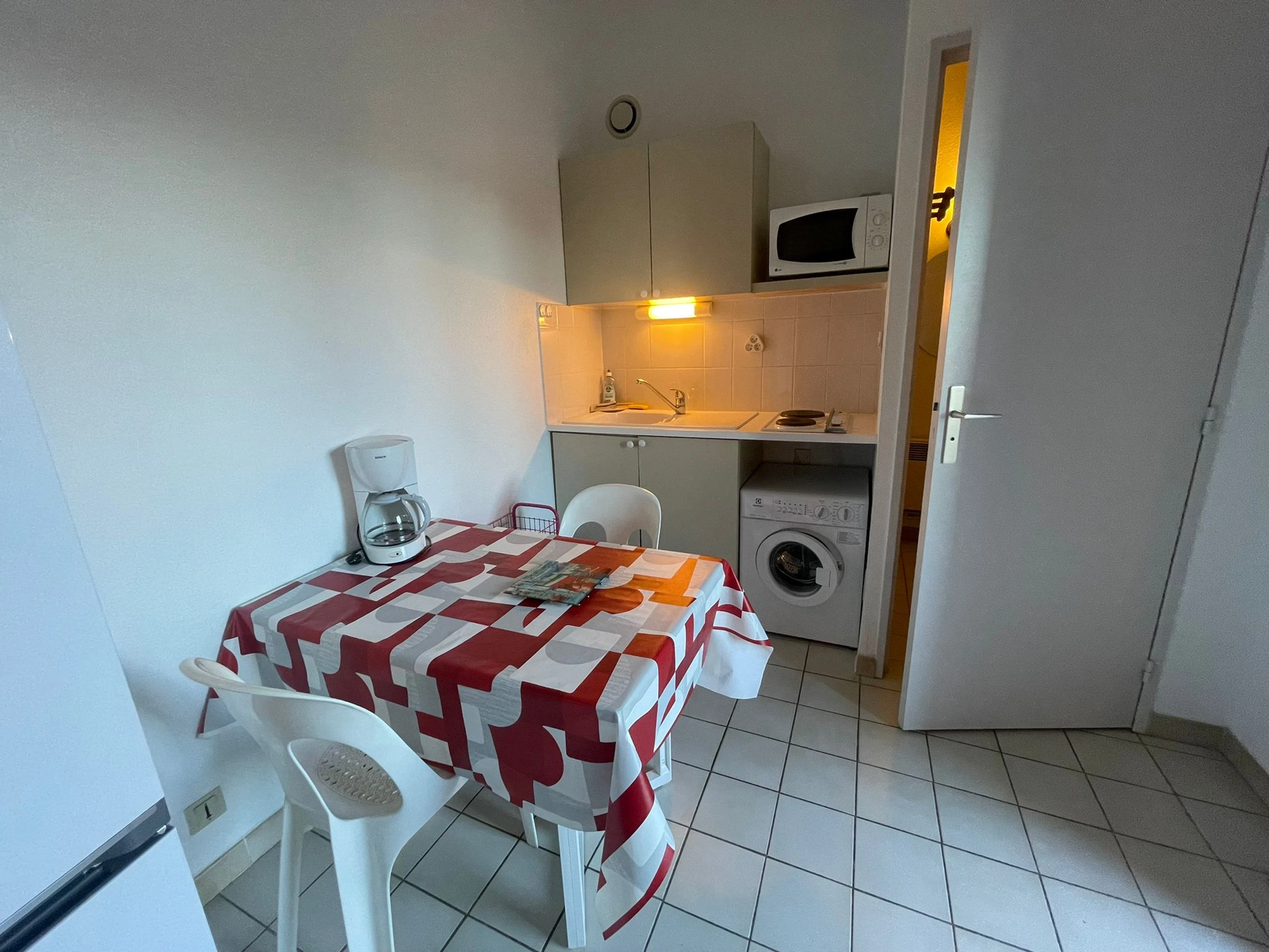 Ideal for two people, this studio comprises a living area with a sofa bed, a fully equipped kitchenette (filter coffee maker), and a bathroom with toilet.