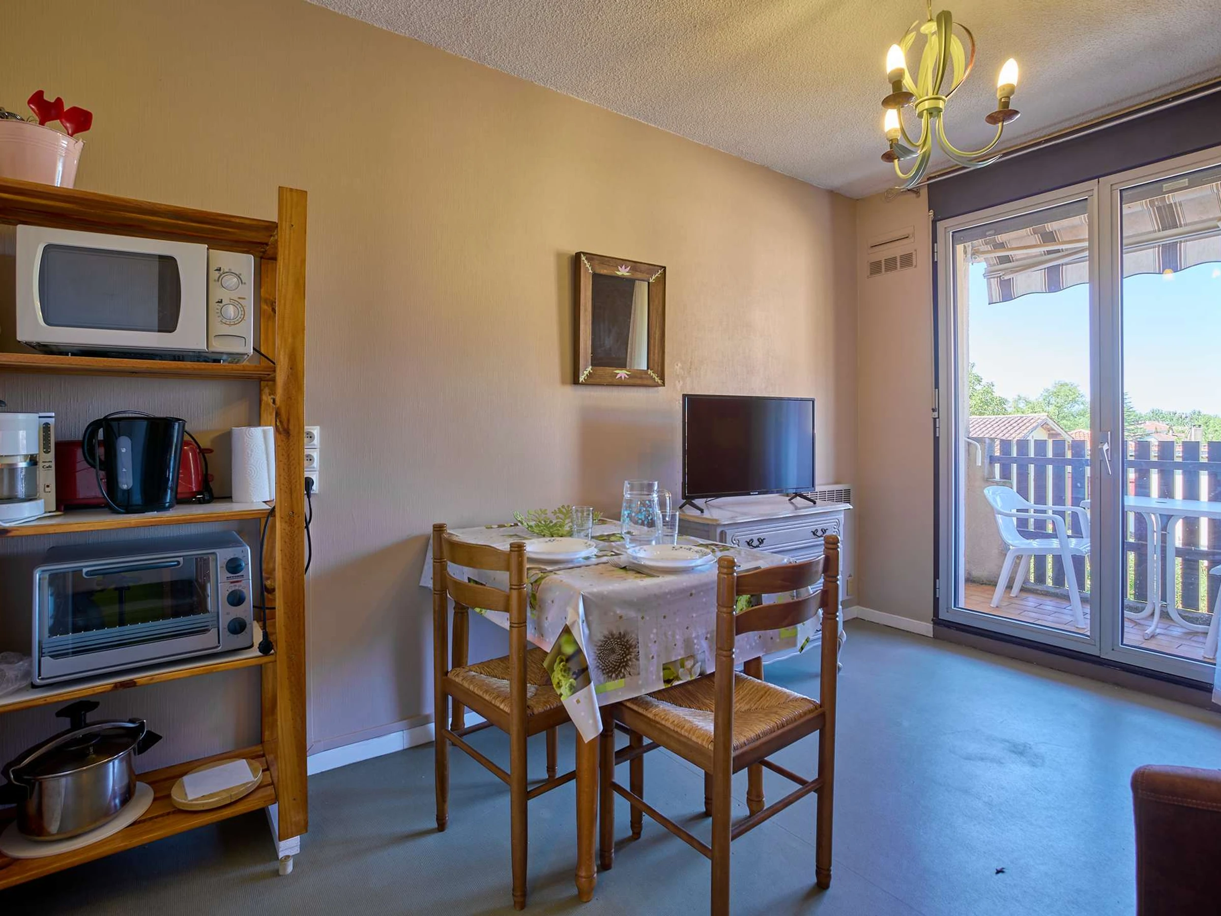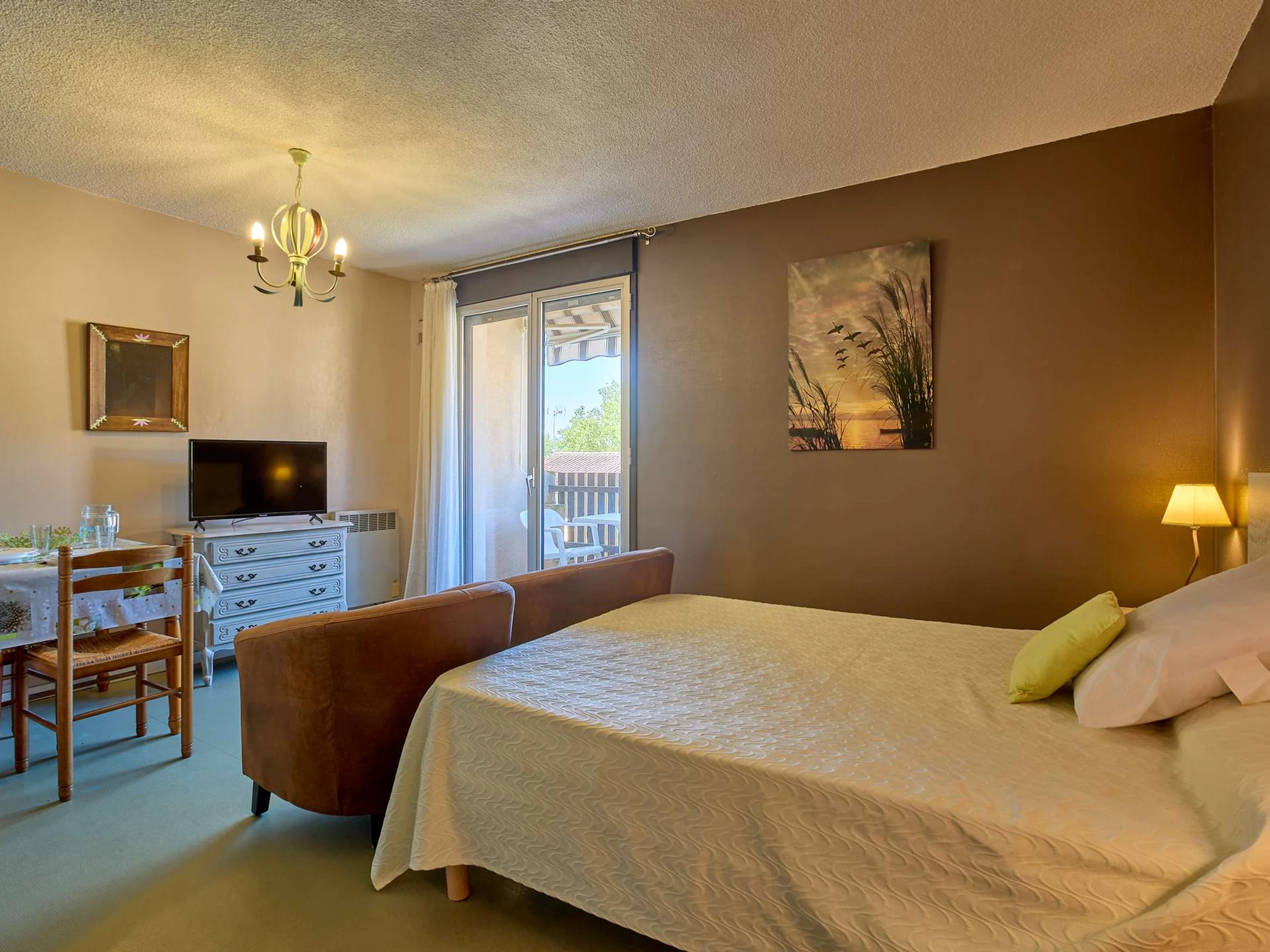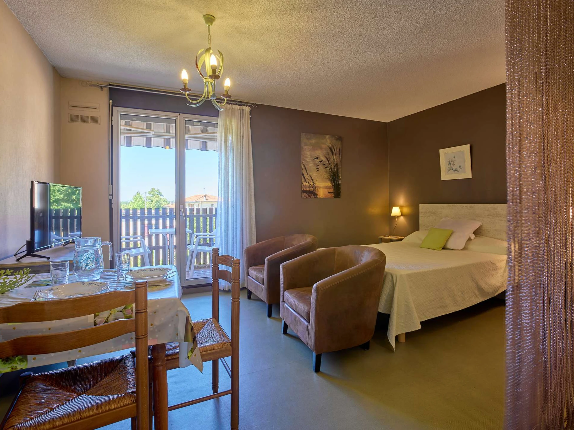 Main room with table, armchairs, dresser, TV, functional kitchen, and double bed (140 cm).