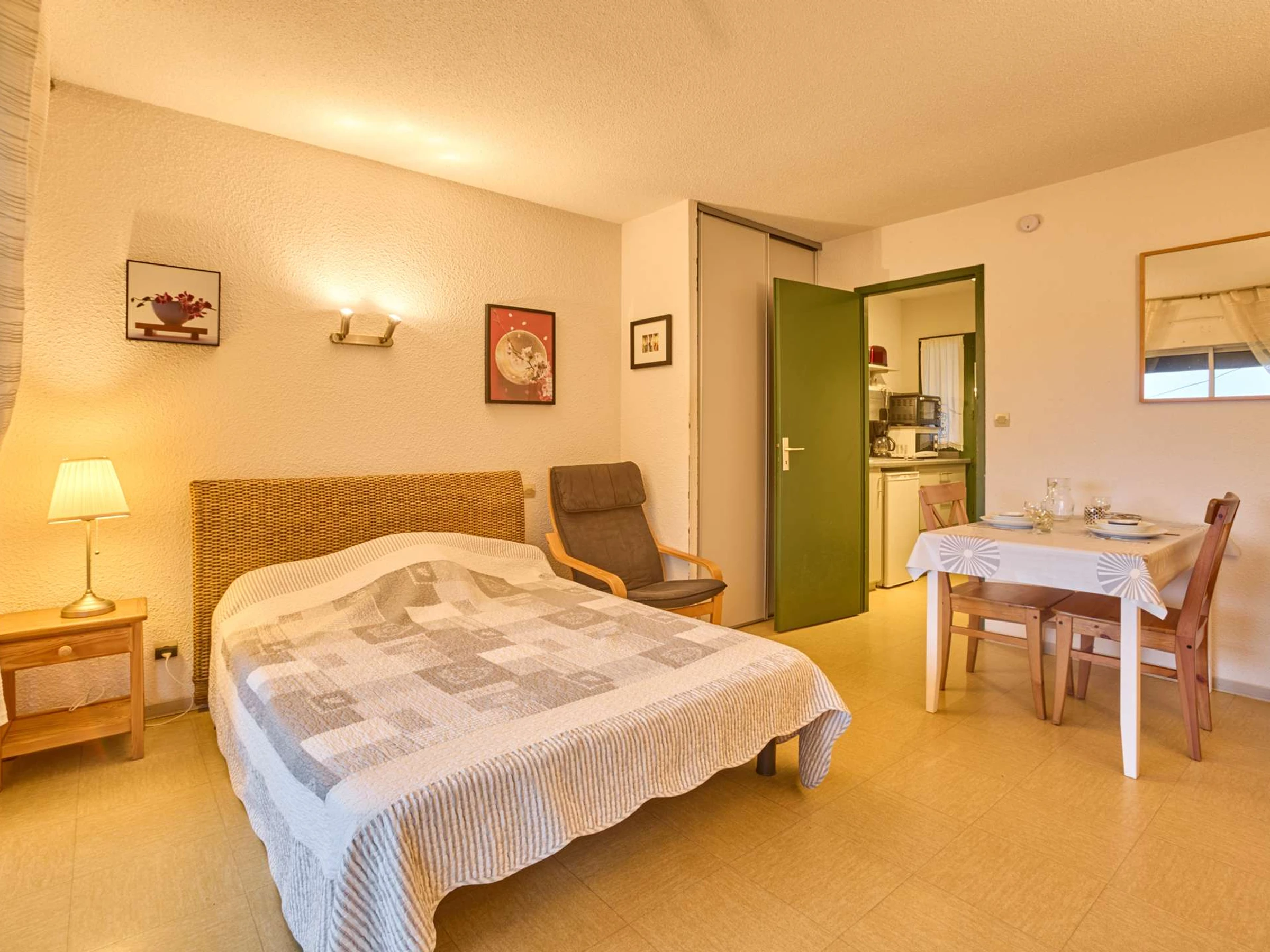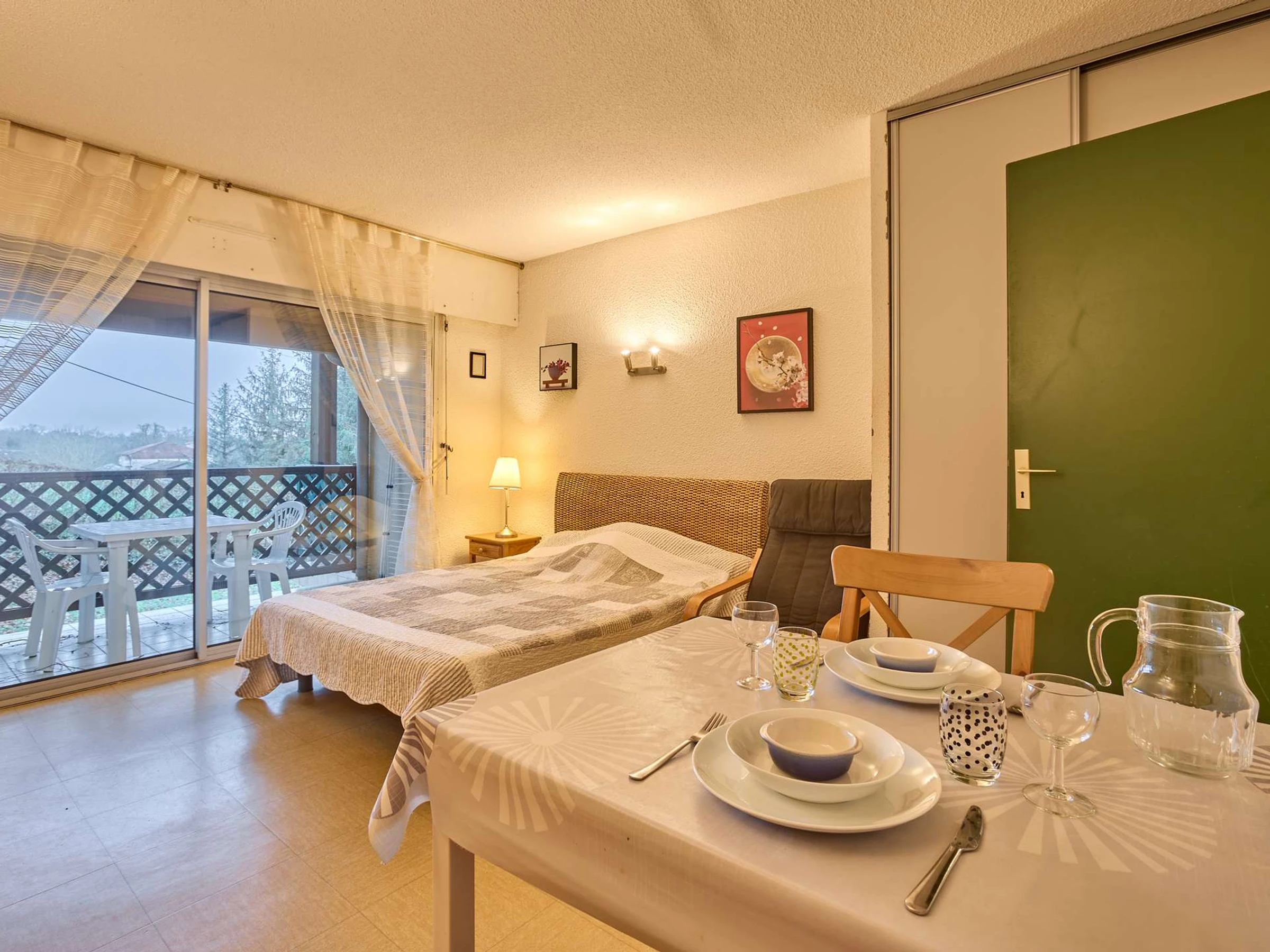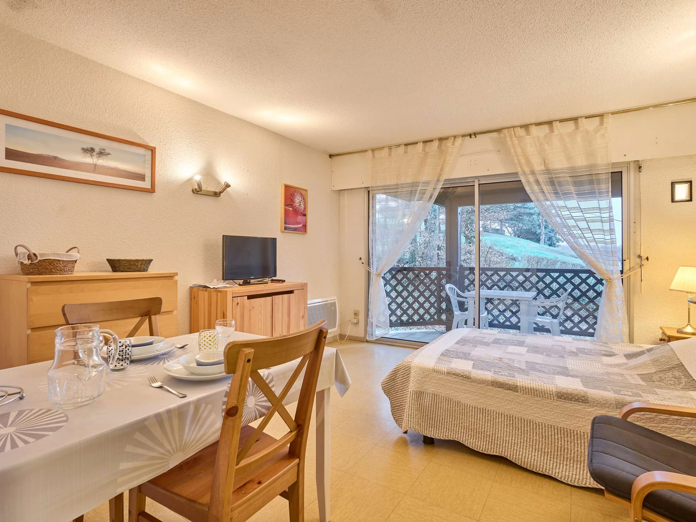 This T1 type apartment of 25m² on the 1st floor is bathed in light thanks to a large bay window that opens onto a south-facing balcony, equipped with a garden lounge for two people and a recliner. Its main room is furnished with a 140 bed, a charming table with two chairs, an armchair, and a TV. The separate kitchen offers all appliances (ceramic hobs, microwave, mini-oven, refrigerator,…) and a fixed opening. As well as its bathroom which includes a shower, a sink, a washing machine, and semi-separated toilets. Its clean and light decoration will invite you to relax.