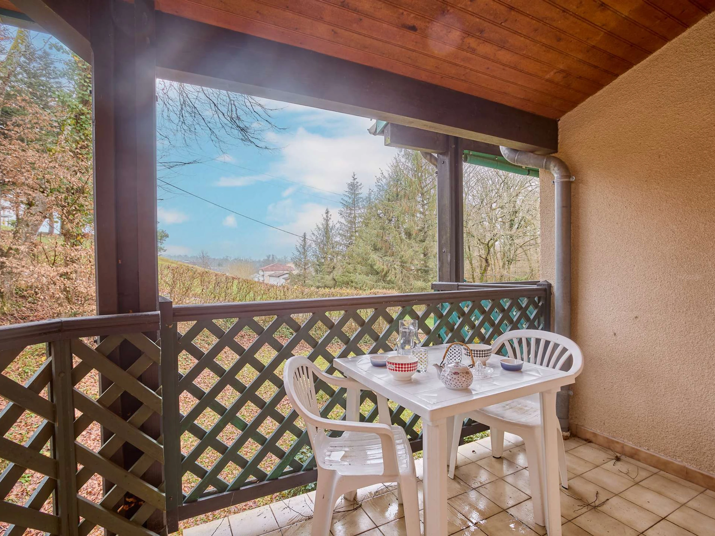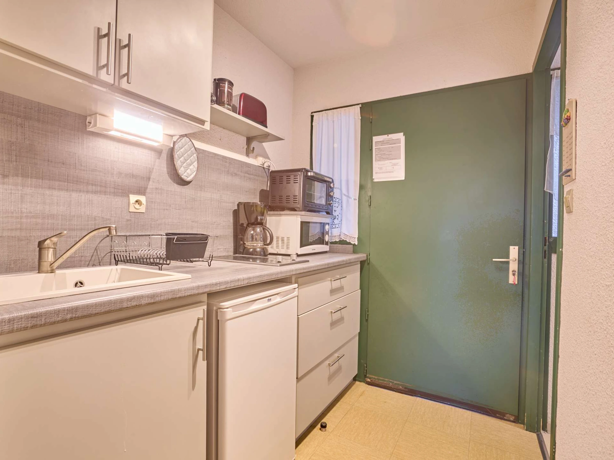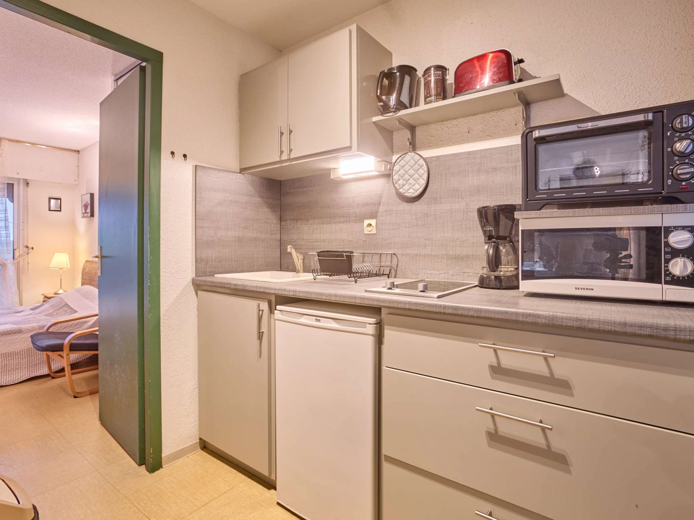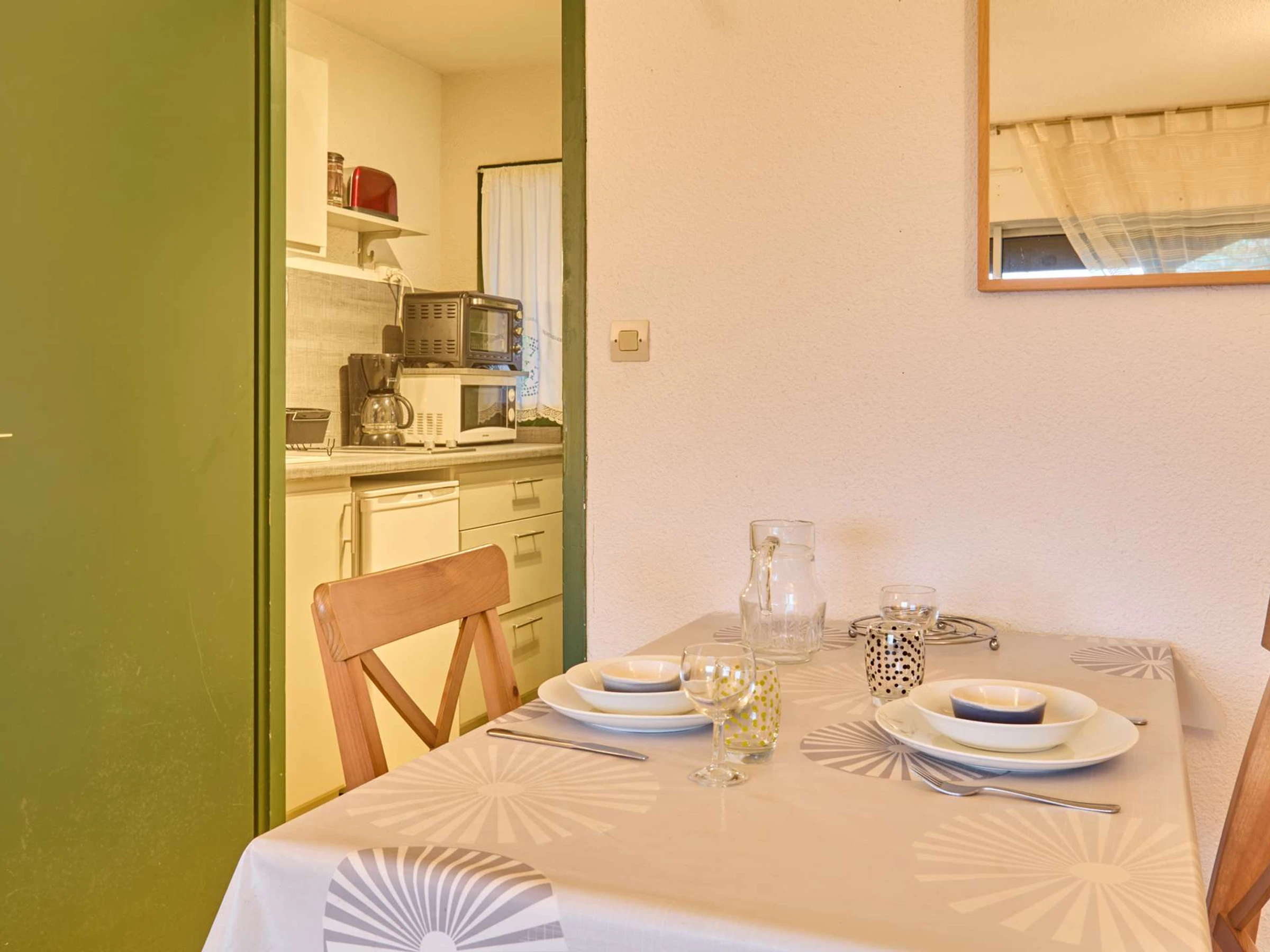 This T1 type apartment of 25m² on the 1st floor is bathed in light thanks to a large bay window that opens onto a south-facing balcony, equipped with a garden lounge for two people and a recliner. Its main room is furnished with a 140 bed, a charming table with two chairs, an armchair, and a TV. The separate kitchen offers all appliances (ceramic hobs, microwave, mini-oven, refrigerator,…) and a fixed opening. As well as its bathroom which includes a shower, a sink, a washing machine, and semi-separated toilets. Its clean and light decoration will invite you to relax.