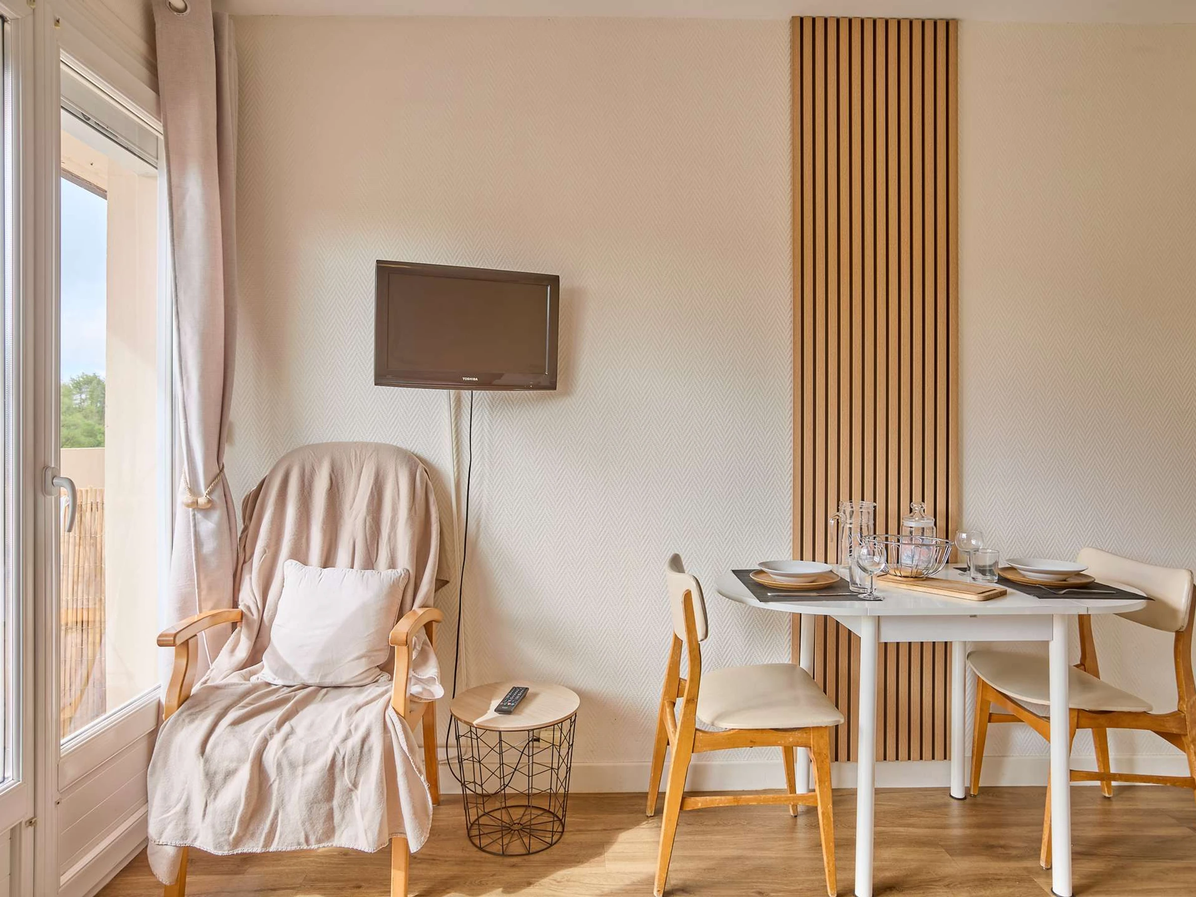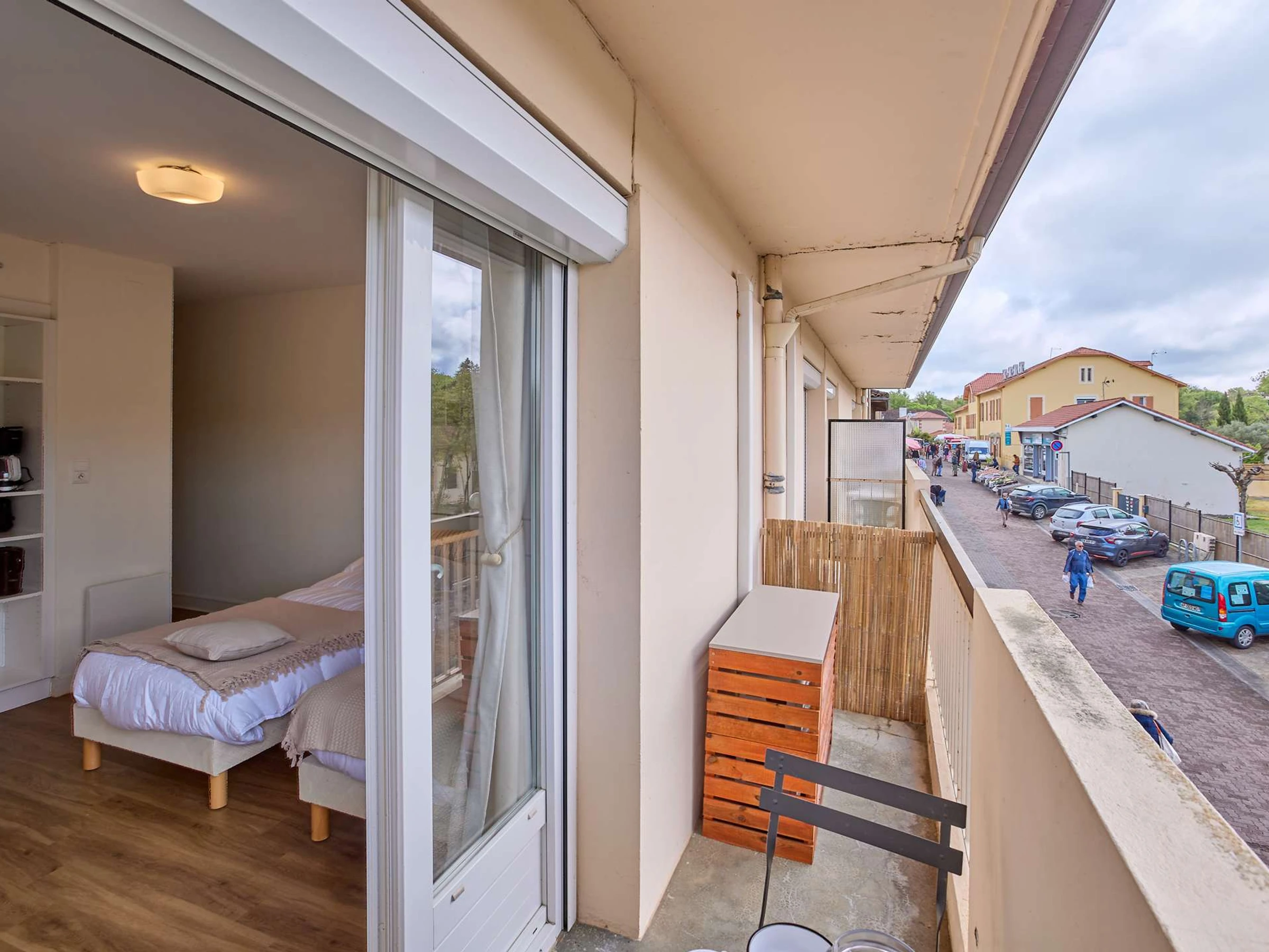 This bright and functional studio is ideal for a pleasant stay in the Gers region. This renovated, air-conditioned studio with a 22m² balcony is located on the 1st floor of the residence and faces south. It features two single beds, a television, a dining area, and a kitchen equipped with a mini-oven, microwave, electric stovetop, refrigerator, and a Senseo coffee maker. Its bathroom has a shower, vanity unit, and toilet.