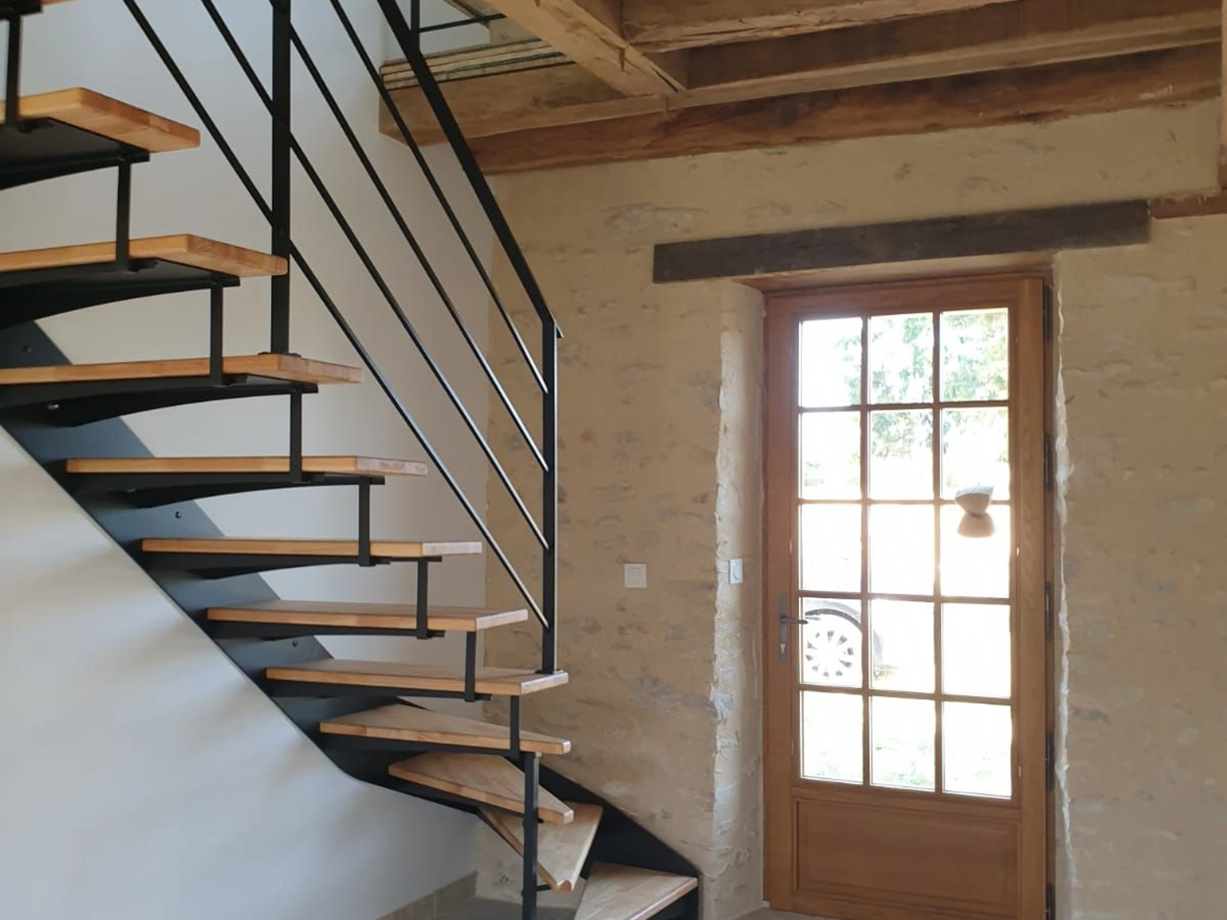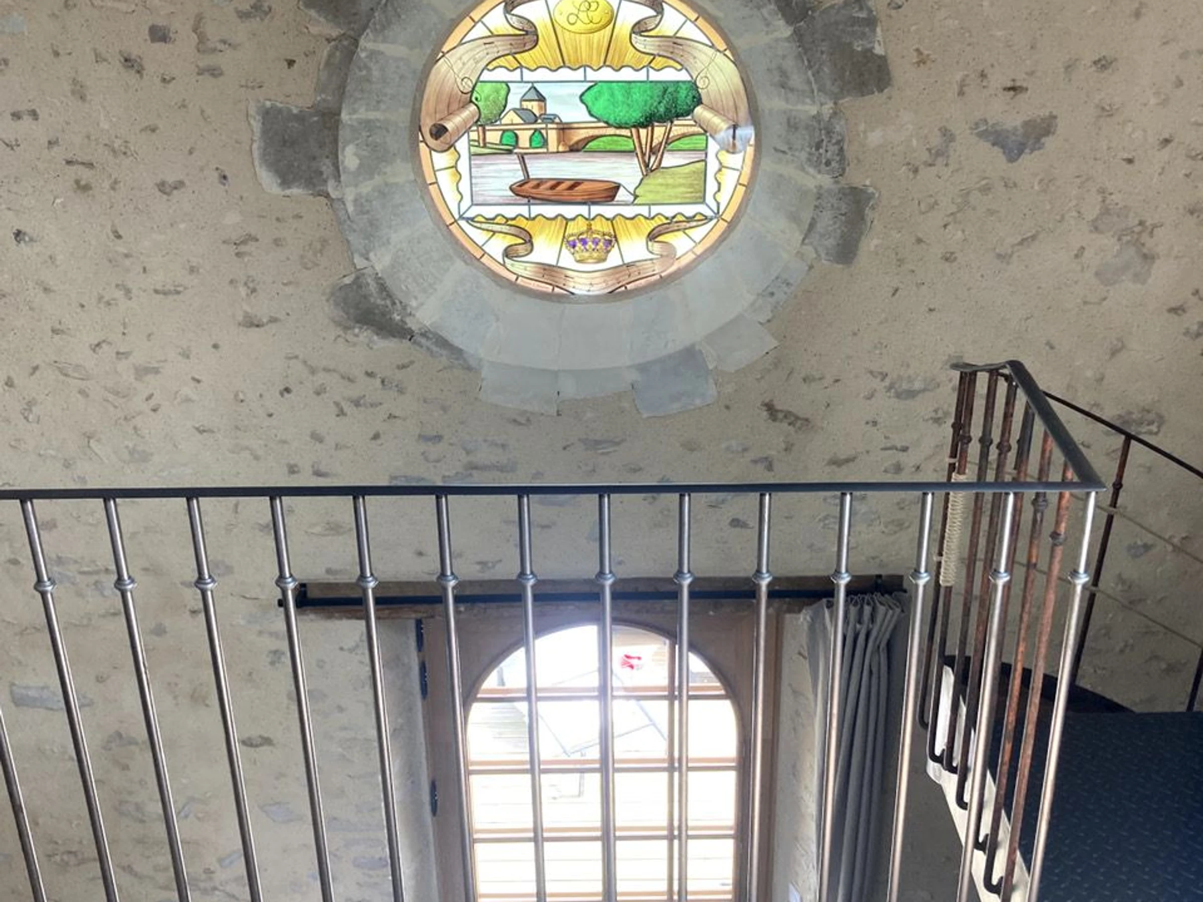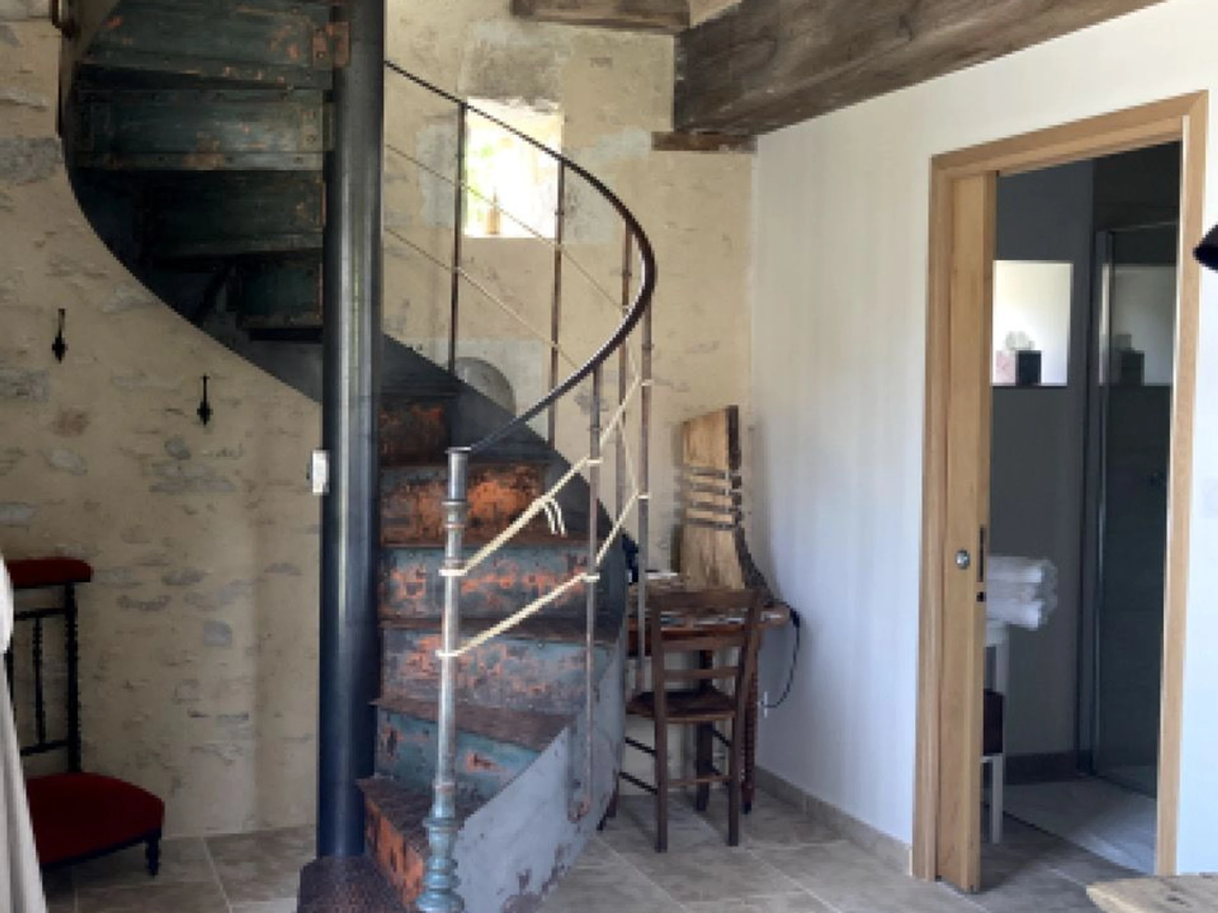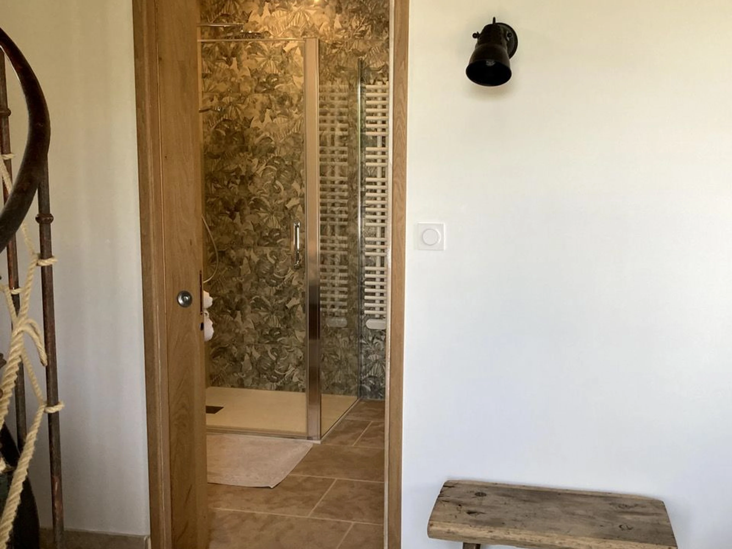 La Chapelle room for 4 people: on the ground floor, 1 double bed, and on the mezzanine, with a spiral staircase, 2 single beds, bathroom with a large walk-in shower, sink, and toilet. Room adapted for reduced mobility.