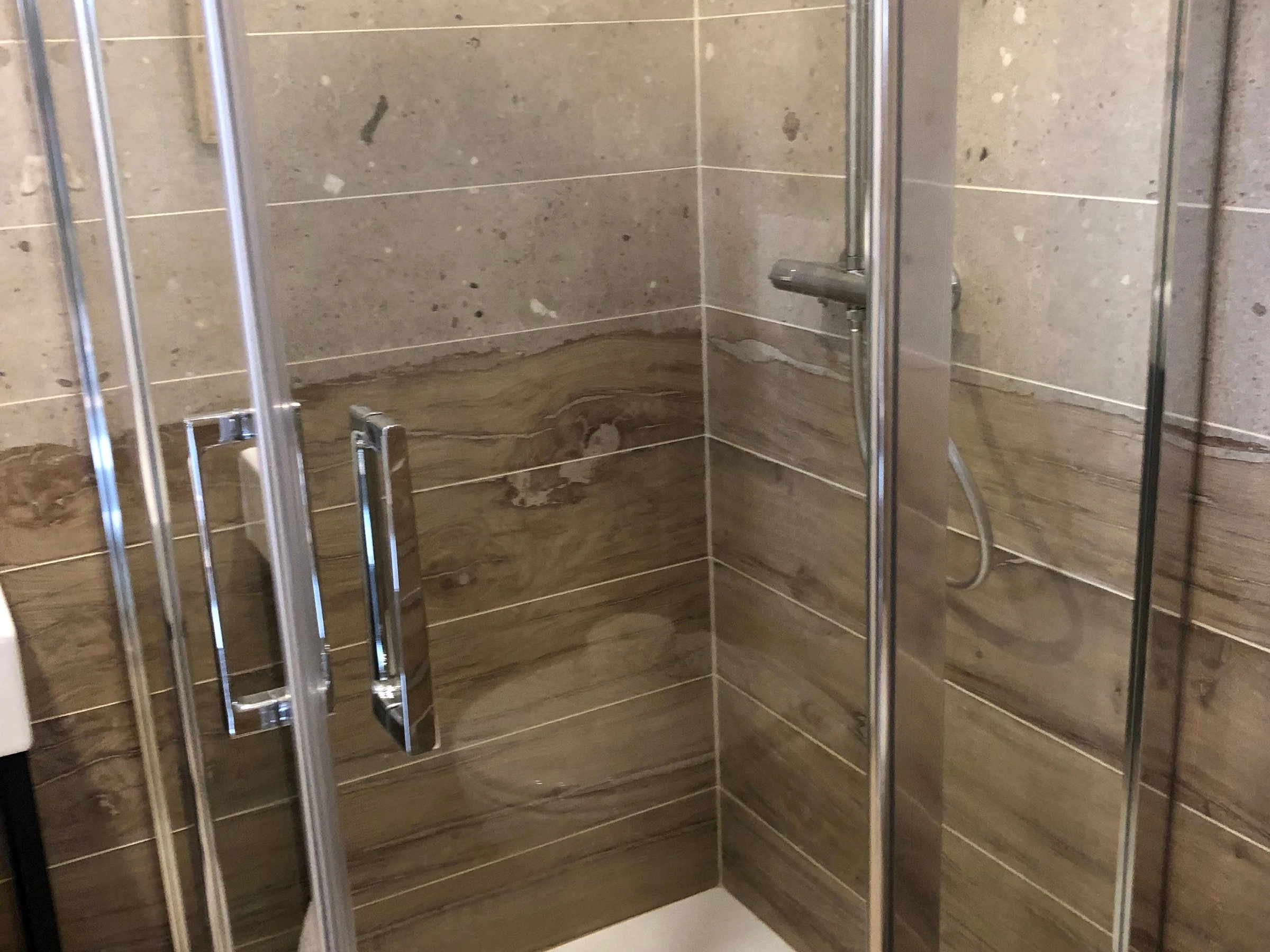 Sainfoin room for 4 people: on the ground floor, bathroom with shower, sink, and toilet. Upstairs, 1 large bedroom with 1 double bed and 1 small connecting room with 2 single beds.