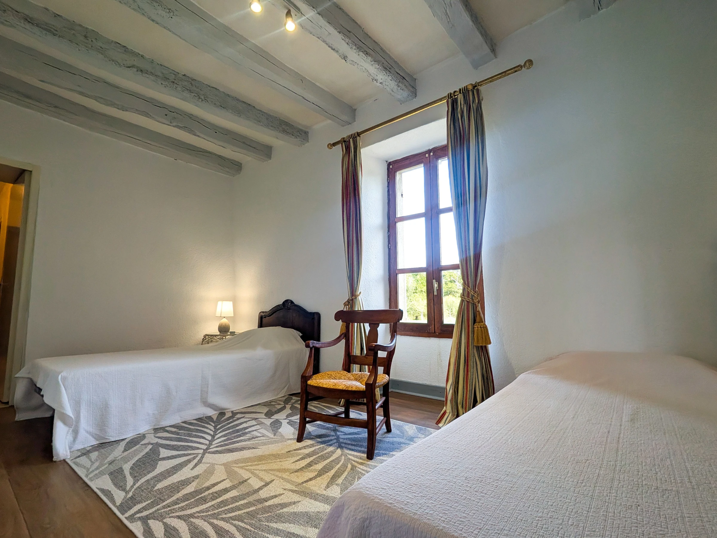 Above the kitchen, mezzanine (safety barrier to the stairs) with 2 single beds.