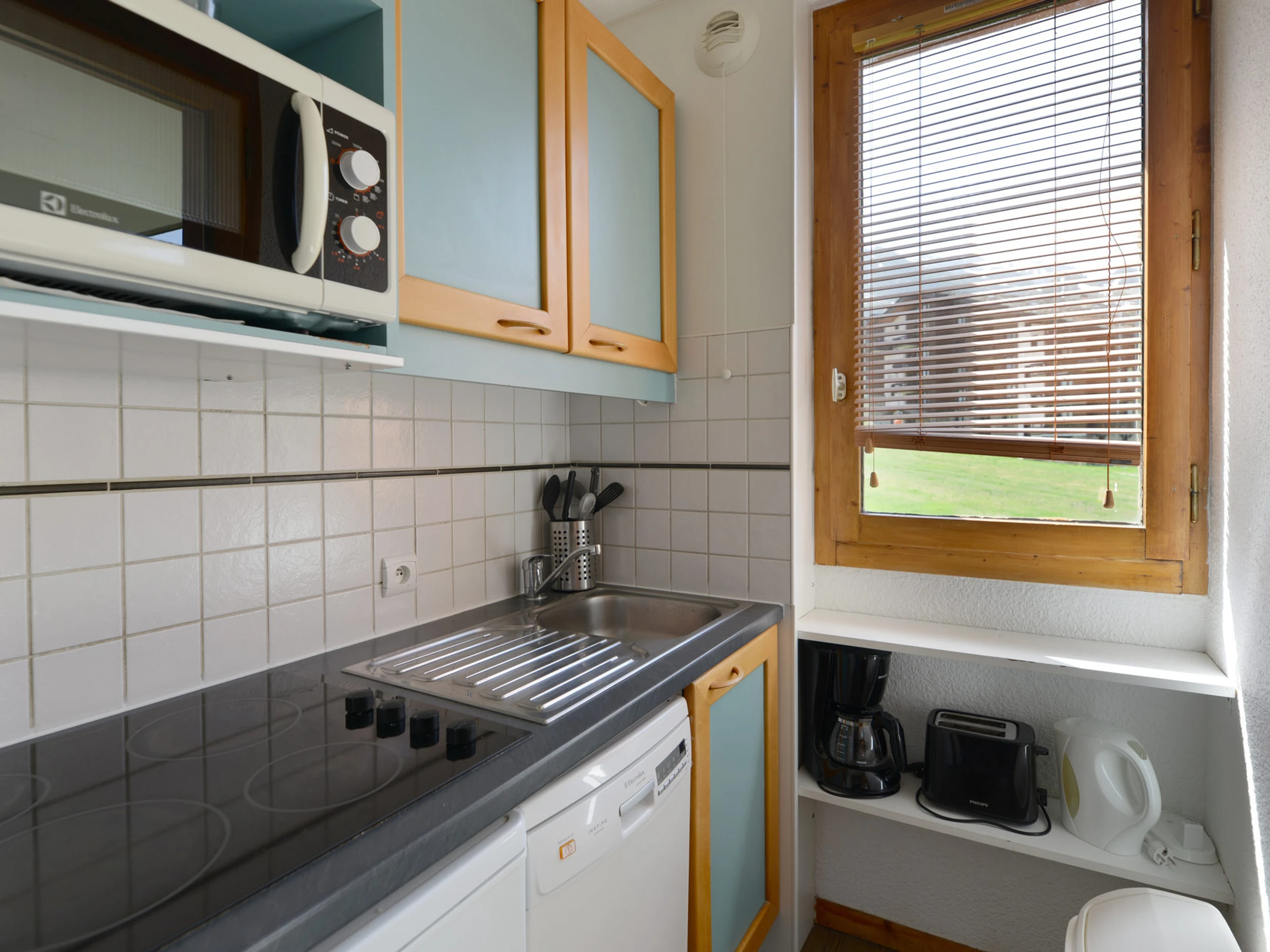 Separated kitchen : with a mixed microwave, ceramic hobs, a fridge and a dishwasher