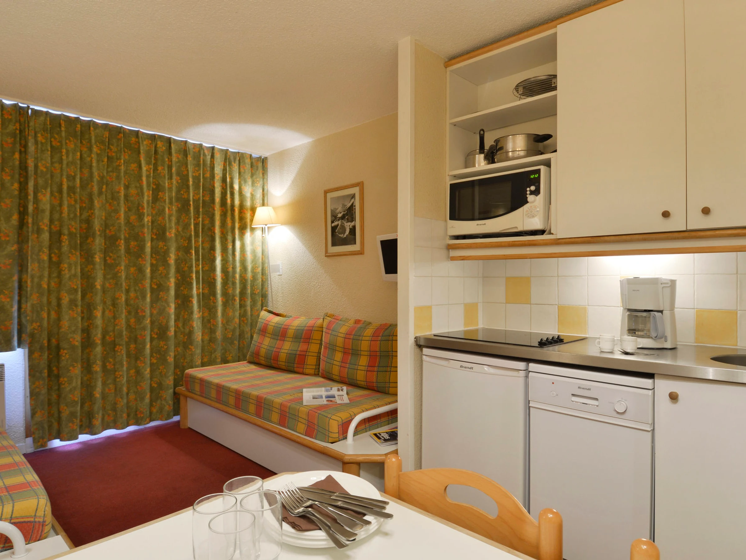 Open plan kitchen : with a mixed microwave, a fridge, 1 ceramic hob 4 fires and a dishwasher