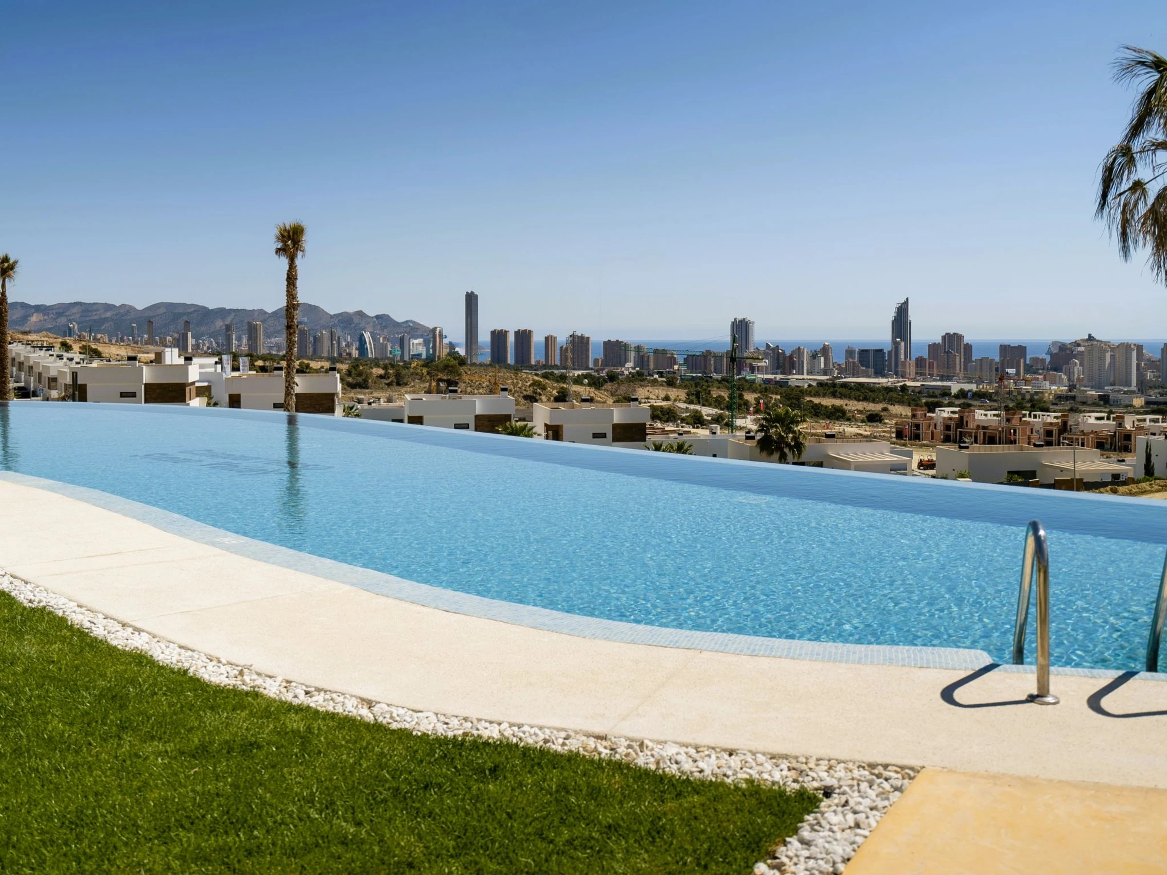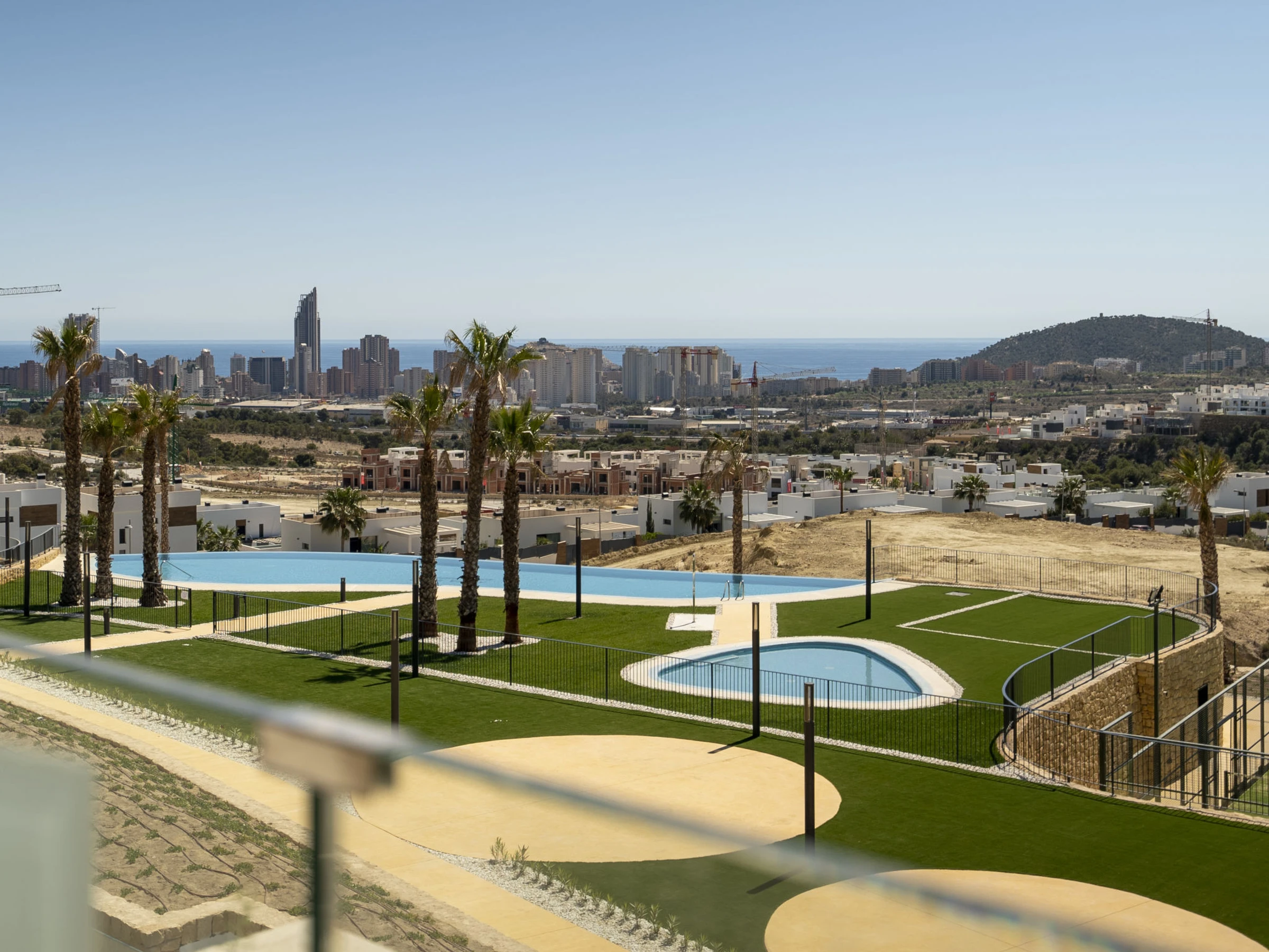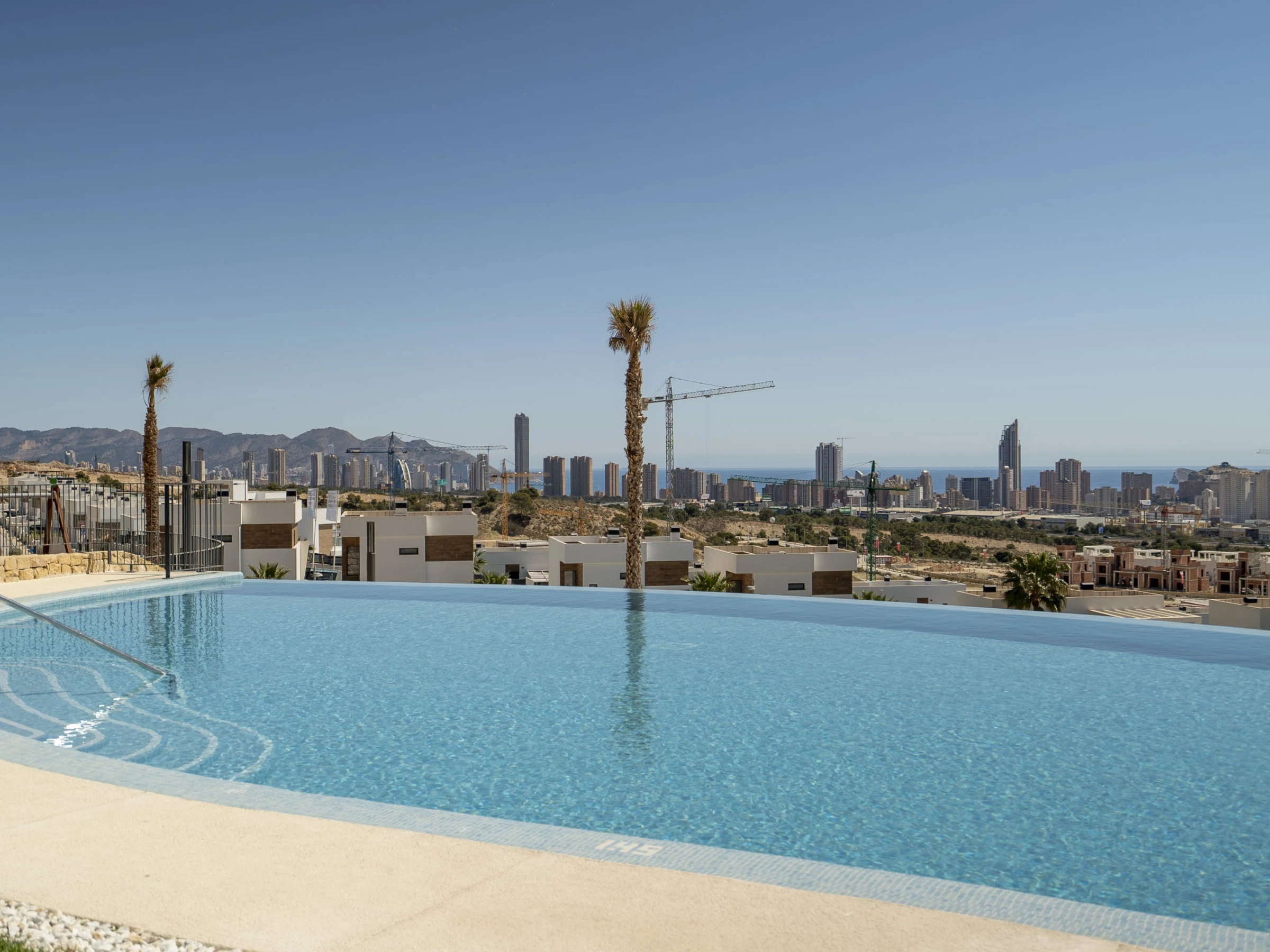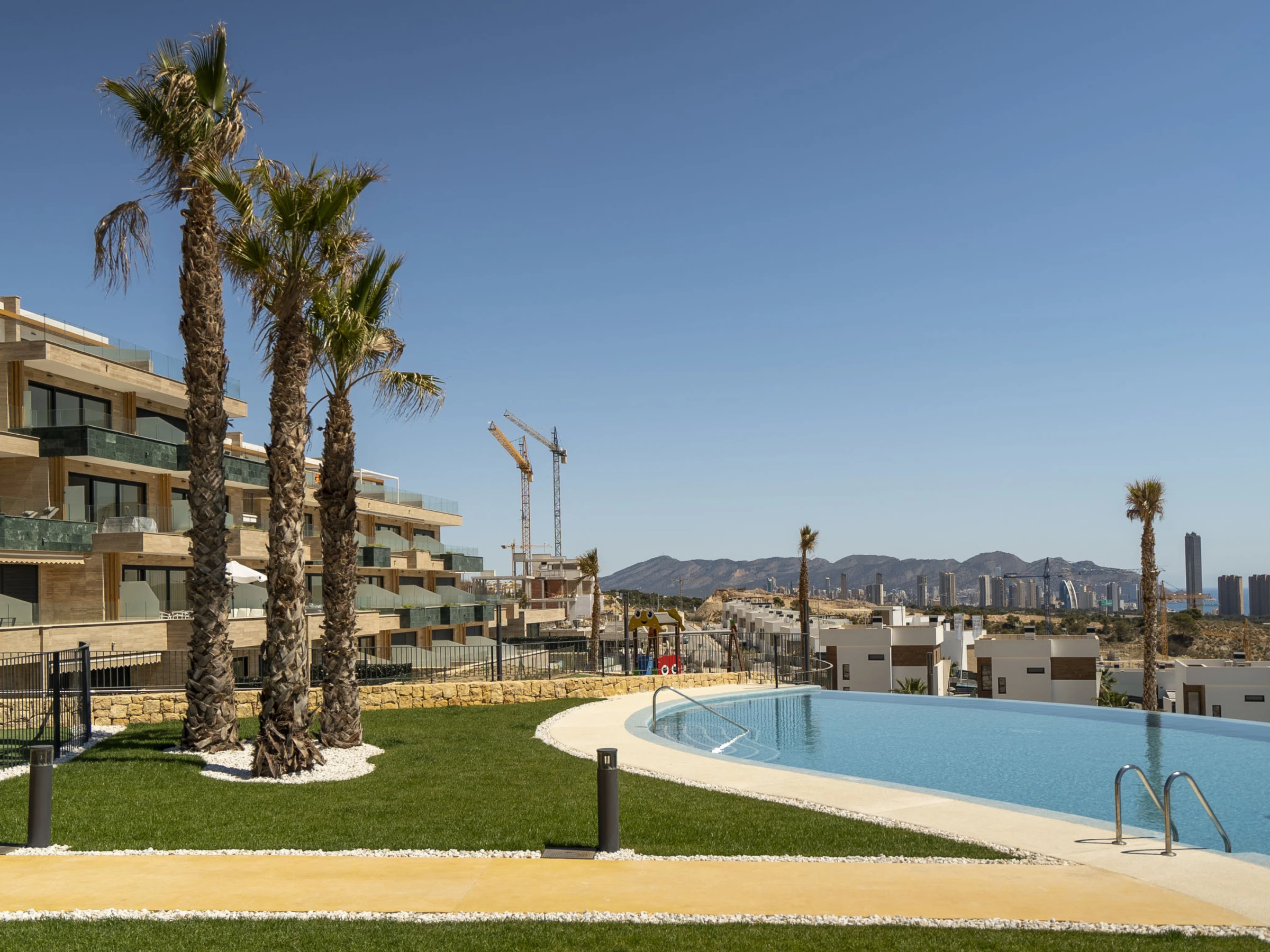 Casa Palmeras: Large, modern, comfortable apartment block "Casa Palmeras", built in 2022. On the outskirts, 6 km from the centre of Benidorm, outside the resort, 3 km from the centre of Finestrat, in a quiet, sunny position residential area (villas), traffic calmed area, 3 km from the sea, 3 km from the beach, south facing position. For shared use: property (fenced), terraced garden with lawn, swimming pool round (8 x 48 m, depth 1 - depth 45 cm, seasonal availability: [hidden] - [hidden] Shower/WC in the pool area, children's pool, patio, children's playground. In the house: lift. Roofed, parking. Supermarket 2 km, shopping centre 2 km, restaurant 2 km, bar 2 km, bus stop "Benidorm" 2 km, railway station "Benidorm" 2 km. Golf course (18 hole) 2 km, walking paths from the house 100 m. Nearby attractions: Aqualandia 13 km, Karting Finestrat 1 km, Terra Mitica 3 km, Terra Natura 4 km, Alicante 42 km, Aeropuerto Alicante 56 km. Please note: car recommended. The owner does not accept any youth groups. Neighbourhood highly sensitive to noise. Quietness and good behaviour expected. -Year of construction 2022, finalized 2023.- 3km from Finestrat, 10 km from Villajoyosa, nearby La Cala in Finestrat.-Outdoor pool is an Infinity Pool.-Accesss to the phase 2 with sauna, gym, indoor pool, paddle tennis court and playground.
