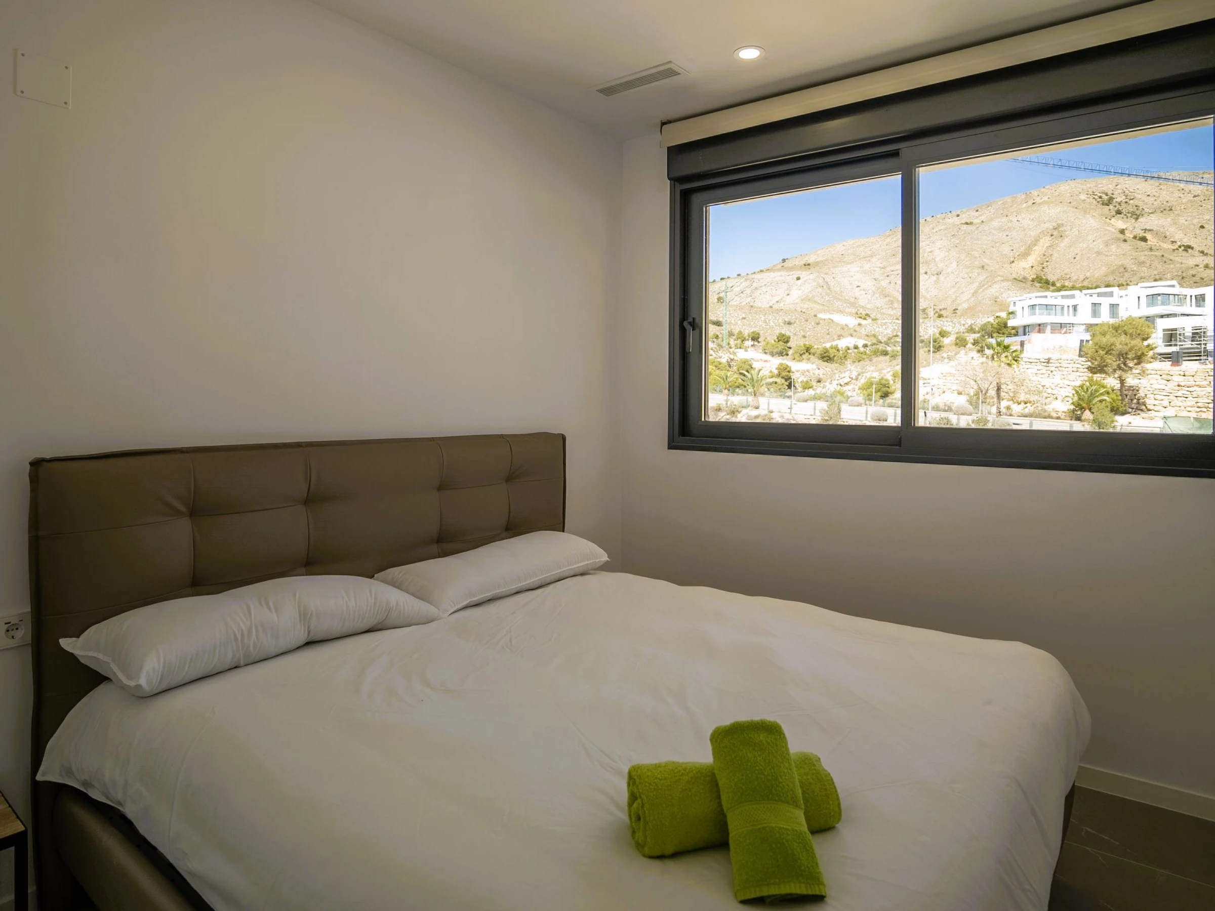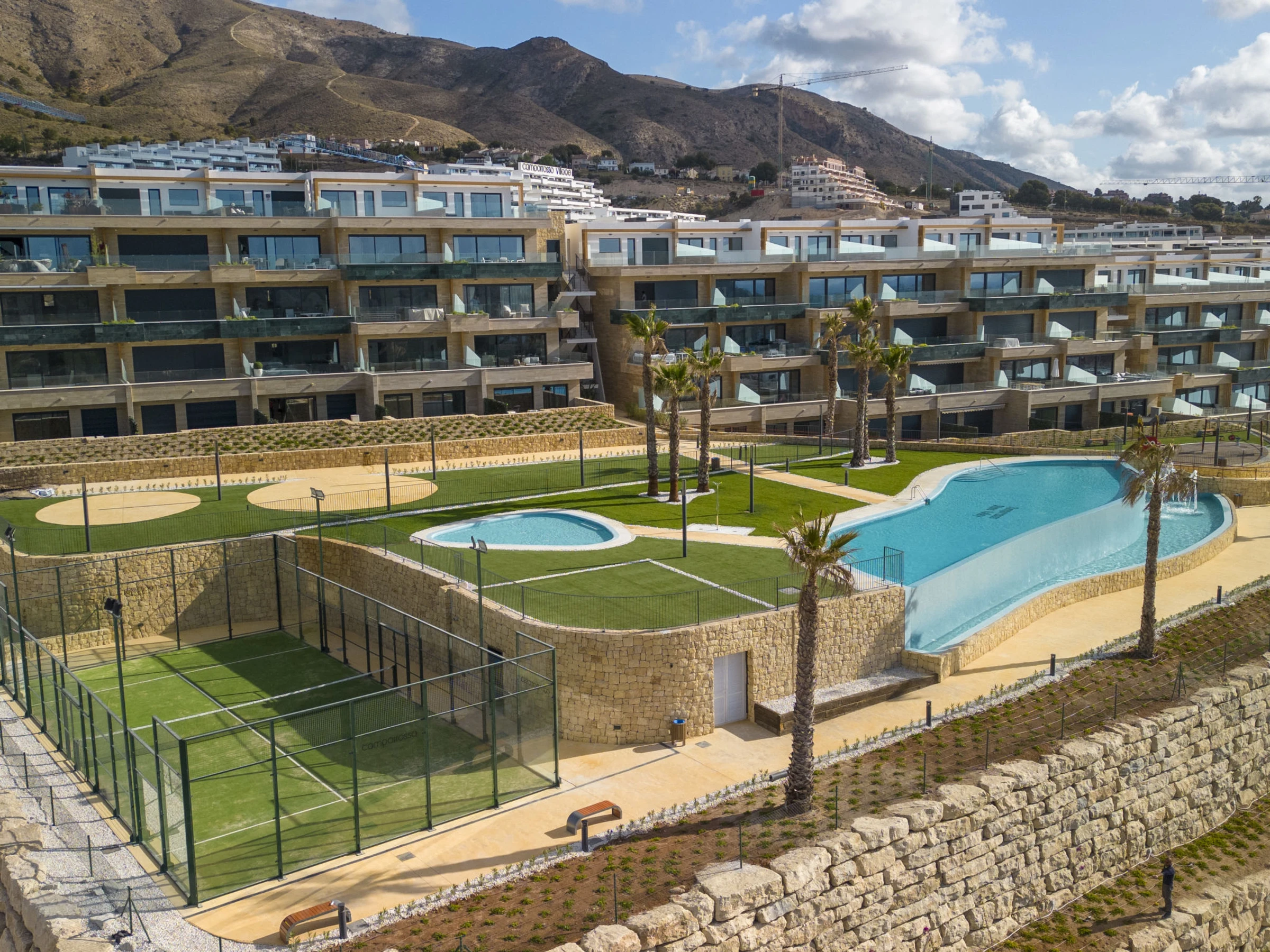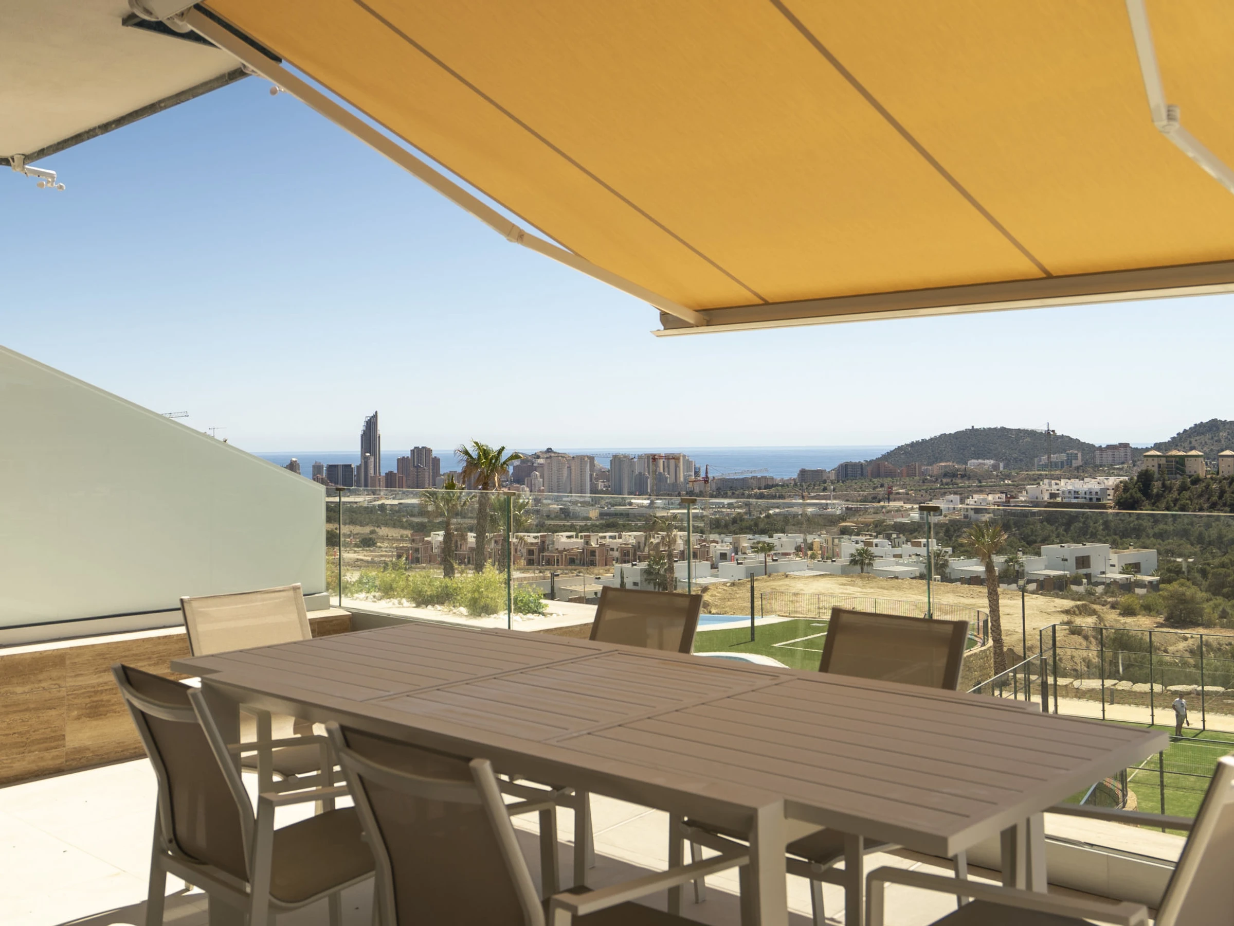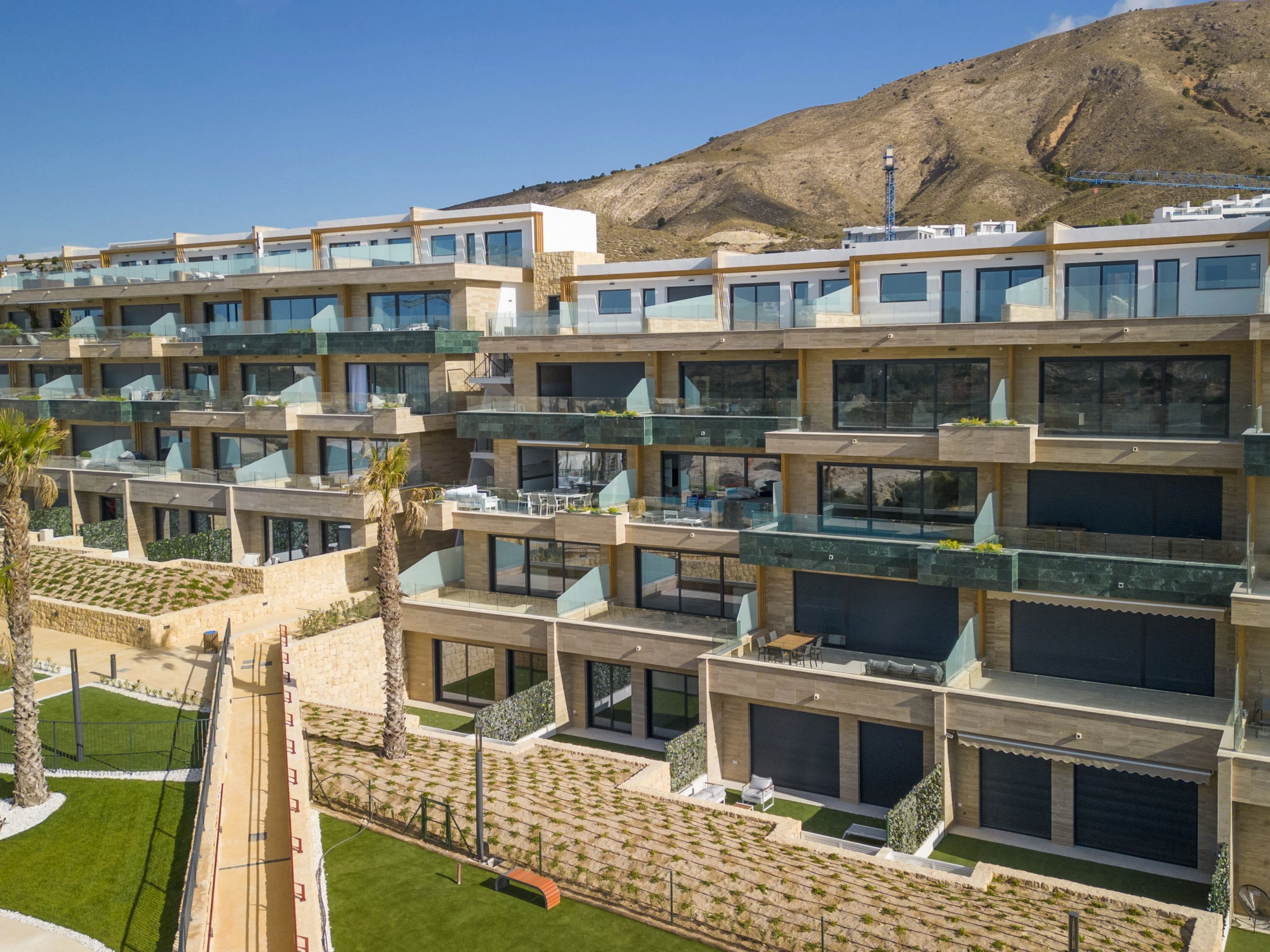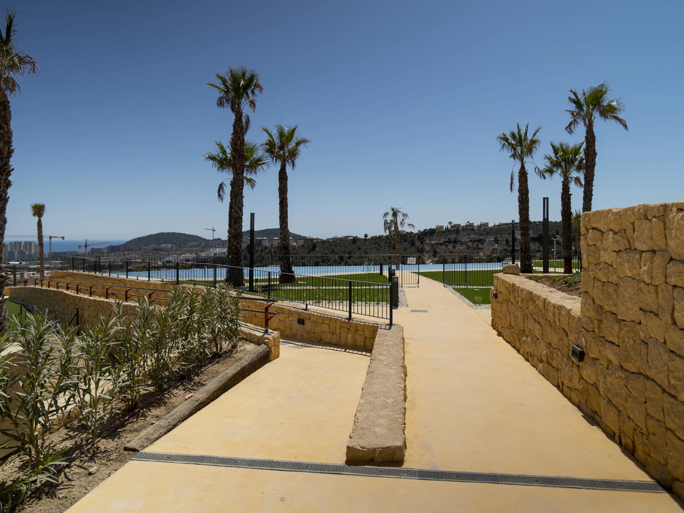 Casa Palmeras: Large, modern, comfortable apartment block "Casa Palmeras", built in 2022. On the outskirts, 6 km from the centre of Benidorm, outside the resort, 3 km from the centre of Finestrat, in a quiet, sunny position residential area (villas), traffic calmed area, 3 km from the sea, 3 km from the beach, south facing position. For shared use: property (fenced), terraced garden with lawn, swimming pool round (8 x 48 m, depth 1 - depth 45 cm, seasonal availability: [hidden] - [hidden] Shower/WC in the pool area, children's pool, patio, children's playground. In the house: lift. Roofed, parking. Supermarket 2 km, shopping centre 2 km, restaurant 2 km, bar 2 km, bus stop "Benidorm" 2 km, railway station "Benidorm" 2 km. Golf course (18 hole) 2 km, walking paths from the house 100 m. Nearby attractions: Aqualandia 13 km, Karting Finestrat 1 km, Terra Mitica 3 km, Terra Natura 4 km, Alicante 42 km, Aeropuerto Alicante 56 km. Please note: car recommended. The owner does not accept any youth groups. Neighbourhood highly sensitive to noise. Quietness and good behaviour expected. -Year of construction 2022, finalized 2023.- 3km from Finestrat, 10 km from Villajoyosa, nearby La Cala in Finestrat.-Outdoor pool is an Infinity Pool.-Accesss to the phase 2 with sauna, gym, indoor pool, paddle tennis court and playground.