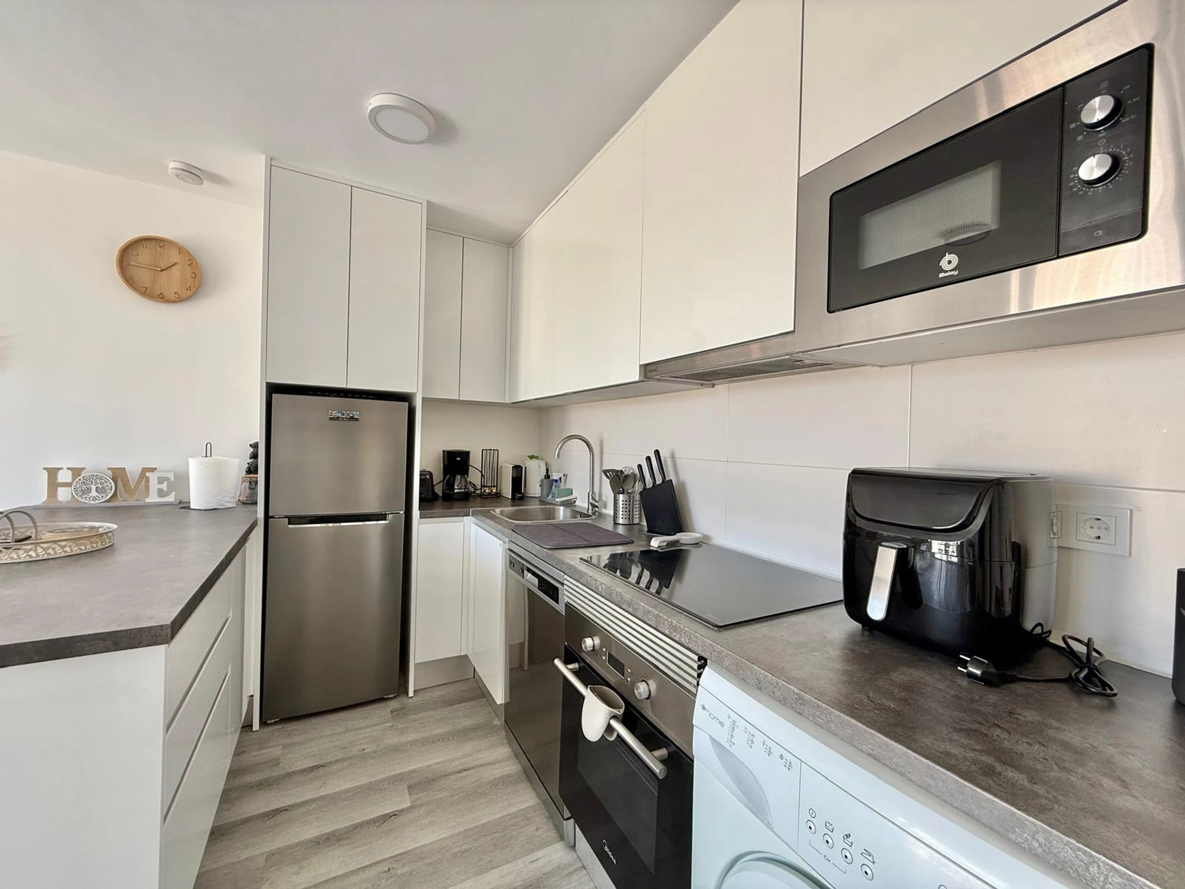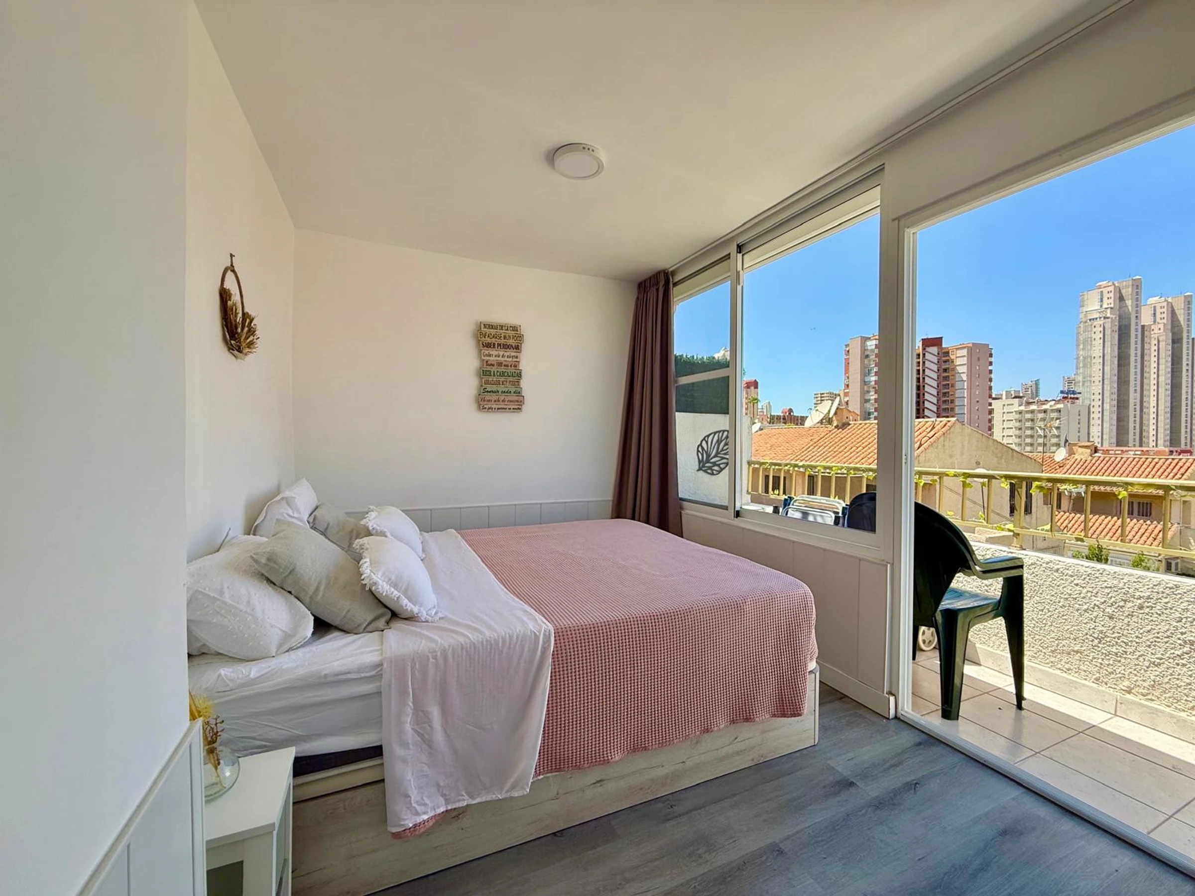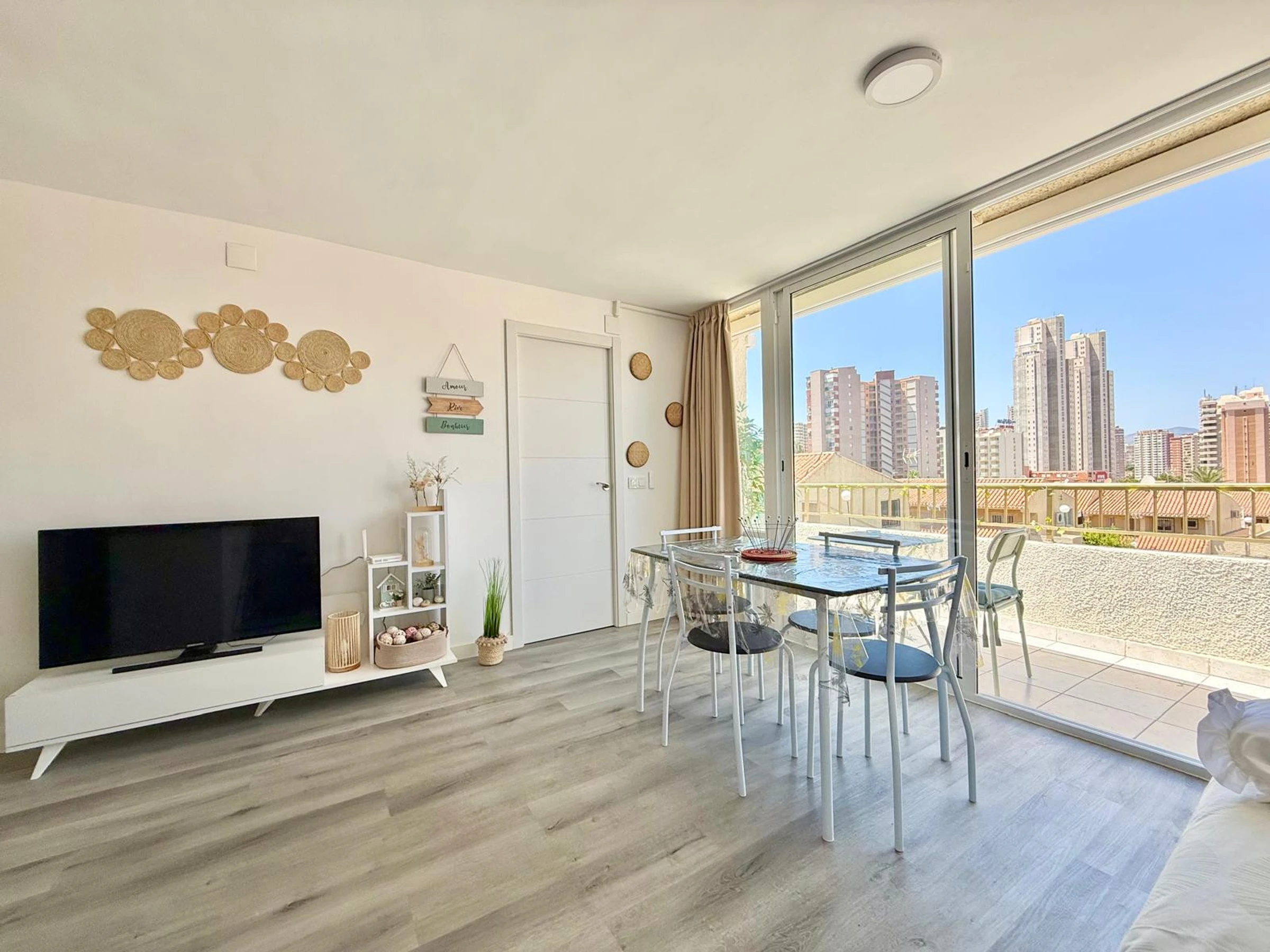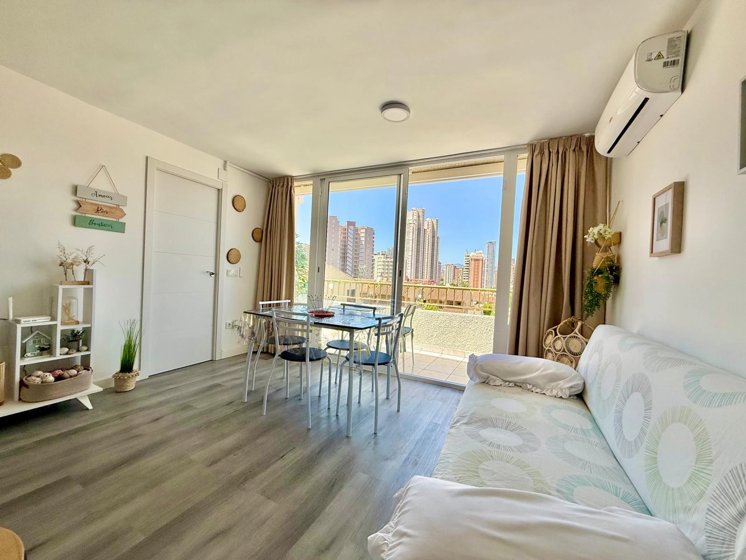 Apartment in Benidorm with 2 bedrooms and capacity for 5 people. Comfortable and modern 50m2 accommodation with garden views and a 10m2 terrace. It is located in a residential complex and ideal for a family. Located less than 10 minutes walk from Levante Beach and 2 minutes walk from a supermarket. It has a type of teleworking, a washing machine, an iron, Wi-Fi internet access, a hairdryer, a television, and reversible air conditioning. You will find the communal swimming pool and parking in the residence. The open-plan kitchen with induction hob is equipped with a refrigerator/freezer, microwave, oven, AirFryer, dishes/cutlery, kitchen utensils, coffee maker (classic and Nespresso), toaster, and kettle.