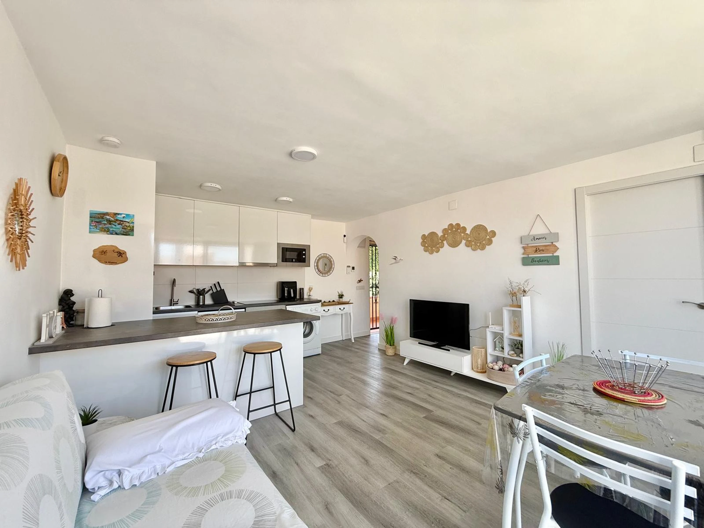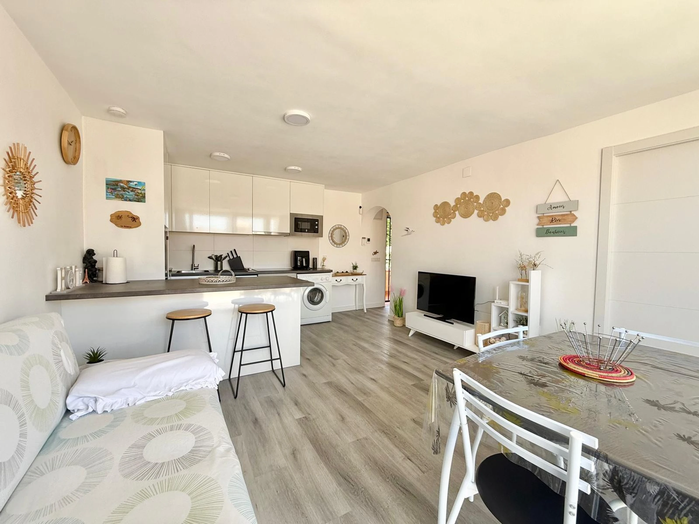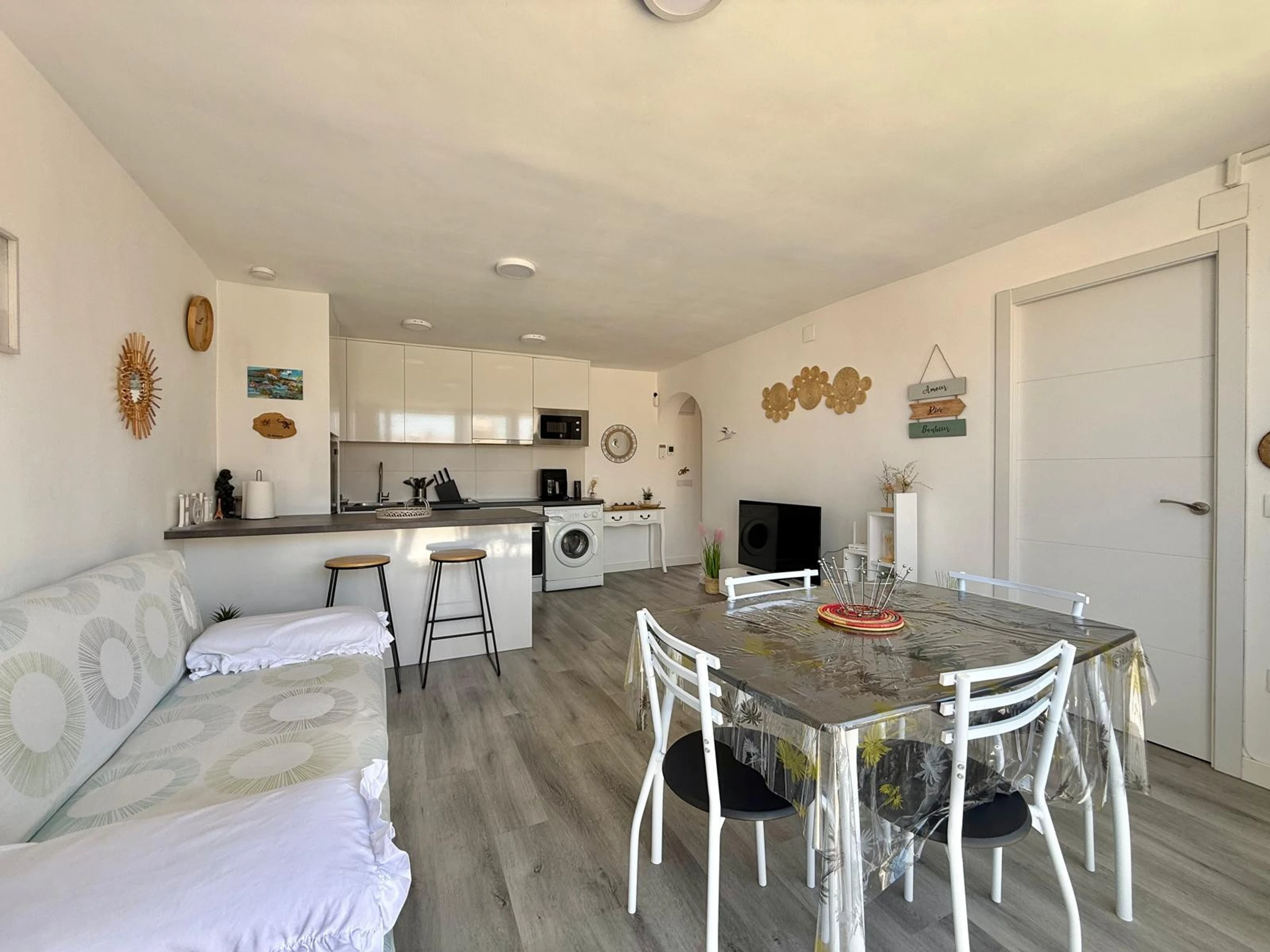 Apartment in Benidorm with 2 bedrooms and capacity for 5 people. Comfortable and modern 50m2 accommodation with garden views and a 10m2 terrace. It is located in a residential complex and ideal for a family. Located less than 10 minutes walk from Levante Beach and 2 minutes walk from a supermarket. It has a type of teleworking, a washing machine, an iron, Wi-Fi internet access, a hairdryer, a television, and reversible air conditioning. You will find the communal swimming pool and parking in the residence. The open-plan kitchen with induction hob is equipped with a refrigerator/freezer, microwave, oven, AirFryer, dishes/cutlery, kitchen utensils, coffee maker (classic and Nespresso), toaster, and kettle.