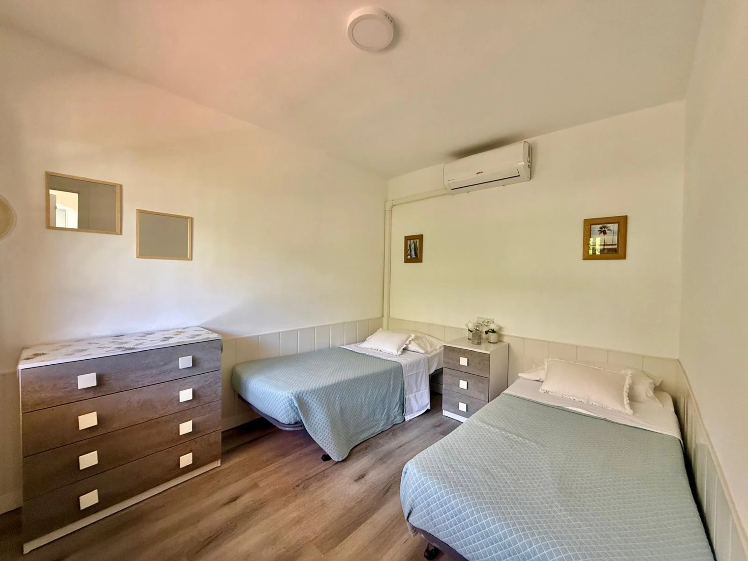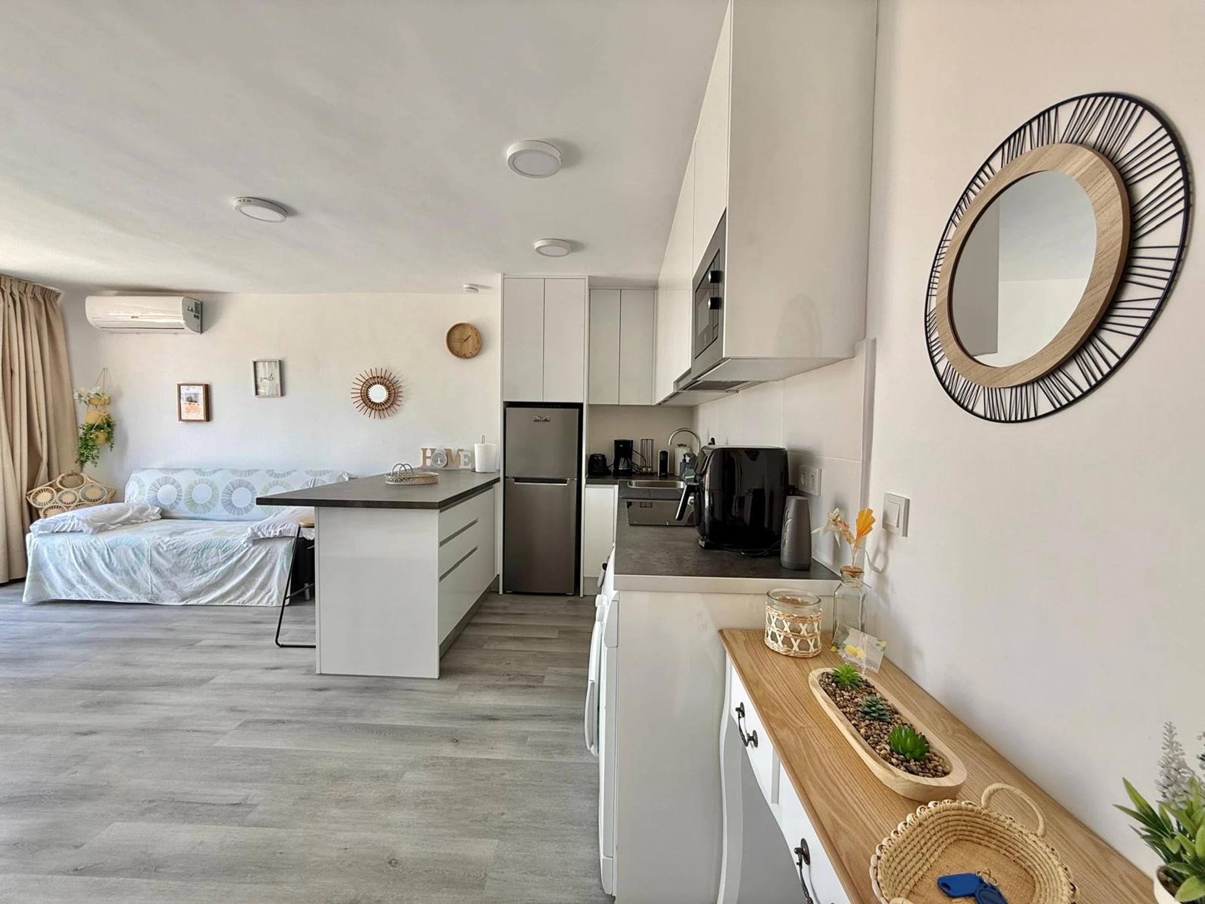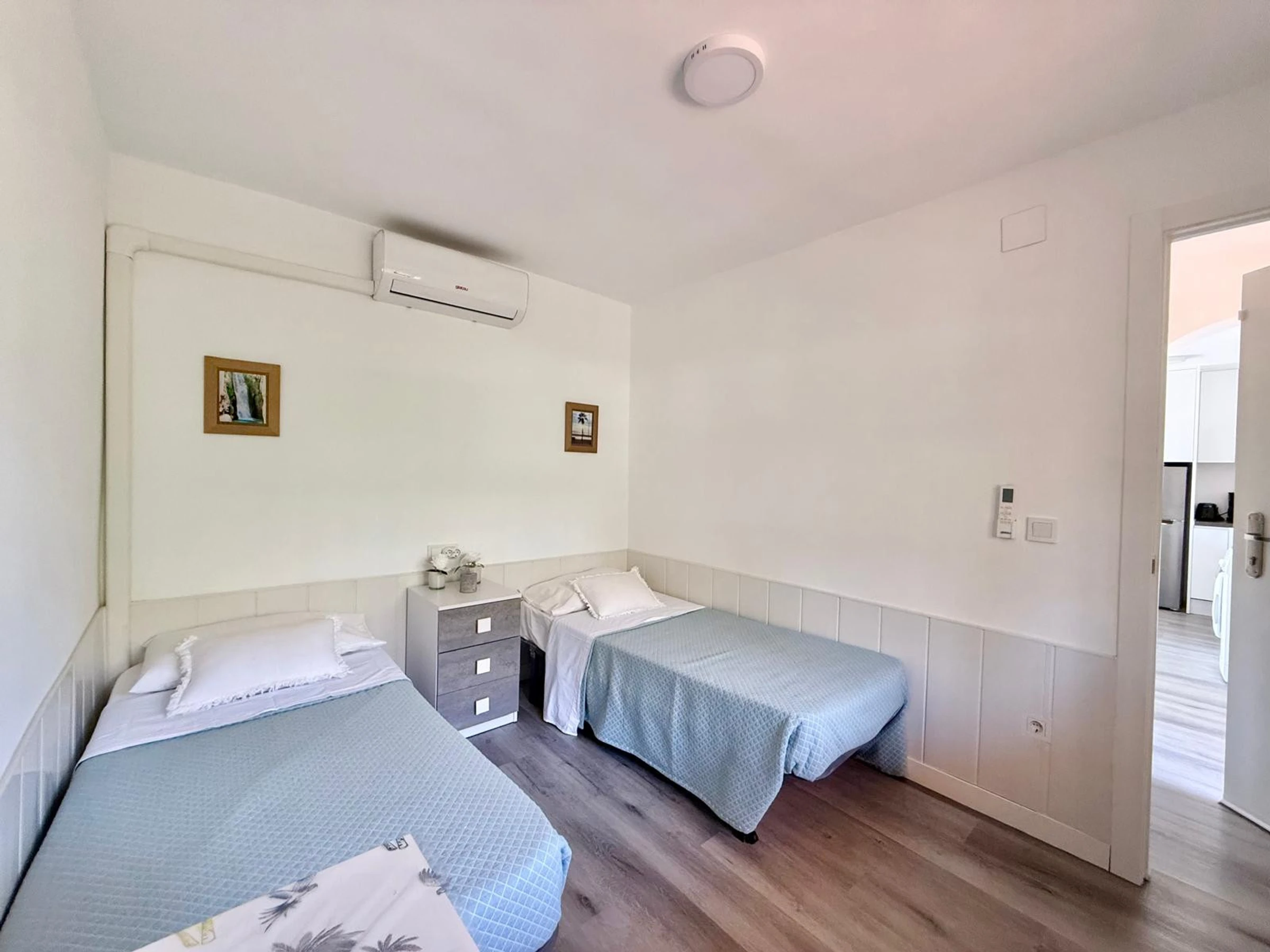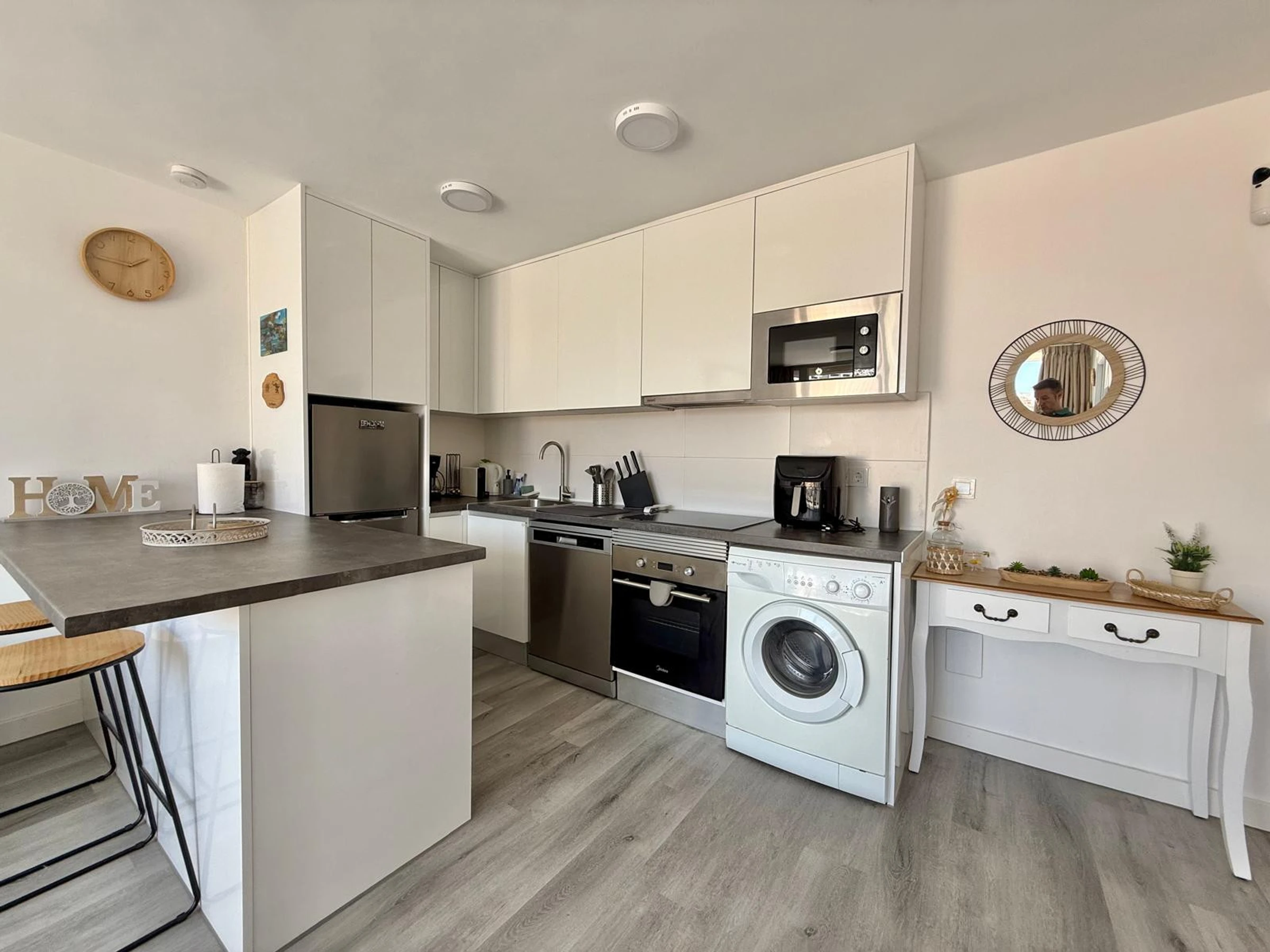 Apartment in Benidorm with 2 bedrooms and capacity for 5 people. Comfortable and modern 50m2 accommodation with garden views and a 10m2 terrace. It is located in a residential complex and ideal for a family. Located less than 10 minutes walk from Levante Beach and 2 minutes walk from a supermarket. It has a type of teleworking, a washing machine, an iron, Wi-Fi internet access, a hairdryer, a television, and reversible air conditioning. You will find the communal swimming pool and parking in the residence. The open-plan kitchen with induction hob is equipped with a refrigerator/freezer, microwave, oven, AirFryer, dishes/cutlery, kitchen utensils, coffee maker (classic and Nespresso), toaster, and kettle.