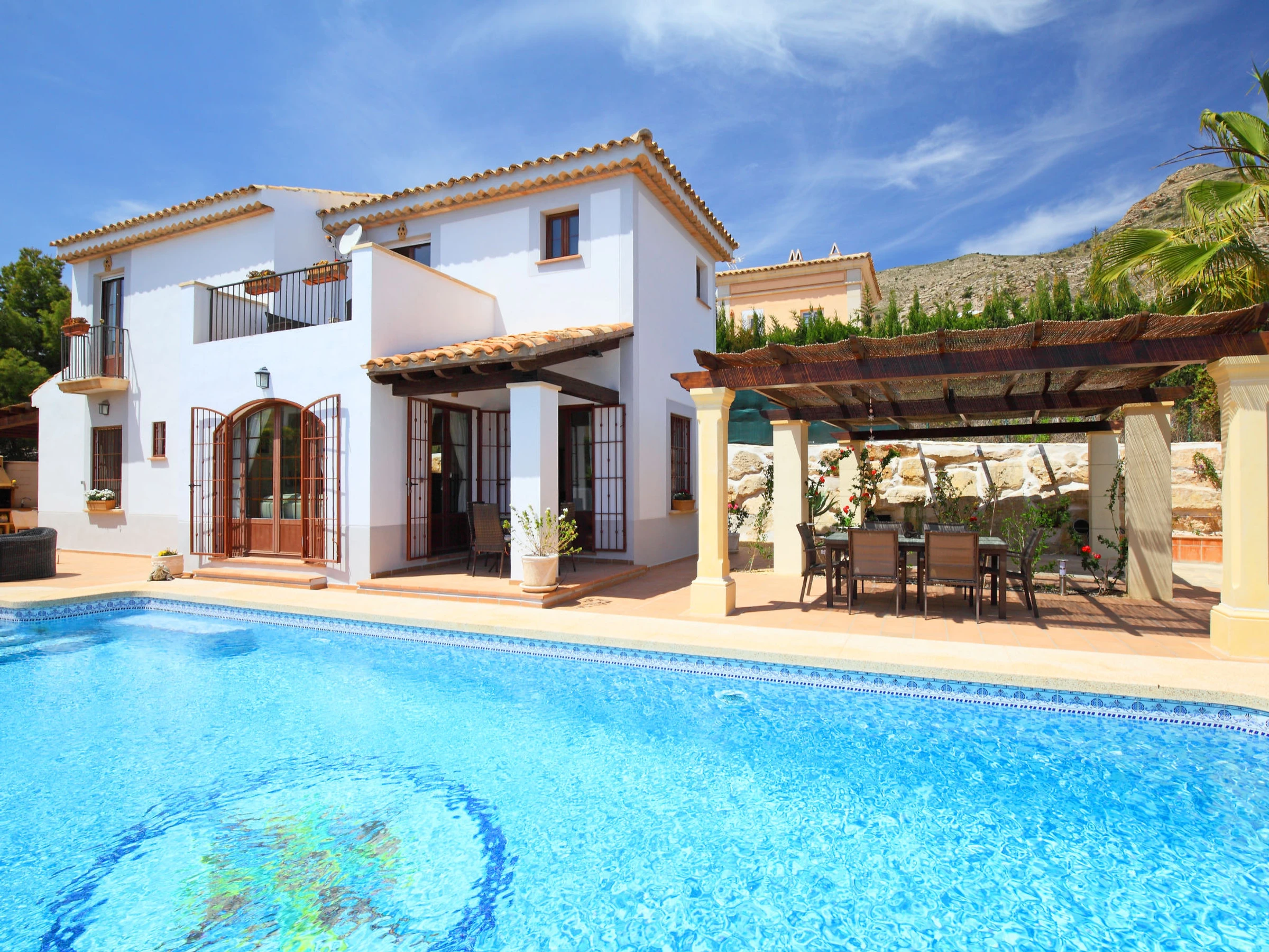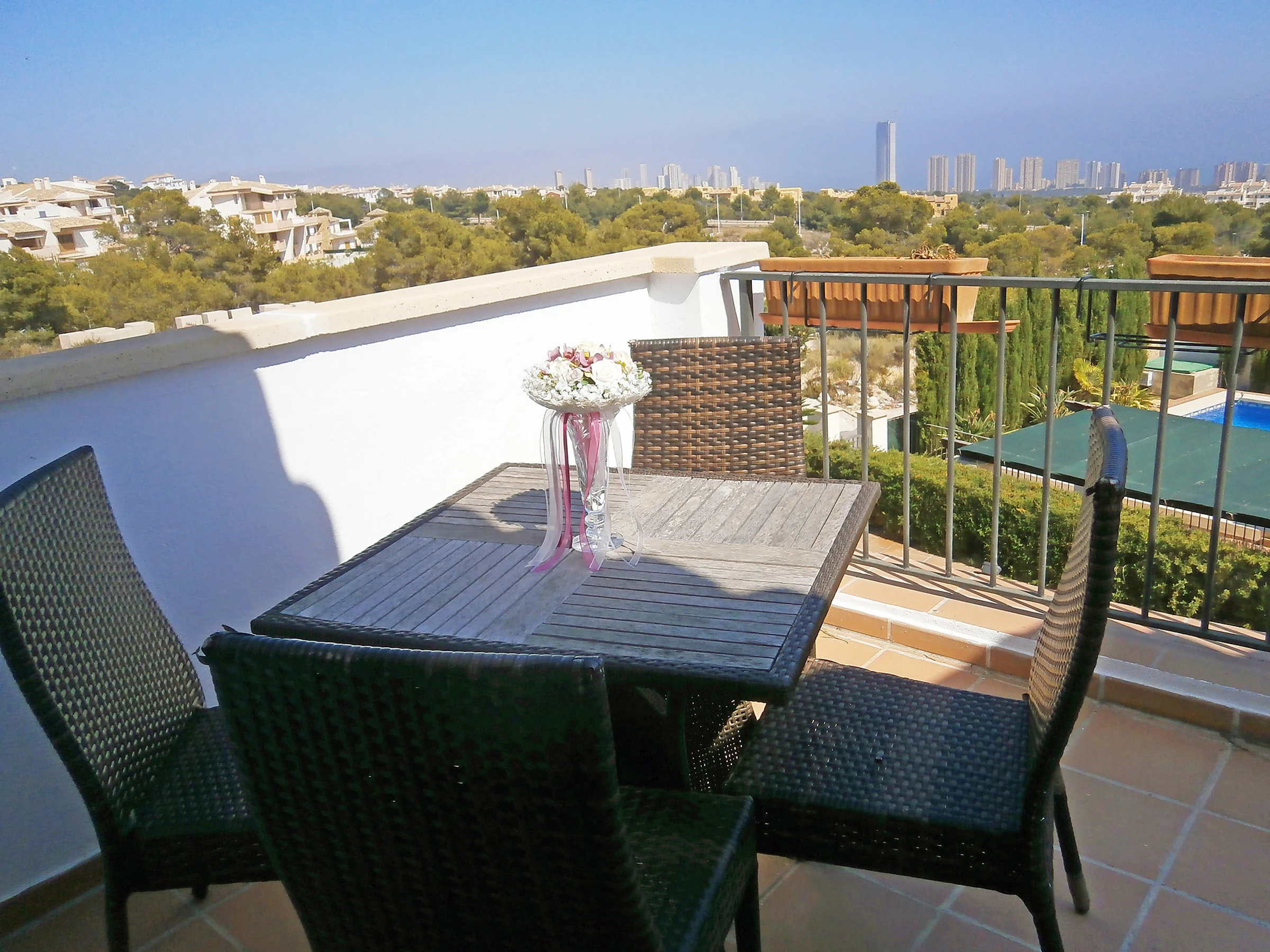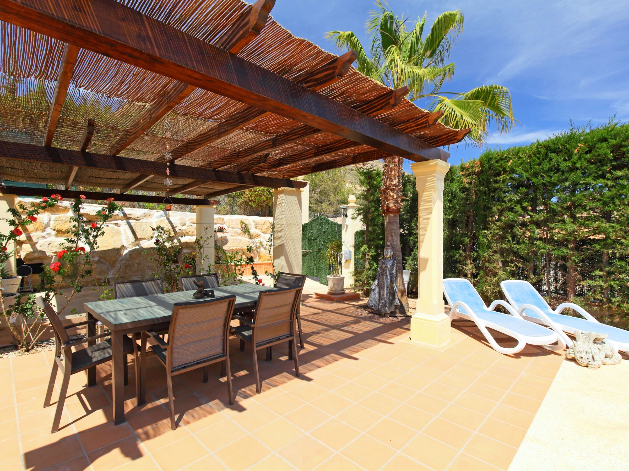 Sierra Cortina 2 km from Terra Mitica: Very large, modern, comfortable house "Copenhague", 2 storeys. On the outskirts, 4 km from the centre of Benidorm, in the district Terra Mitica, in a quiet, sunny position residential area (villas), 4 km from the sea, 4 km from the beach, on the golf course. Private: property (fenced), beautiful garden to relax, swimming pool angular (5 x 10 m, 01.01.-31.12.) with internal staircase and salt-electrolysis pool-cleaning system. Outdoor shower, garden furniture, barbecue, parking on the premises. Supermarket 3 km, restaurant 3 km, bar 3 km, railway station "Benidorm" 4 km, sandy beach "Playa Poniente Benidorm" 4 km. Golf course (18 hole) 800 m, walking paths from the house 100 m. Nearby attractions: Terra Mitica 2 km, Terra Natura 2 km, Aqualandia 5 km, Mundomar 5 km, Altea 8 km, Alicante 40 km. Please note: car recommended. Baby equipment on request. The owner does not accept any youth groups. Neighbourhood highly sensitive to noise. Quietness and good behaviour expected.