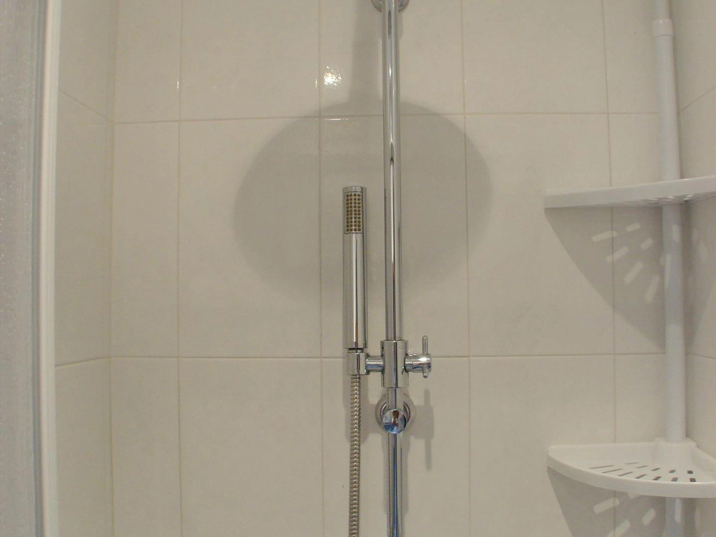 * bathroom with single washbasin, shower, toilet and hairdryer