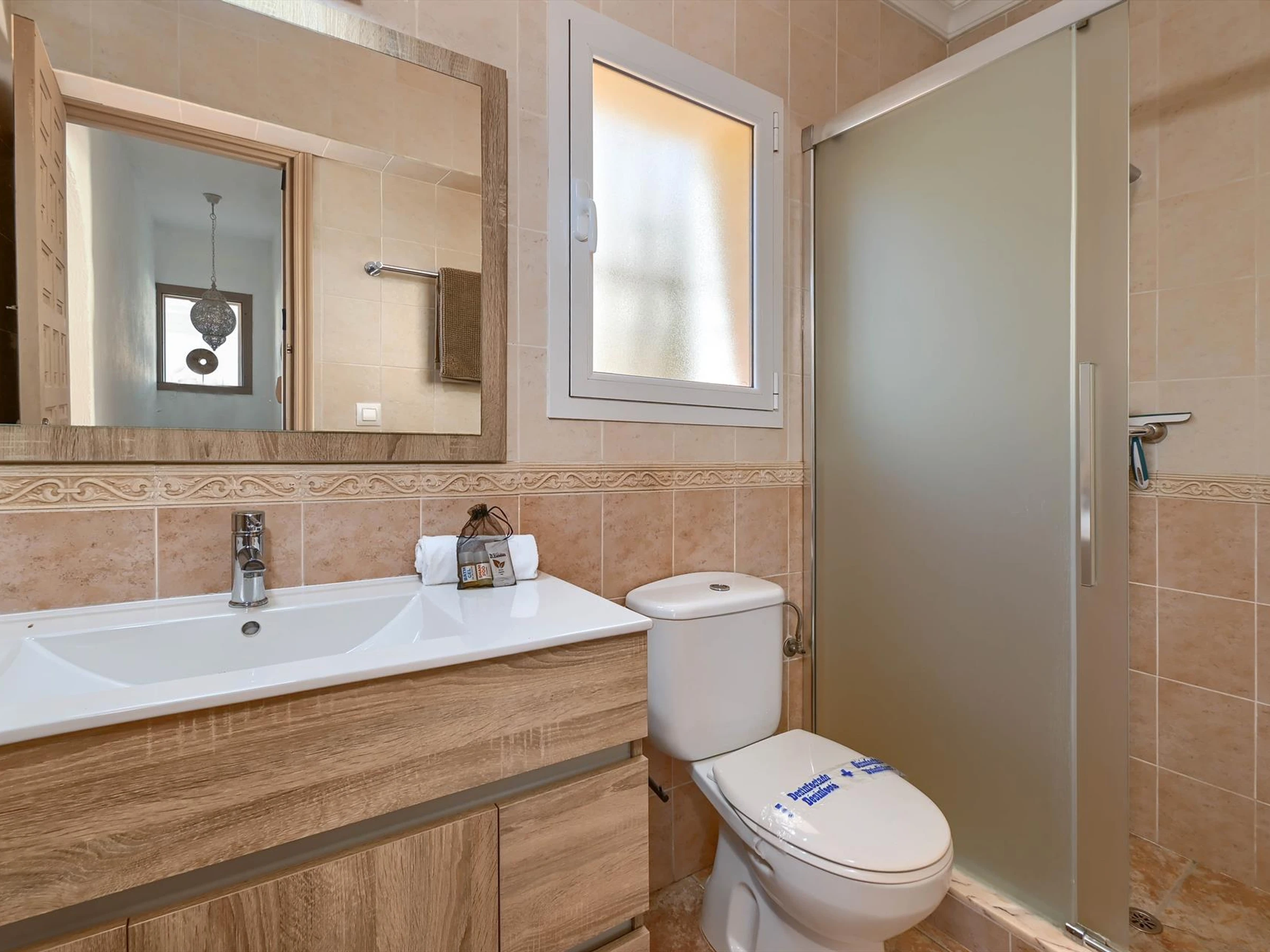* Bathroom with single washbasin, shower, and toilet Exterior of the villa