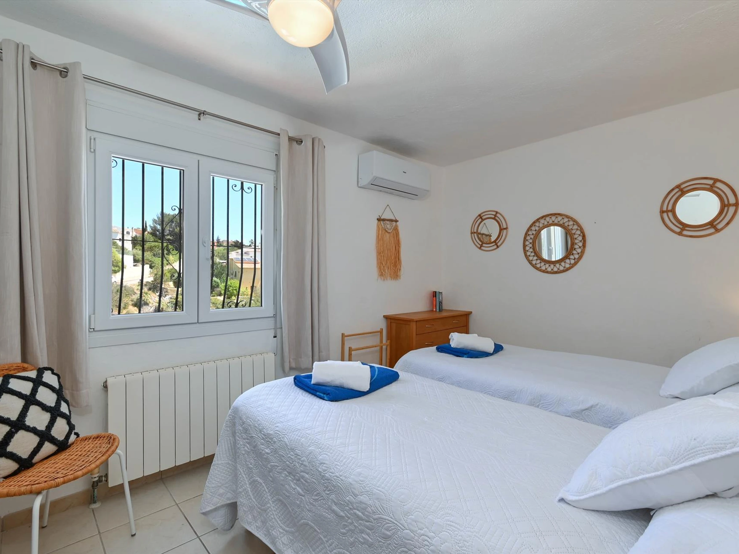 * 1 bedroom with air conditioning, 2 single beds, and fan