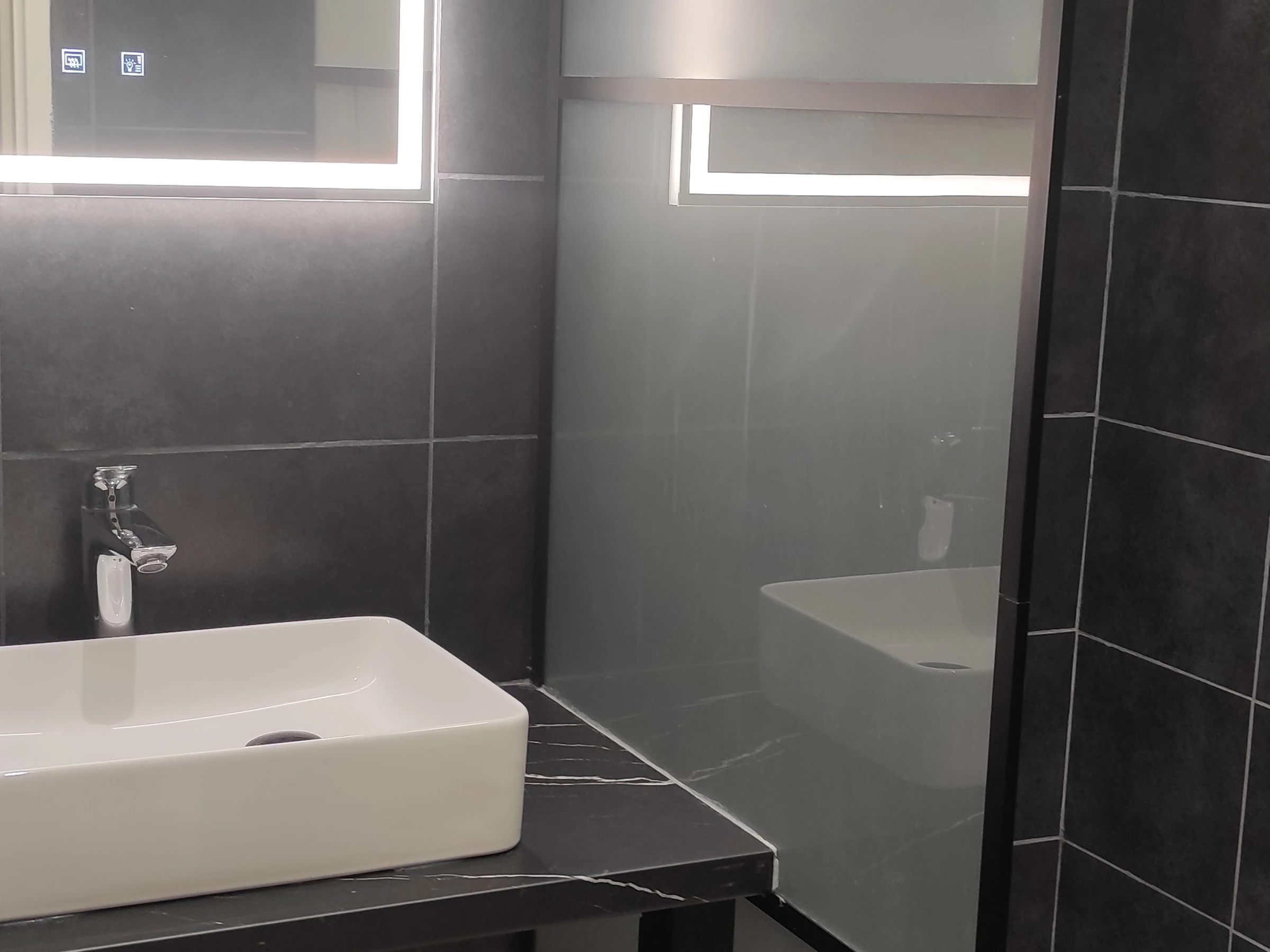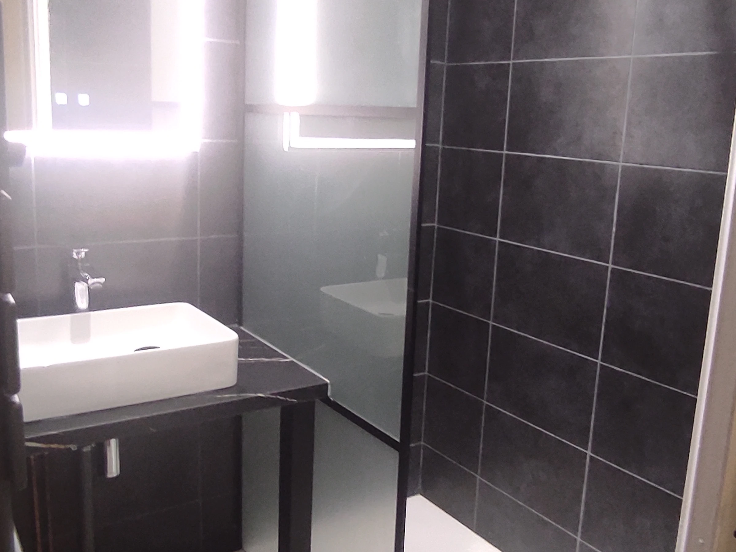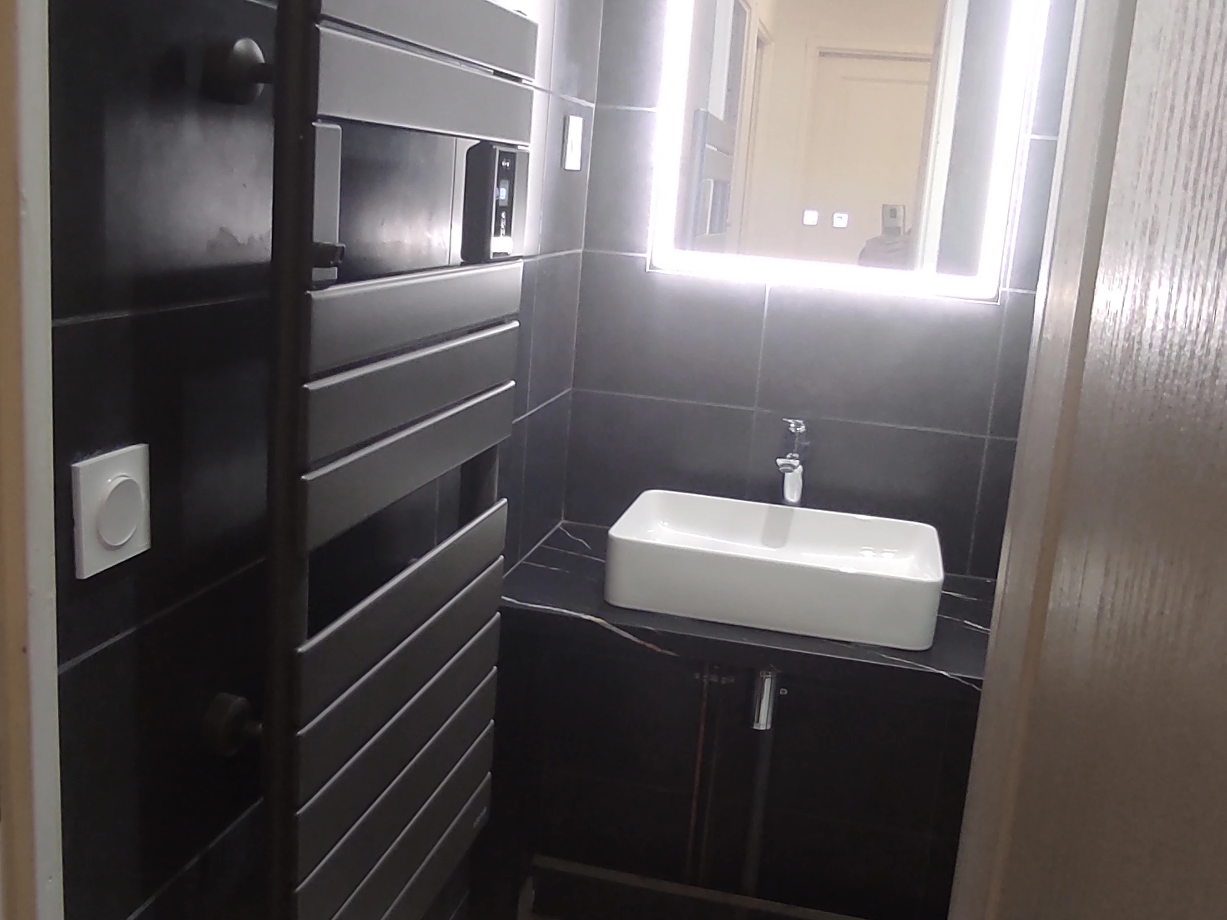 The apartment is arranged around an entrance hall leading to the bathroom (shower cubicle) and a separate toilet.