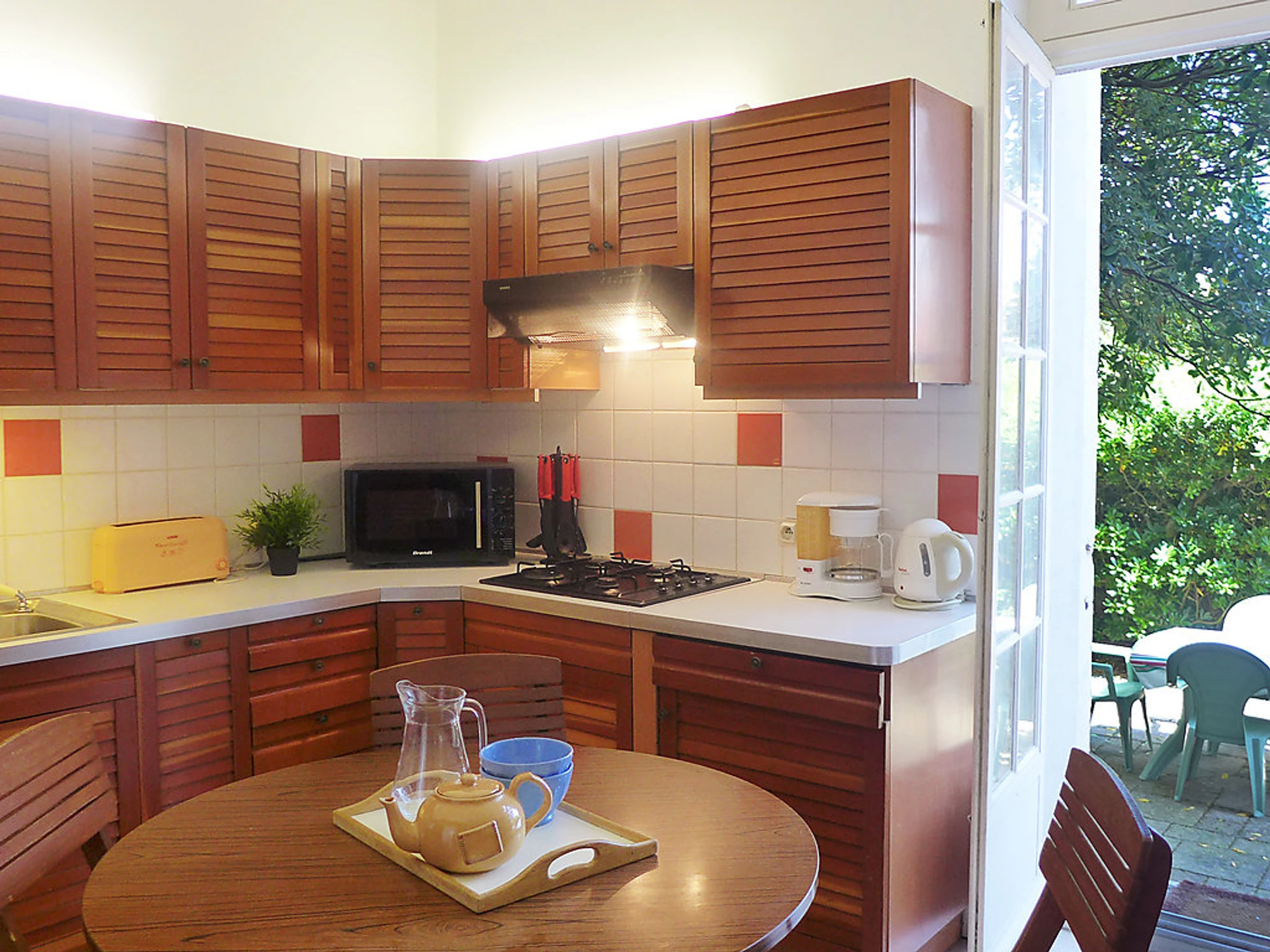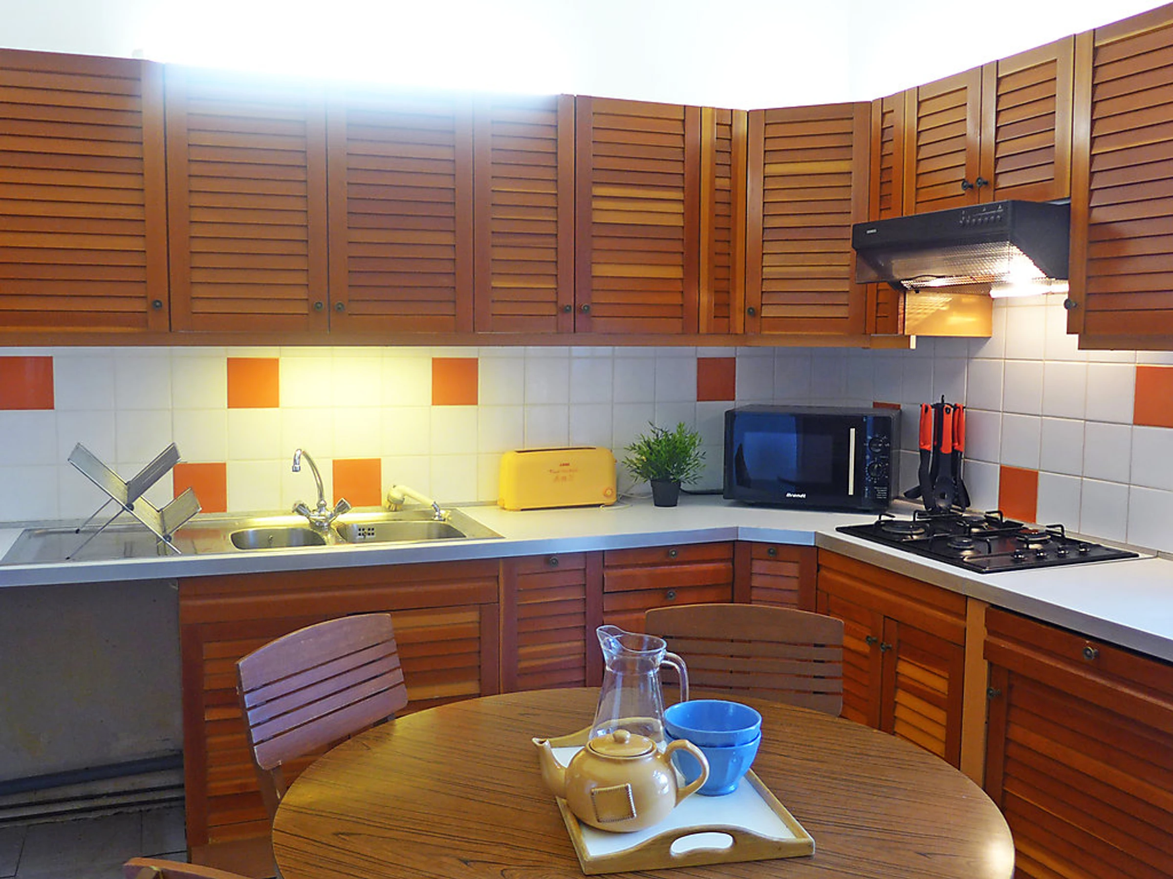 1-room apartment 45 m2, on the ground floor. Practical and comfortable furnishings: living/sleeping room with 2 beds (90 cm), 1 double sofabed (1 x 140 cm), TV (flat screen). Kitchen (4 hot plates, mini-oven, microwave) with dining table. Exit to the terrace. Bath/WC. Gas heating. Large terrace 15 m2, north facing position. Terrace furniture. Facilities: Internet (WiFi, extra). Please note: apartment courtyard side. Smoke alarm. 64122172105NN