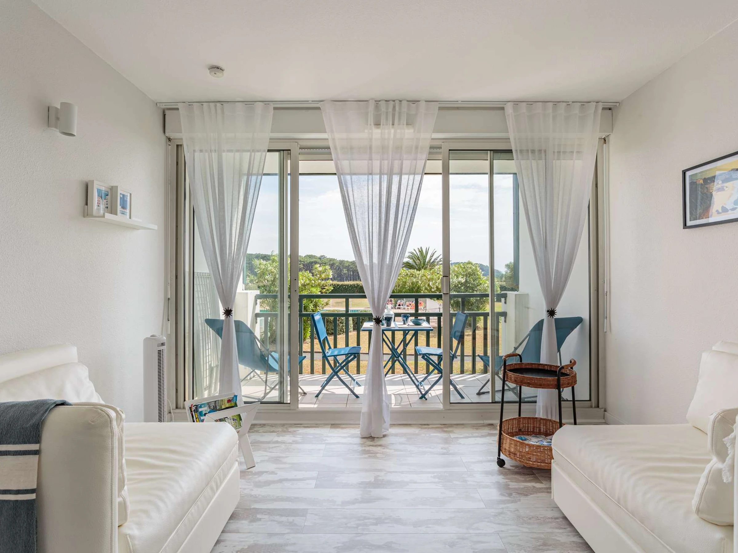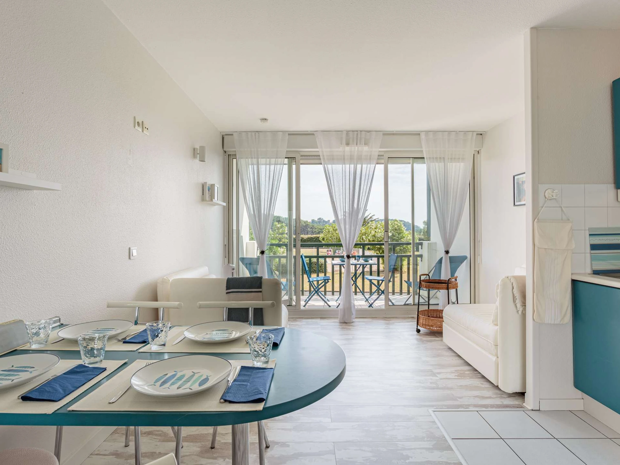 The furnished balcony with a view of the pool and a glimpse of the sea, as well as shared parking, complete this property.