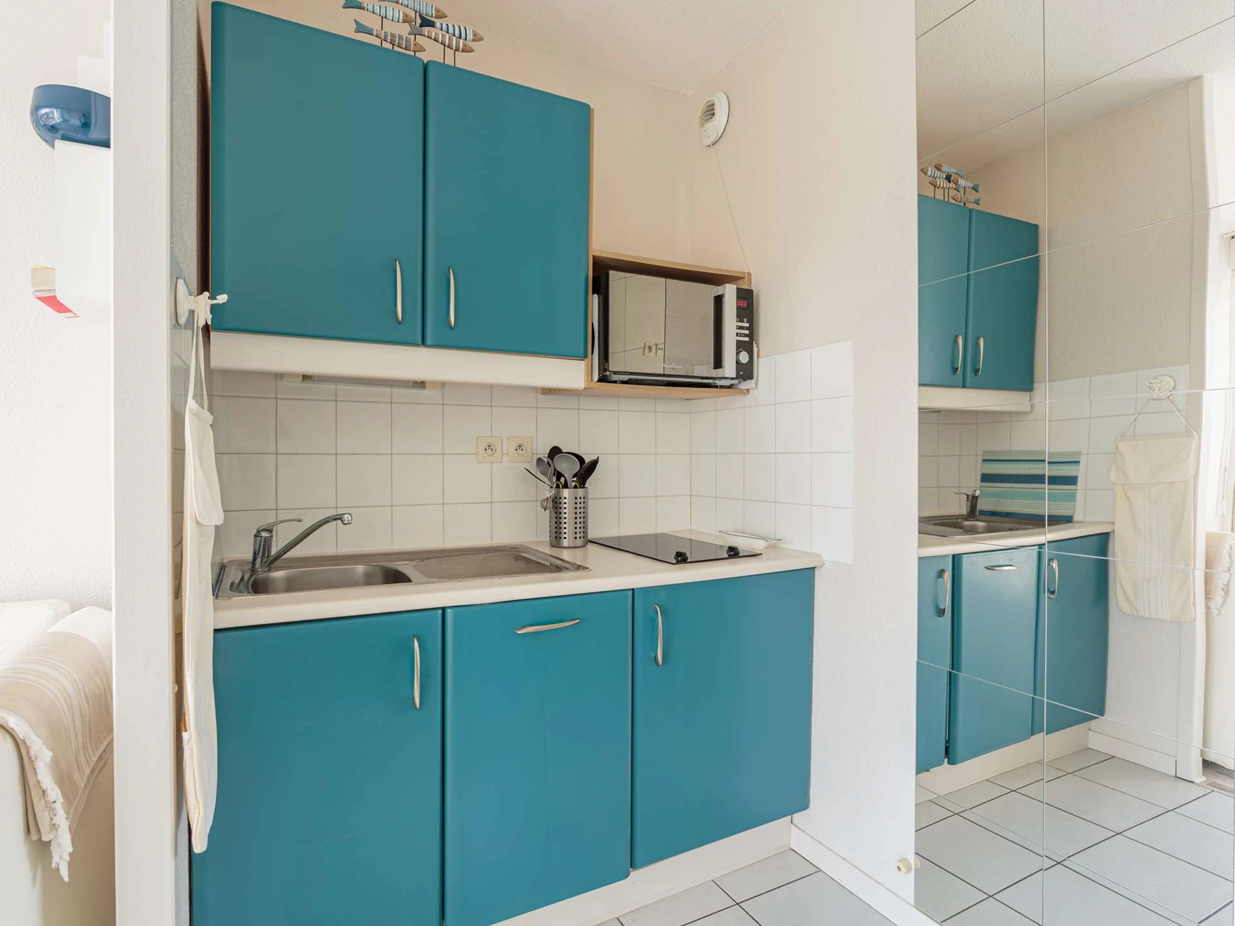 The apartment features a beautiful living room opening onto a balcony with two 80cm fireside beds, a functional open-plan kitchen, and a bathroom with a separate toilet.