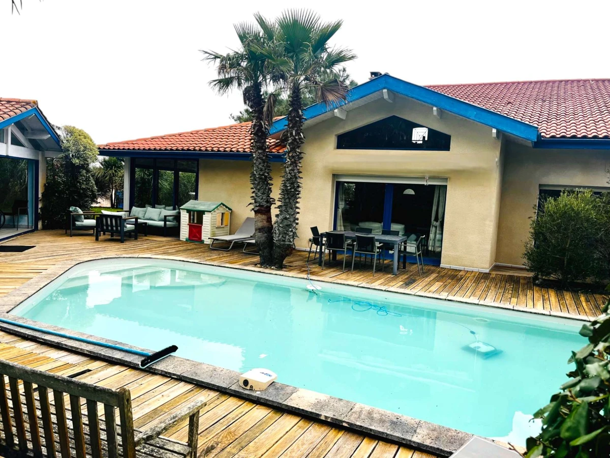 Located near the resort on the edge of the dunes, 500m from the beach and 800m from the shops, this beautiful, spacious 180m² villa sleeps 7 on a private, fenced plot of approximately 900m² with a swimming pool. It features an east-facing covered terrace with garden furniture and a barbecue. Parking is available in front of the house. Wi-Fi access is available.