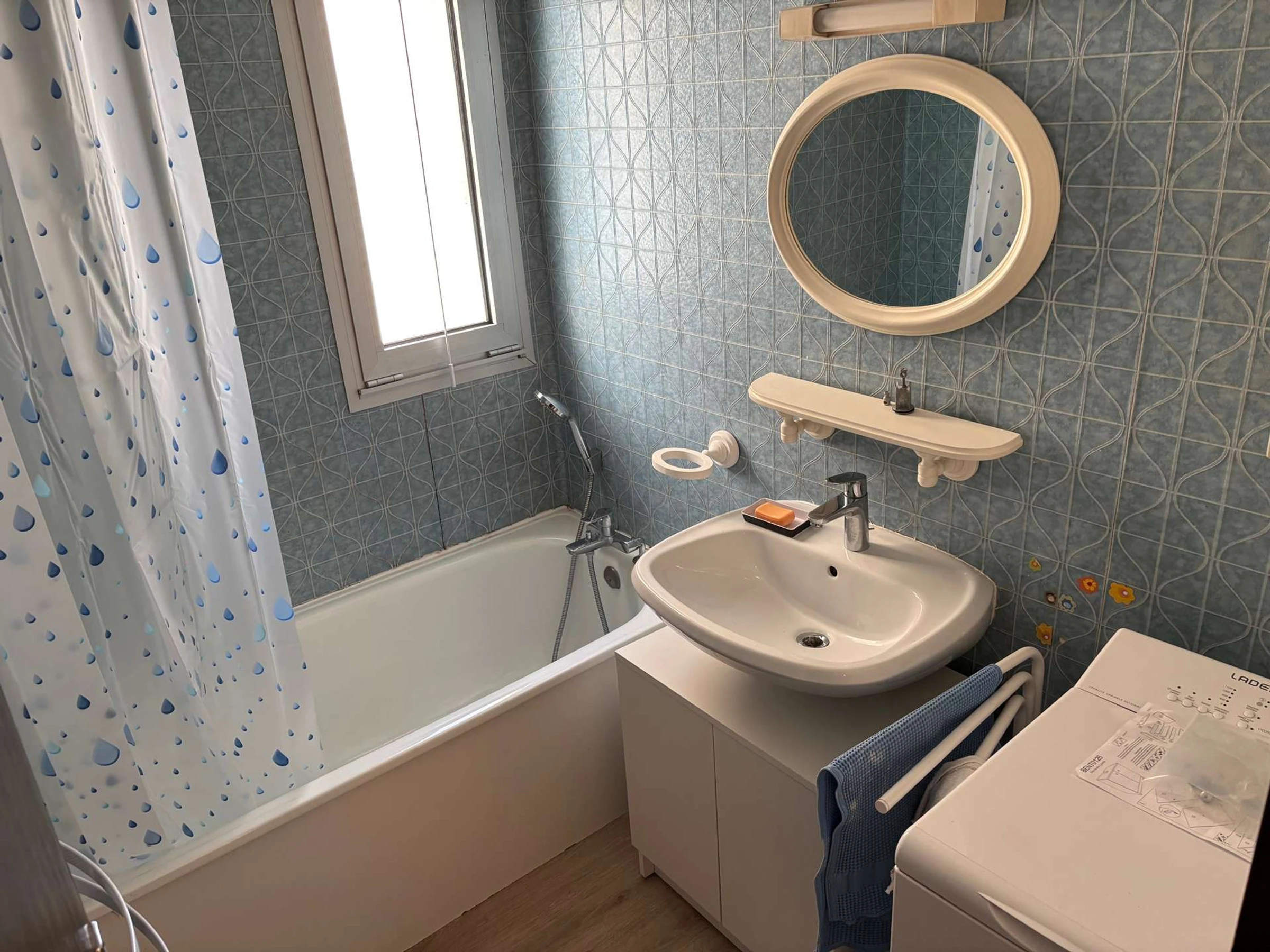 The bathroom has a washing machine and a window. There is a separate toilet.