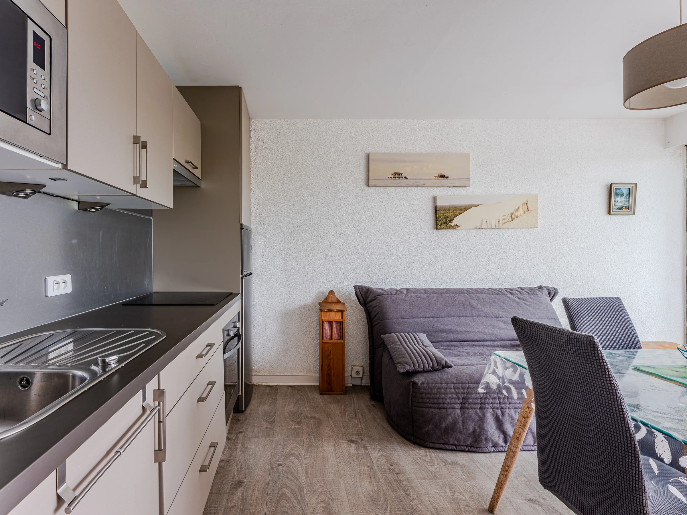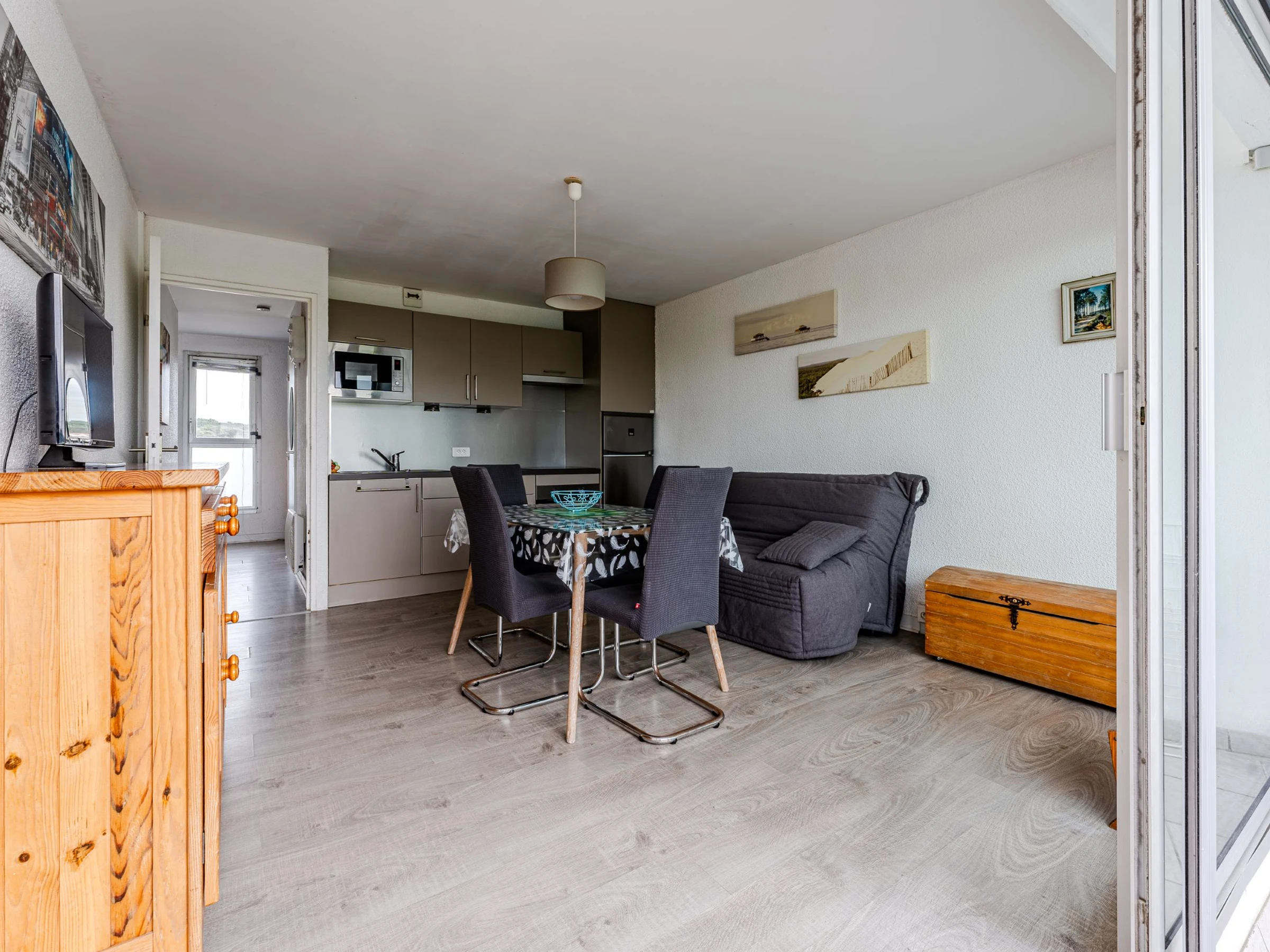 REF: 118ATLA - Studio apartment on the 1st floor with elevator, located on the seafront. Living room with a double sofa bed (140cm), kitchen with ceramic hob, extractor hood, microwave/oven, and fridge/freezer. Enclosed loggia. Sleeping alcove with two single bunk beds (90cm). Bathroom with shower and washing machine. Separate WC. Parking.