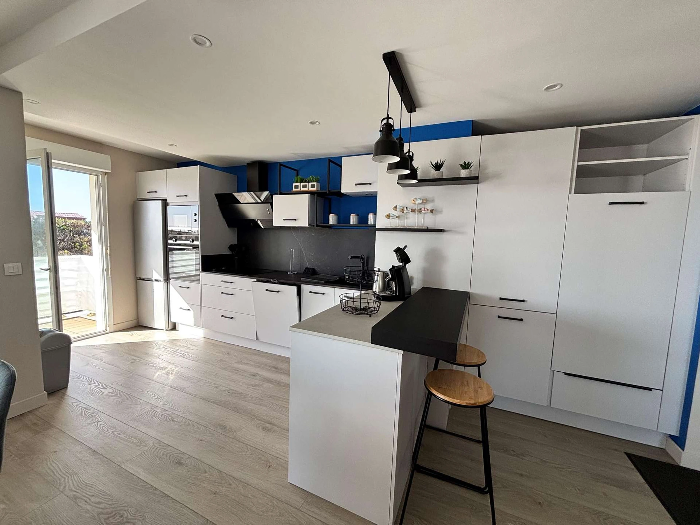 The brand-new, fully equipped kitchen has everything you need: induction cooktop with 4 burners, Senseo coffee machine, toaster, fridge with freezer, microwave, oven, and dishwasher.