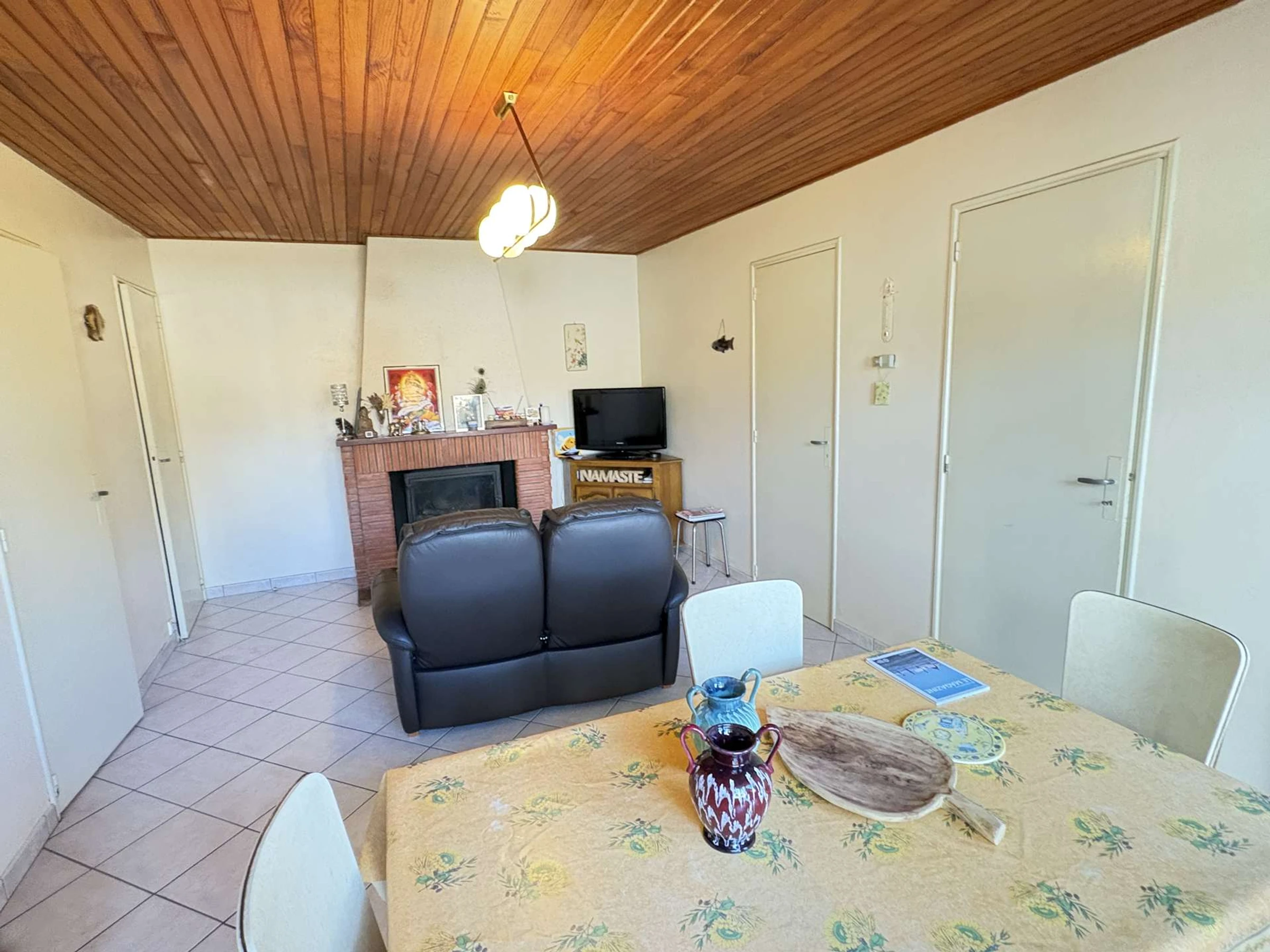 Entirely on one level, the house features a welcoming living room with a two-seater sofa, a table and chairs, a television, and a sideboard. Fiber optic internet with Wi-Fi allows you to stay connected throughout your stay.