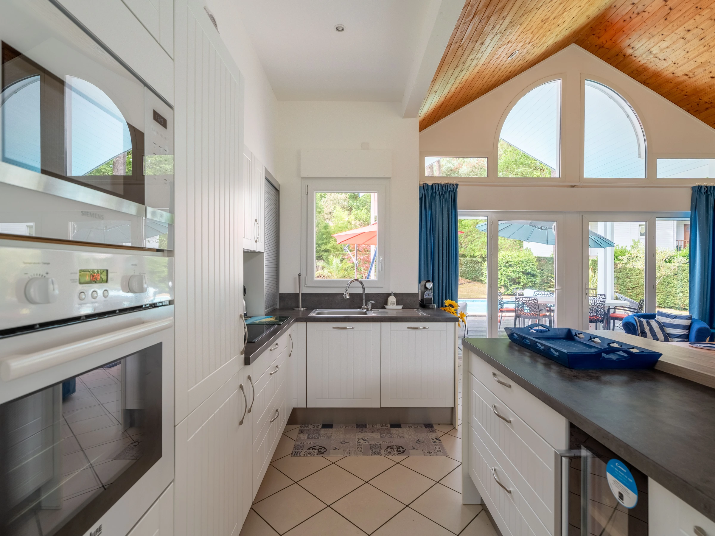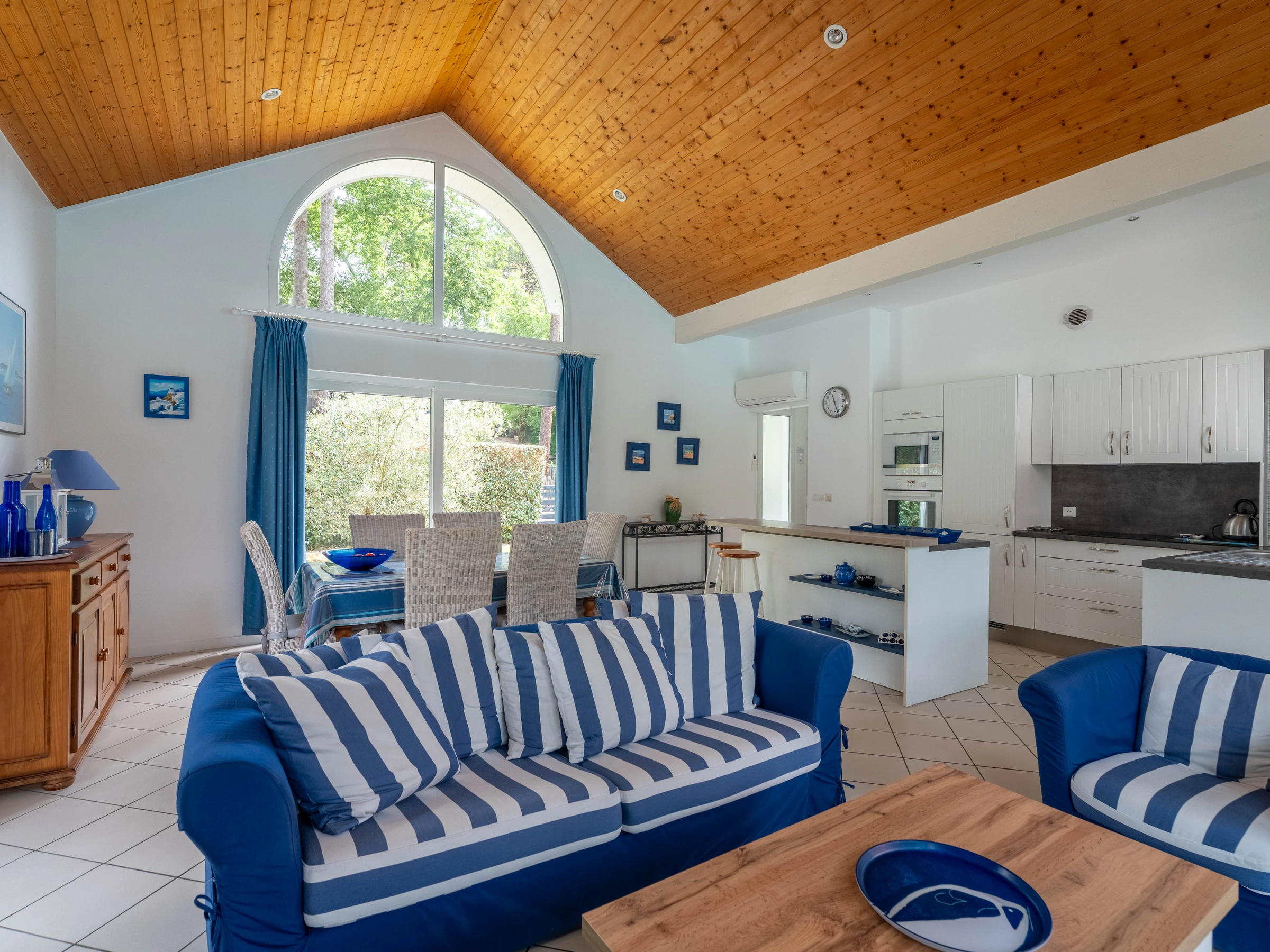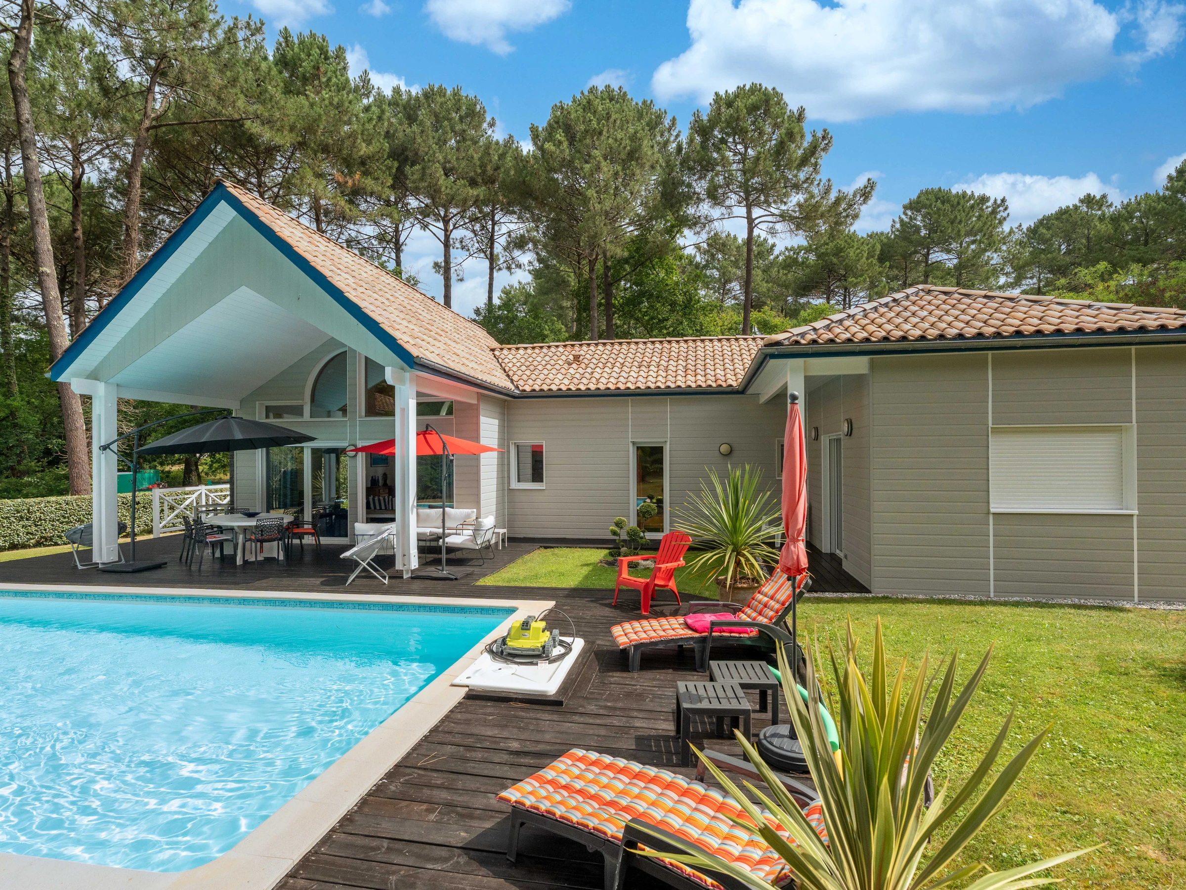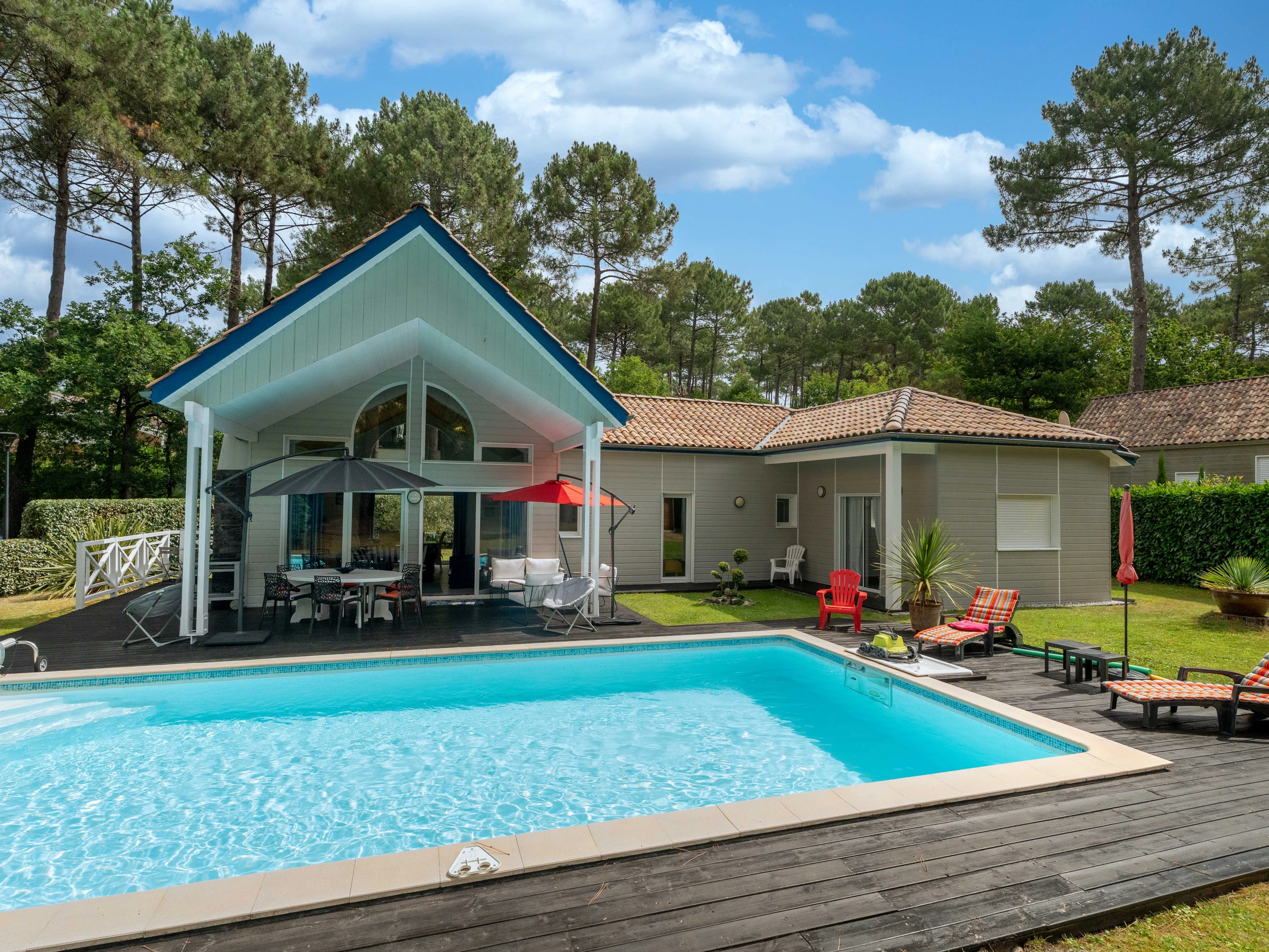 In the heart of the Golf de Biscarrosse, in a green setting, come and discover the charm of this beautiful villa with private swimming pool. You will appreciate this wooden construction, which offers beautiful volumes in a sunny and bright atmosphere. You are in the immediate vicinity of the golf courses as well as the lake where you can take boat or paddle rides or discover our cycle paths. In addition, you are close to the Aqua Park, the largest inflatable water park in Europe. You are also 5 km from ocean beaches and surf schools. This house is made up of 2 bedrooms (a master bedroom with a 160cm double bed and a bedroom with 2 90cm single beds), a fully equipped American kitchen opening onto a large main room with sofa, television, Wifi, table and armchairs to relax. Two bathrooms are at your disposal for greater comfort. Outside you can enjoy a large terrace with garden furniture, ideal for enjoying your meals or cocktails overlooking a large plot of land with heated swimming pool. A parking space is available within the property. The provision of bed linen and cleaning are included in the rental price.