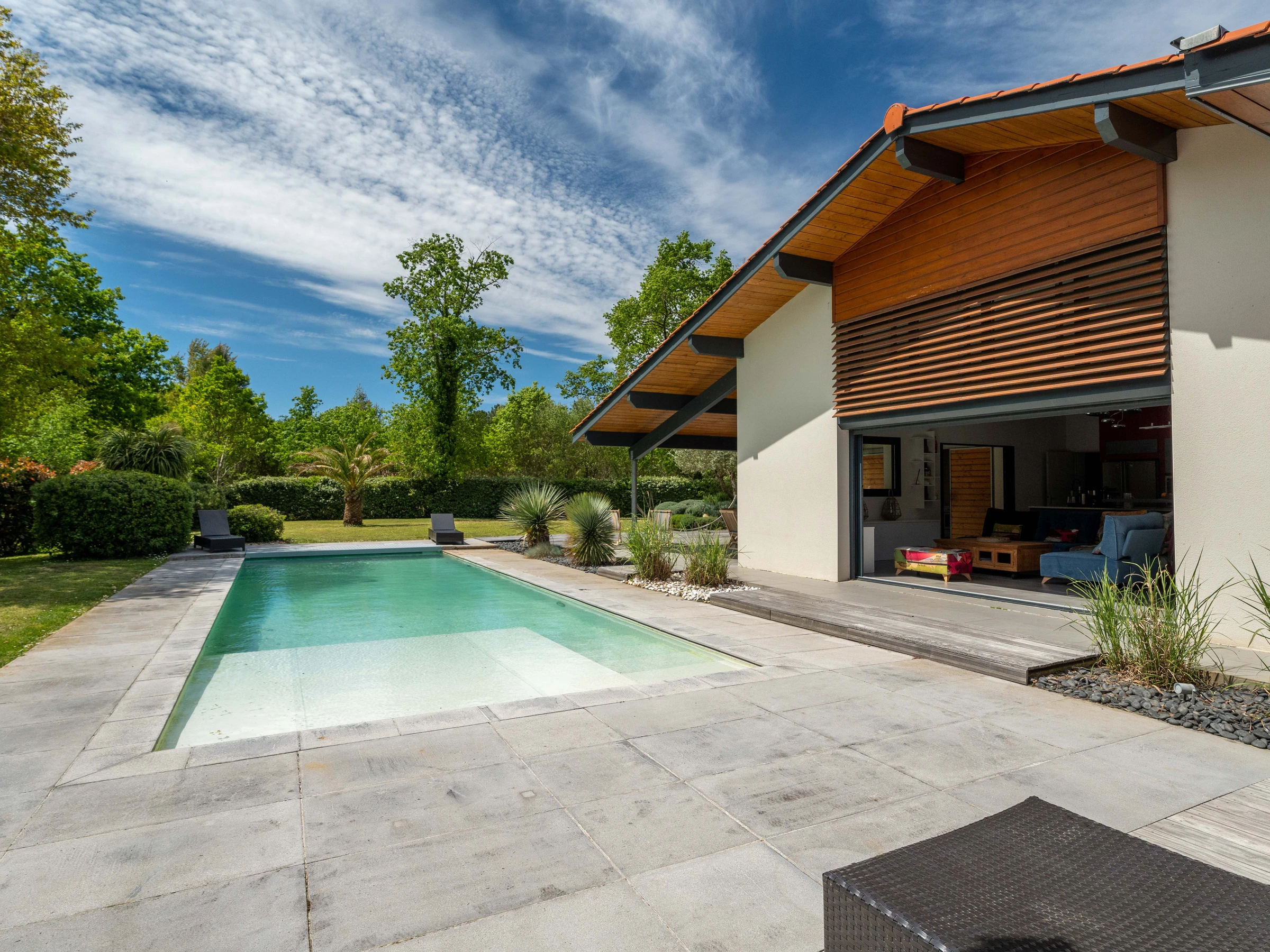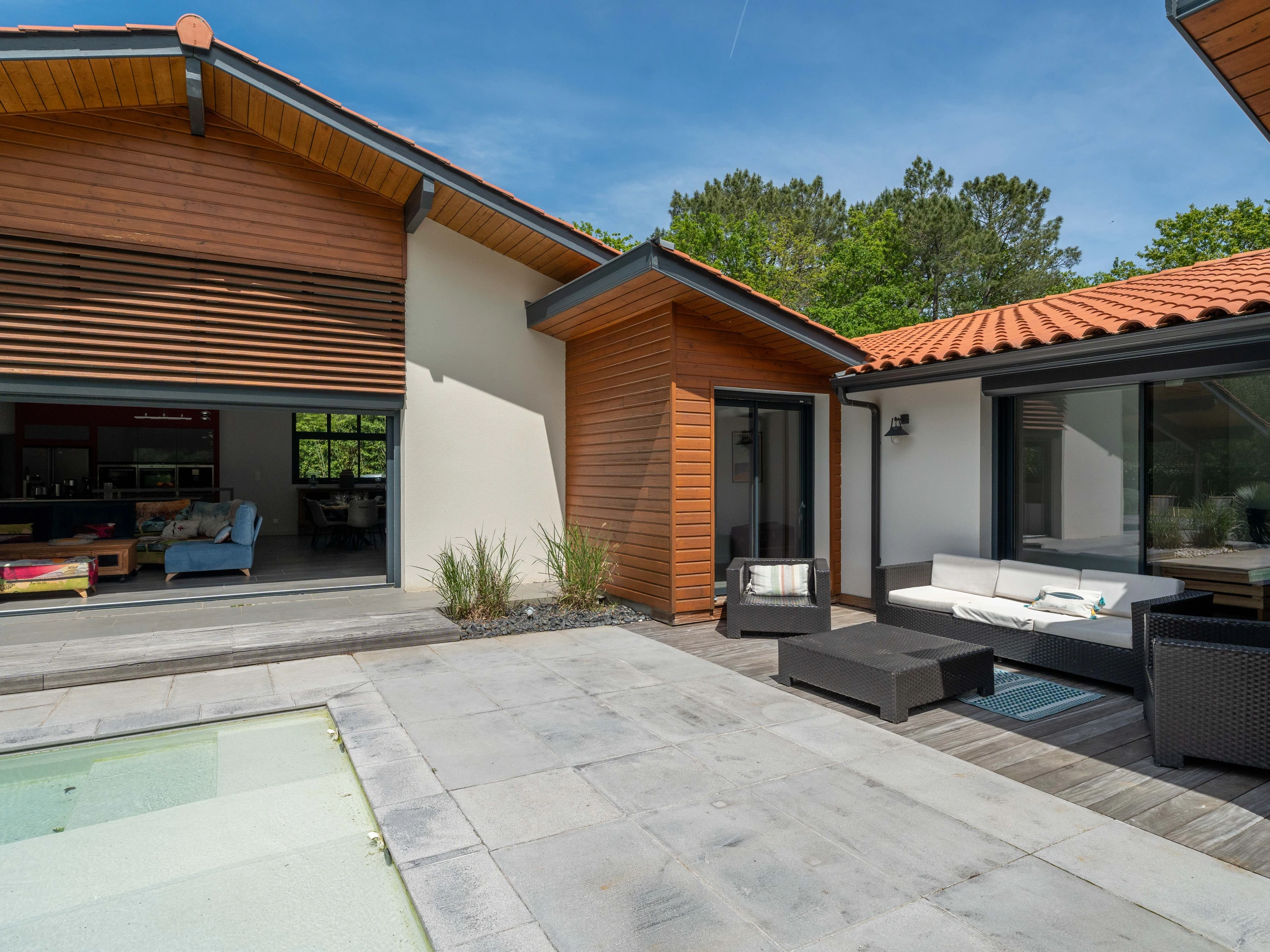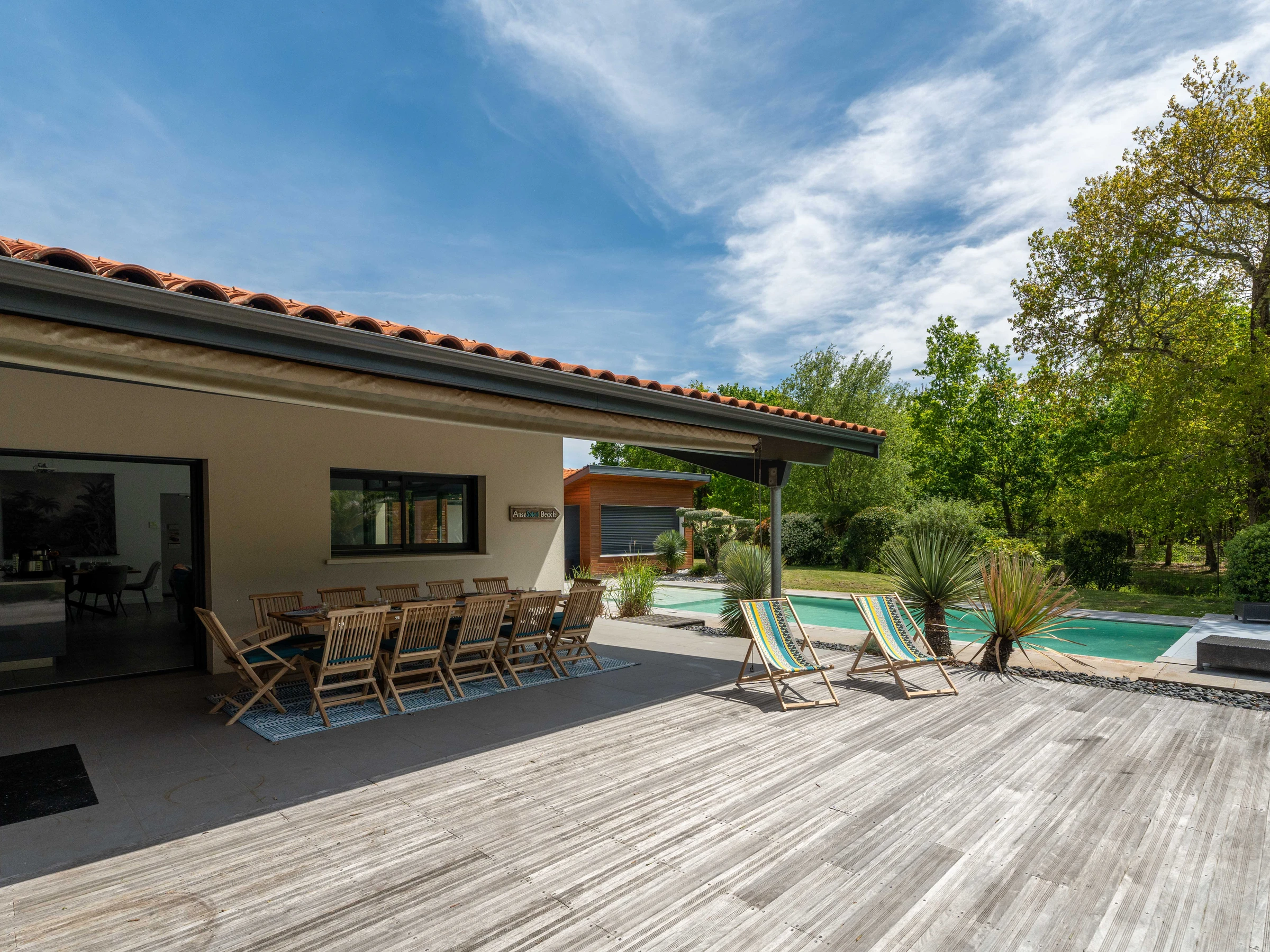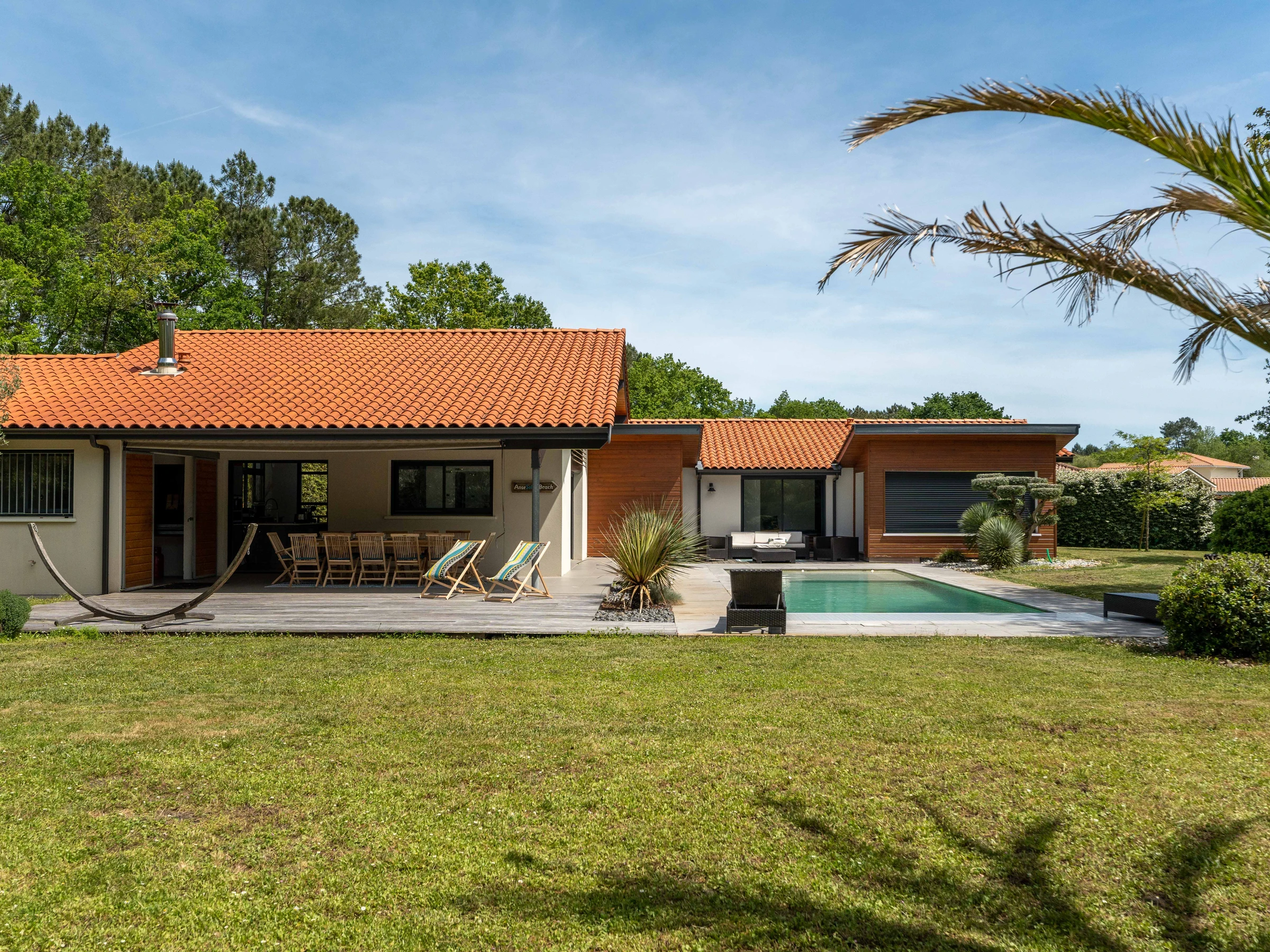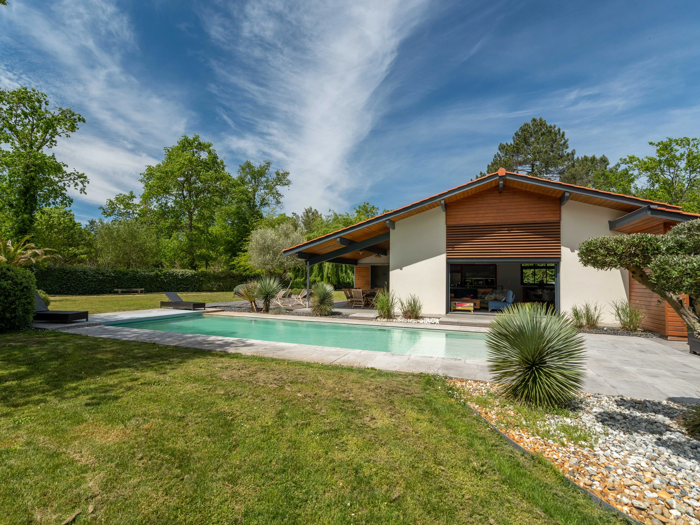 Located in the heart of a peaceful neighborhood near the northern lake and the town of Biscarrosse, come and discover this exceptional house with contemporary lines, accommodating 10 to 14 people. The house features a spacious living area (63m²) that will charm you with its generous proportions. There is also a stunning open-plan kitchen, fully fitted and equipped. The house comprises four beautiful bedrooms: a large master suite (42m²) with a queen-size bed (160cm) and its own shower room, toilet, and large dressing room with a sofa bed; a second bedroom with a queen-size bed (160cm) and storage; a third bedroom with a double bed (140cm) and storage; and a fourth bedroom with three single beds (90cm) and storage. A bathroom and a shower room complete the remarkable amenities of this house. There are also two separate toilets. Outside, you'll find an outdoor kitchen for preparing meals with friends and family (a barbecue is not available, but a large electric griddle is provided), a 25m² south-facing terrace overlooking the swimming pool, which is open and heated from June to September, and a large 2785m² garden with a foosball table and pétanque court. Several parking spaces are available on the property. Parties are strictly prohibited.