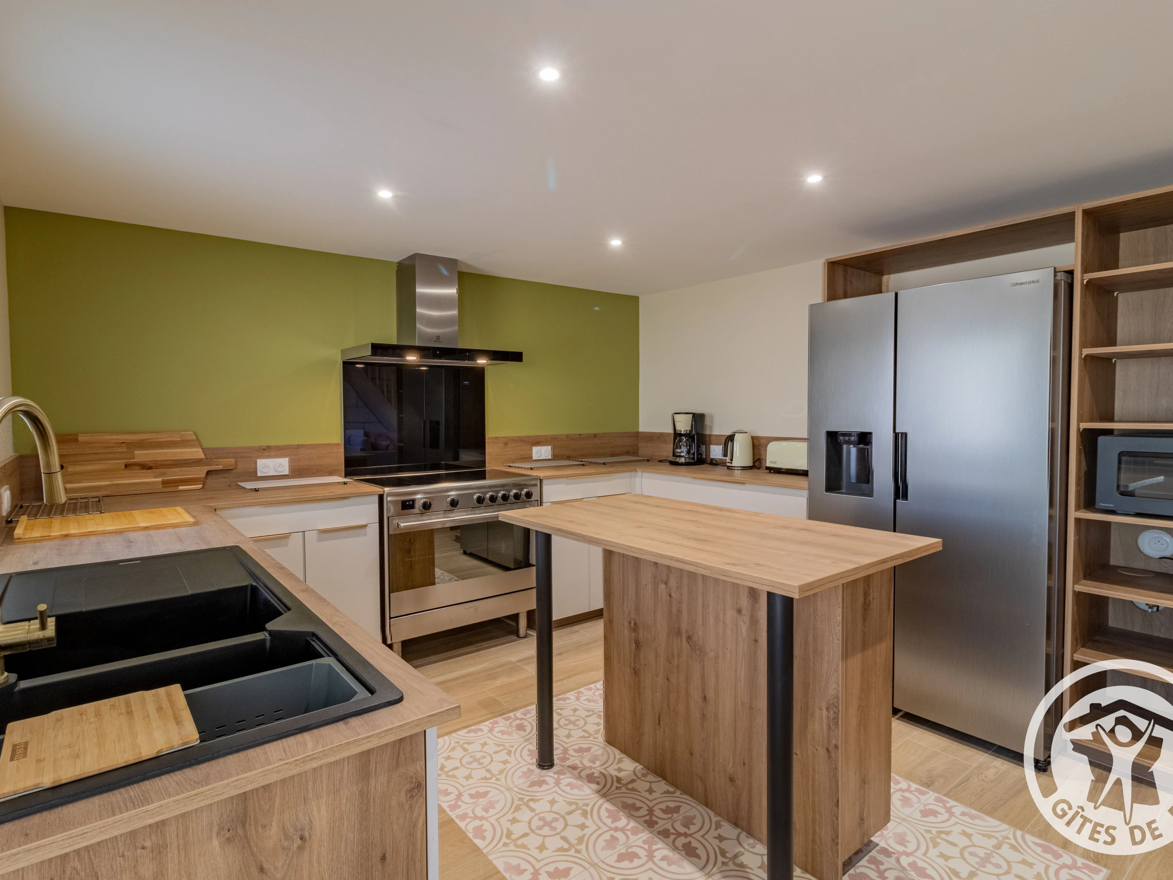 Inside, discover a warm and inviting living area with a lounge around the fireplace and a large dining space for 15 people. The modern kitchen is pleasant and functional, equipped with appliances and amenities suitable for groups.
