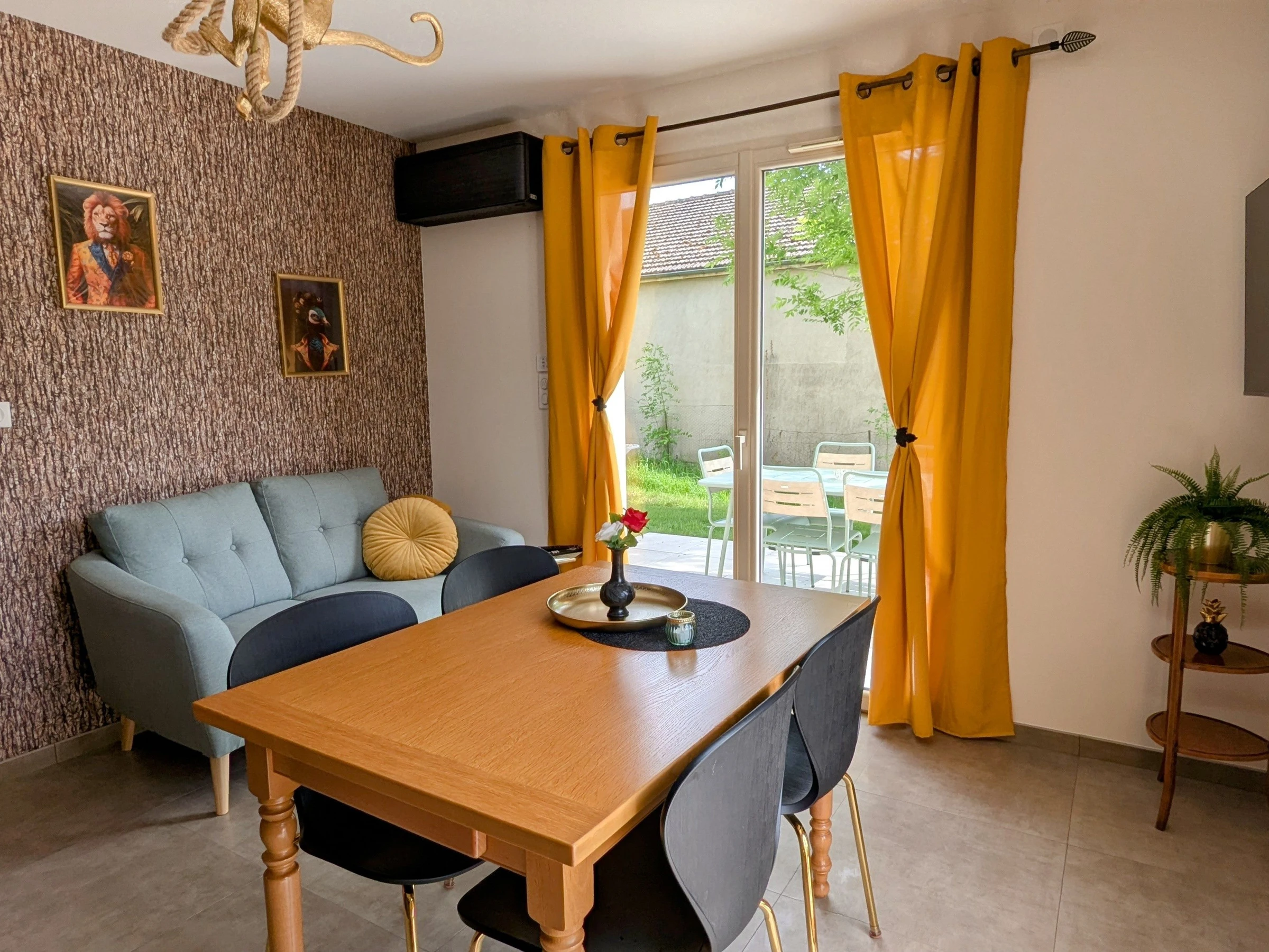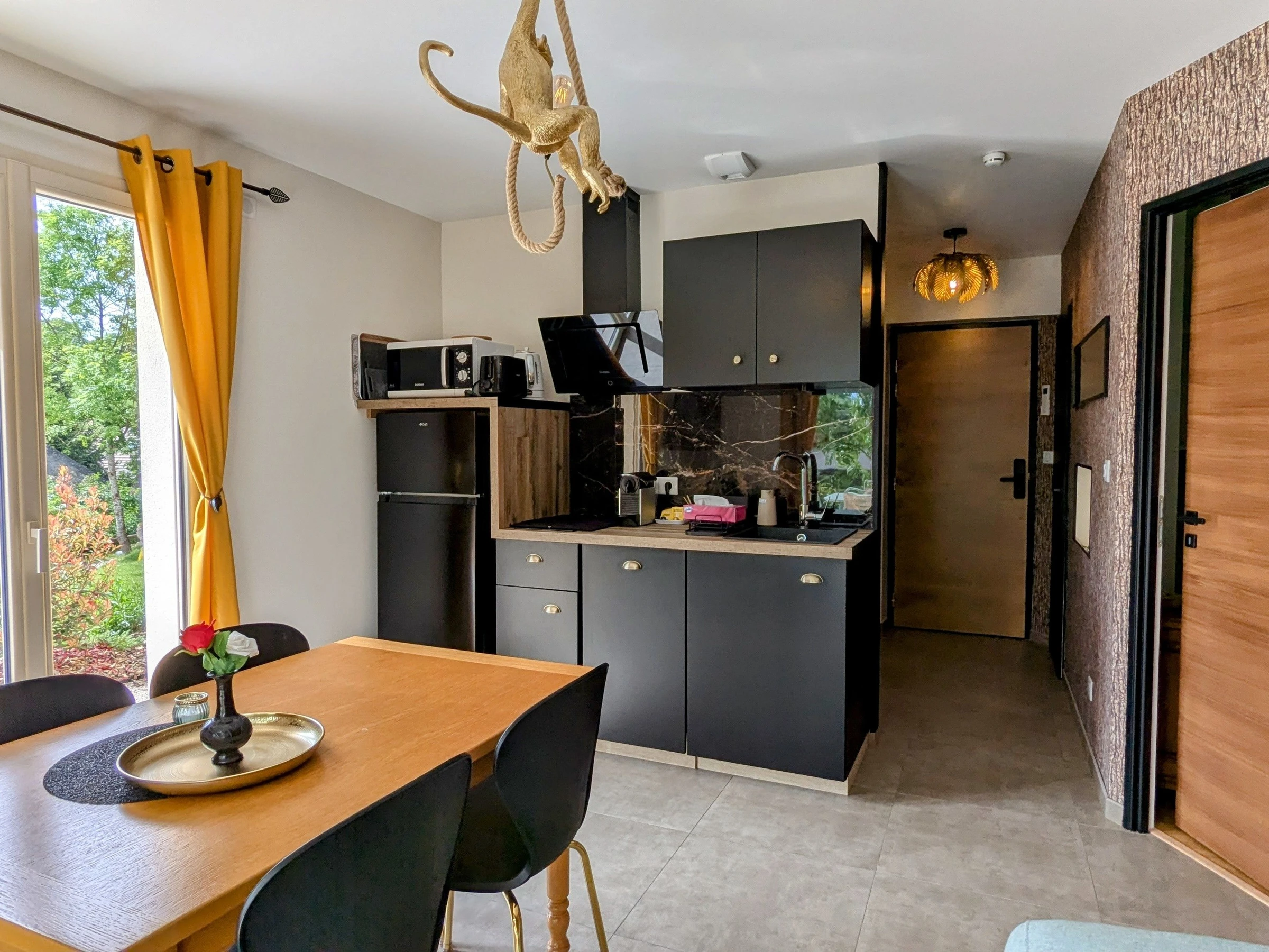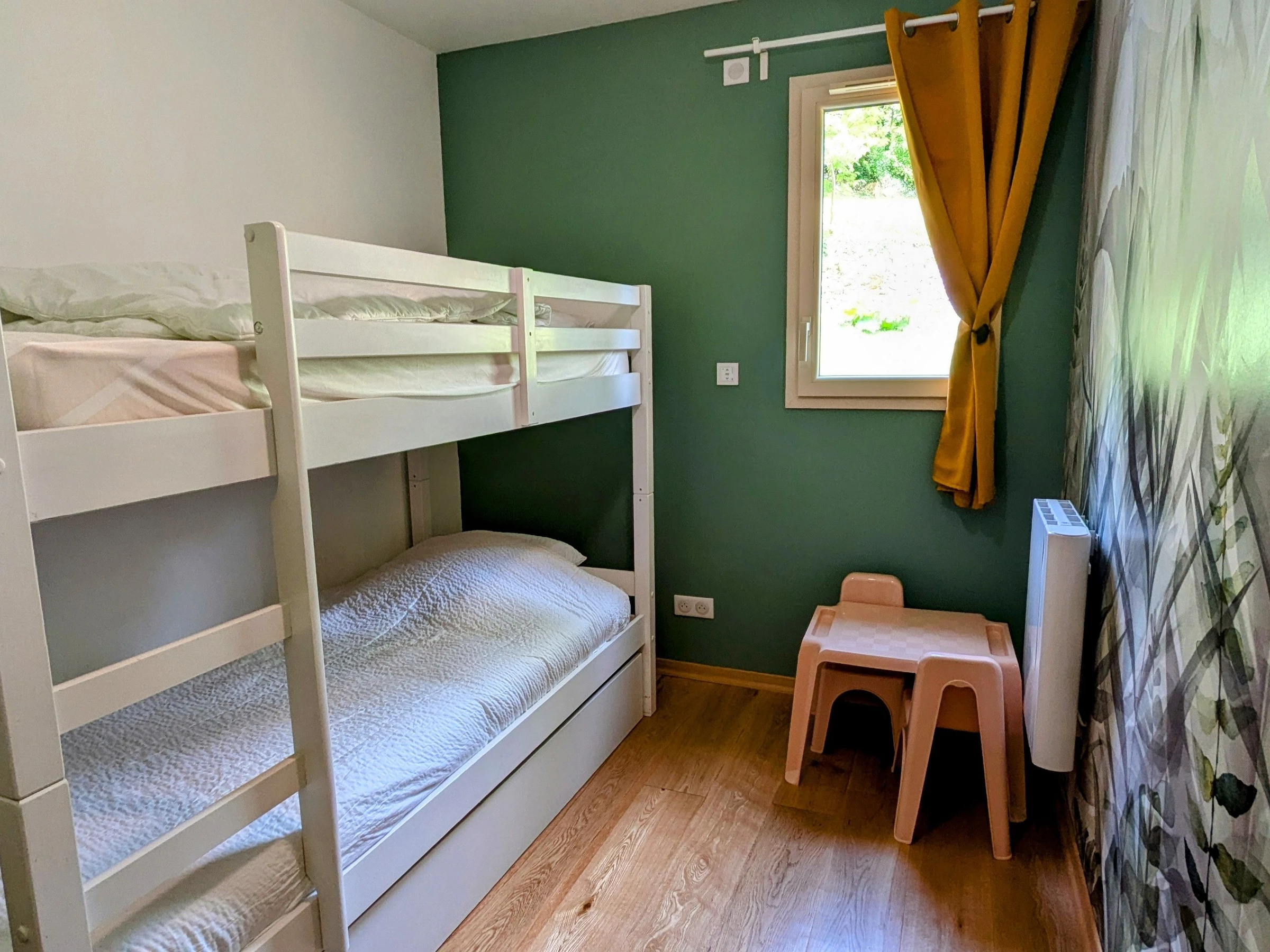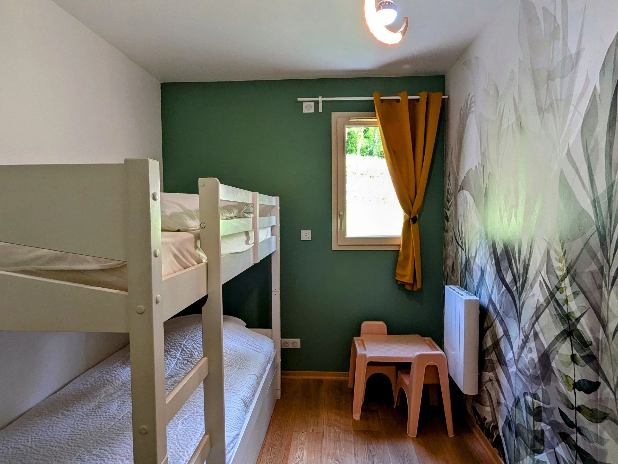 A fully equipped kitchen opening onto the living/dining room, with TV, Wi-Fi, and direct access to 2 private terraces, one of which is not overlooked. A shower room, a separate toilet, a forest-style bedroom with a 160x200cm bed and a children's bedroom with two 90cm bunk beds. Well soundproofed, this new construction dating from 2024 offers high-quality amenities. High-end bedding.