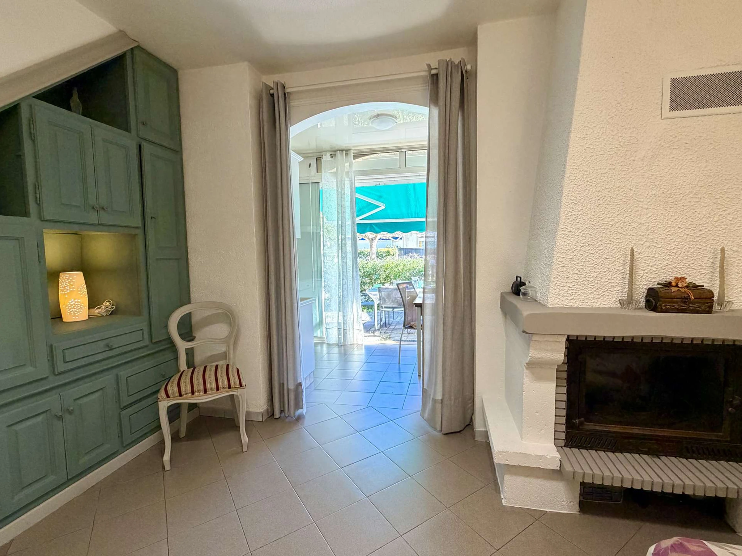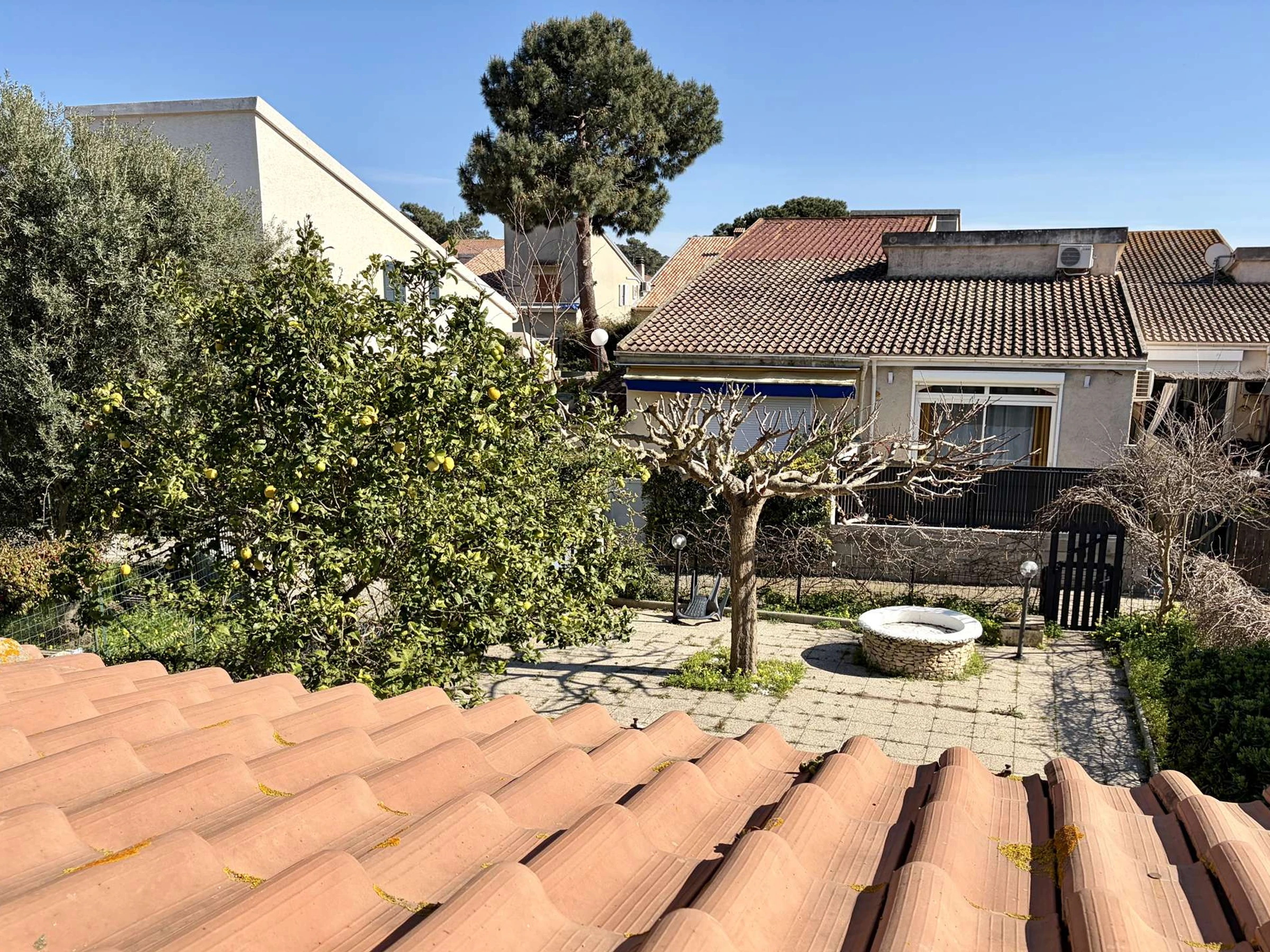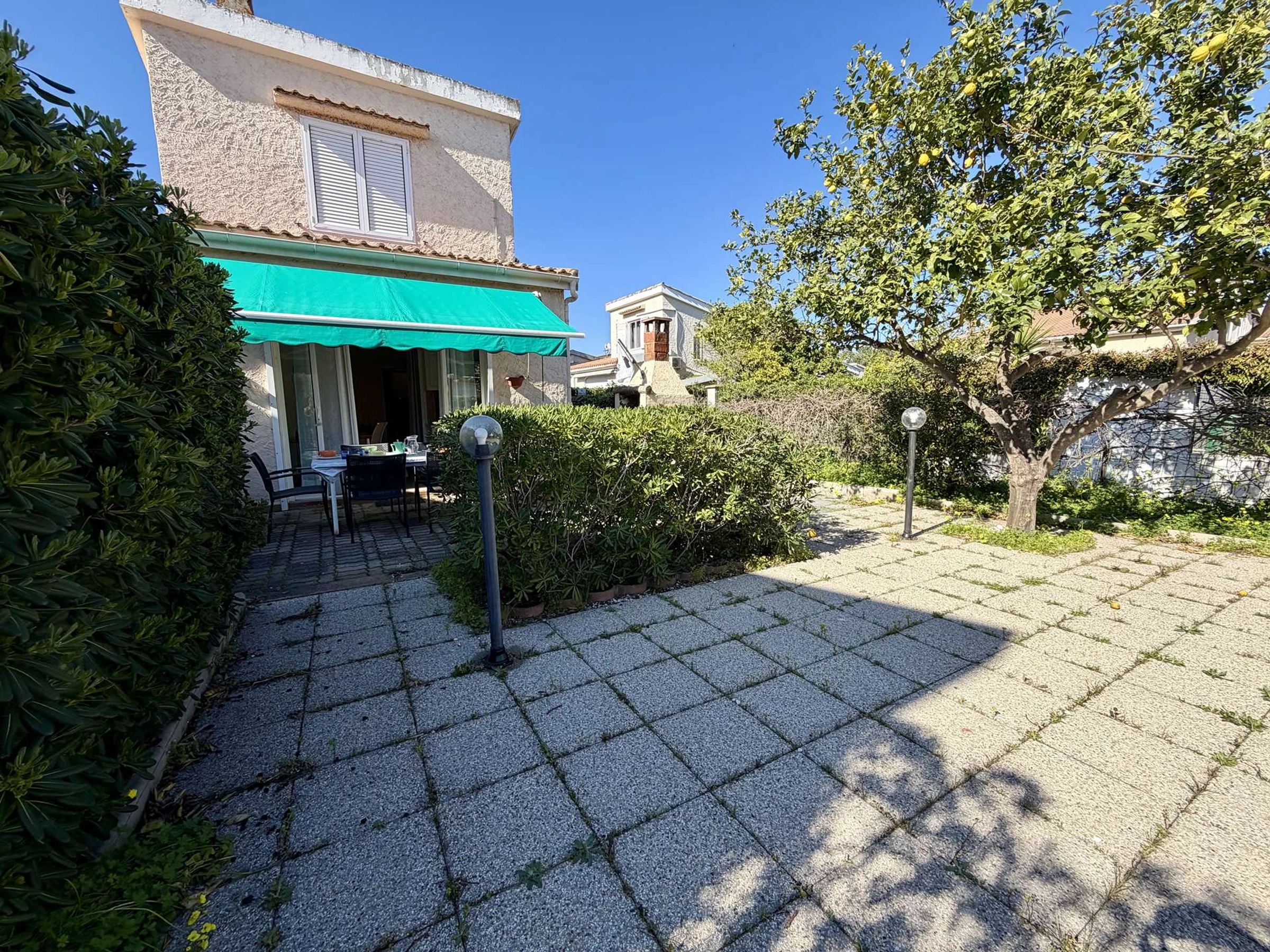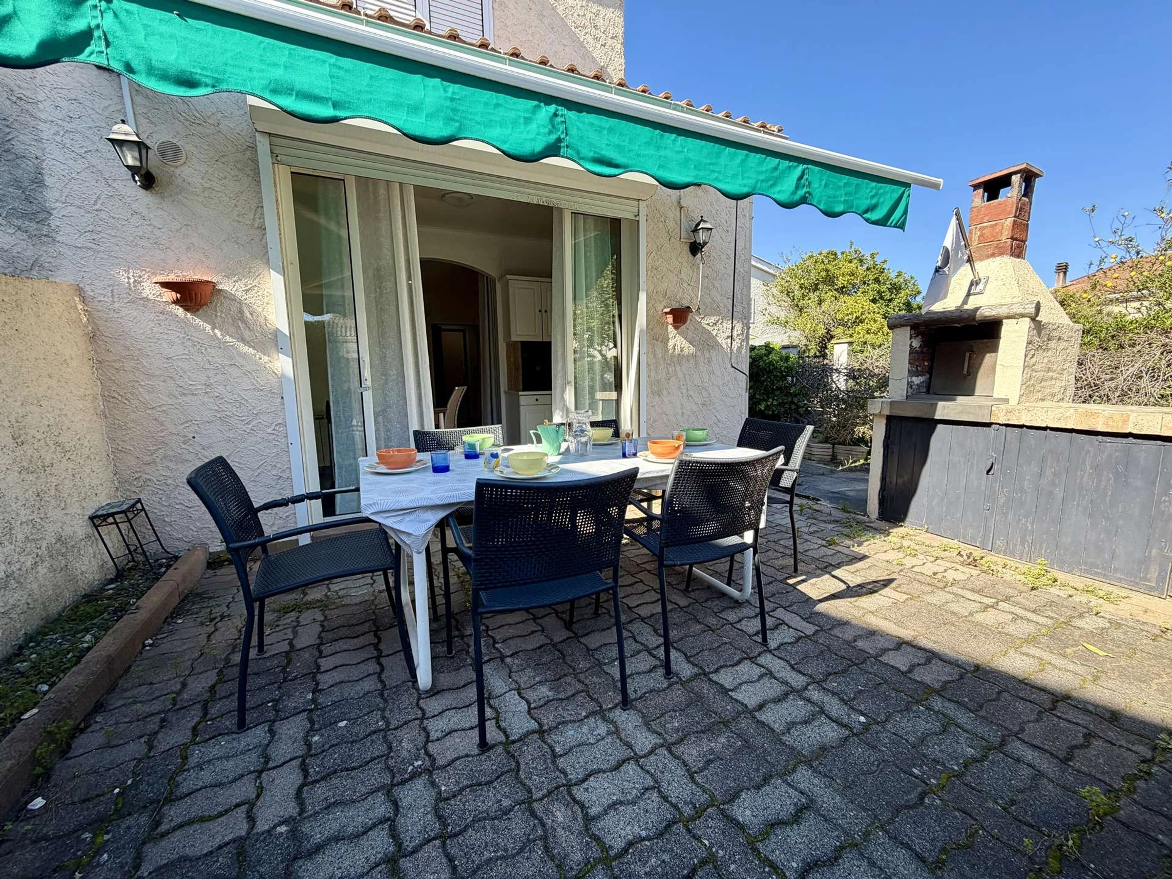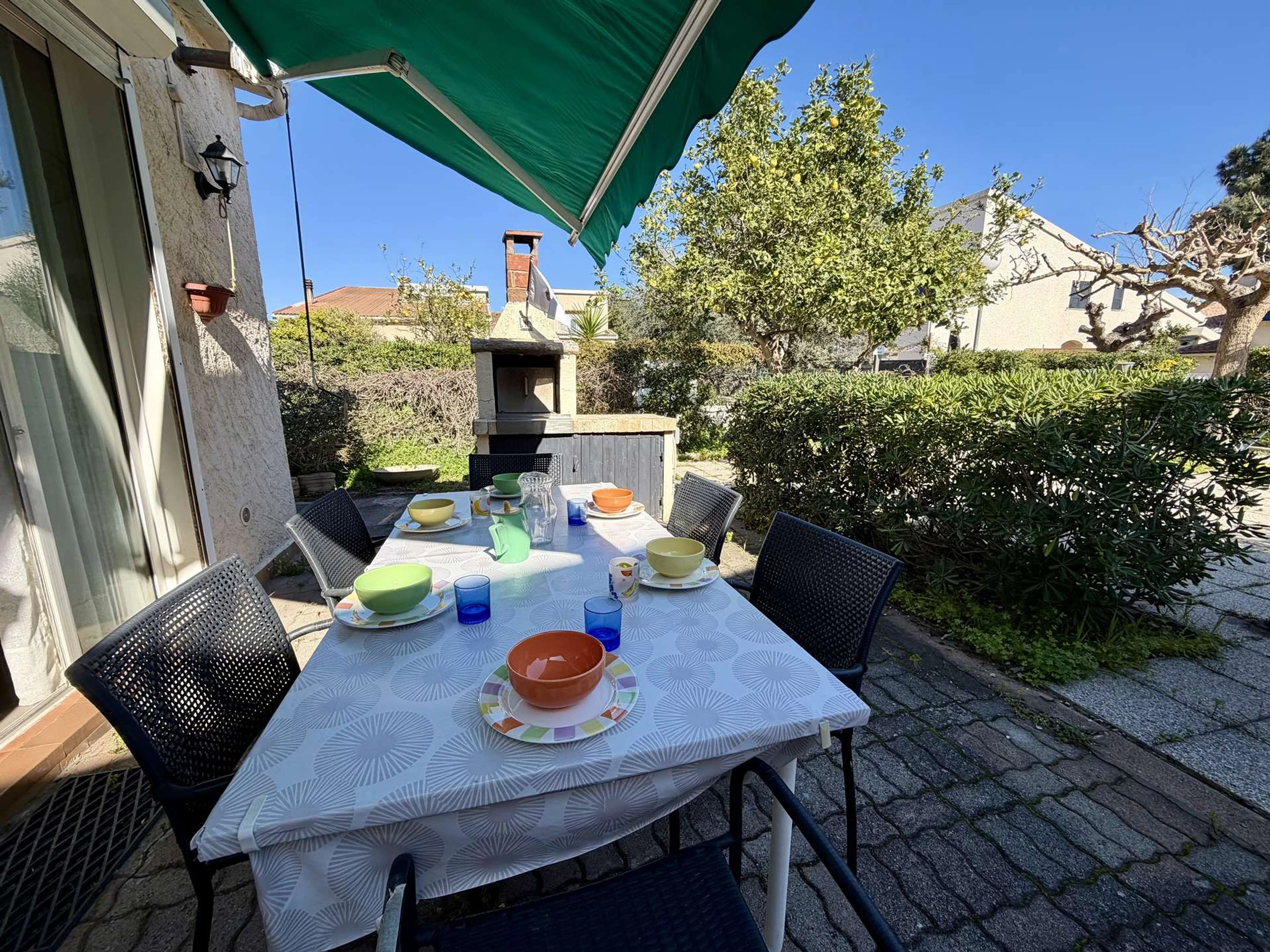 Vous pourrez profiter d'un bel espace extérieur dallé et ombragé avec barbecue, salon de jardin et bain de soleil