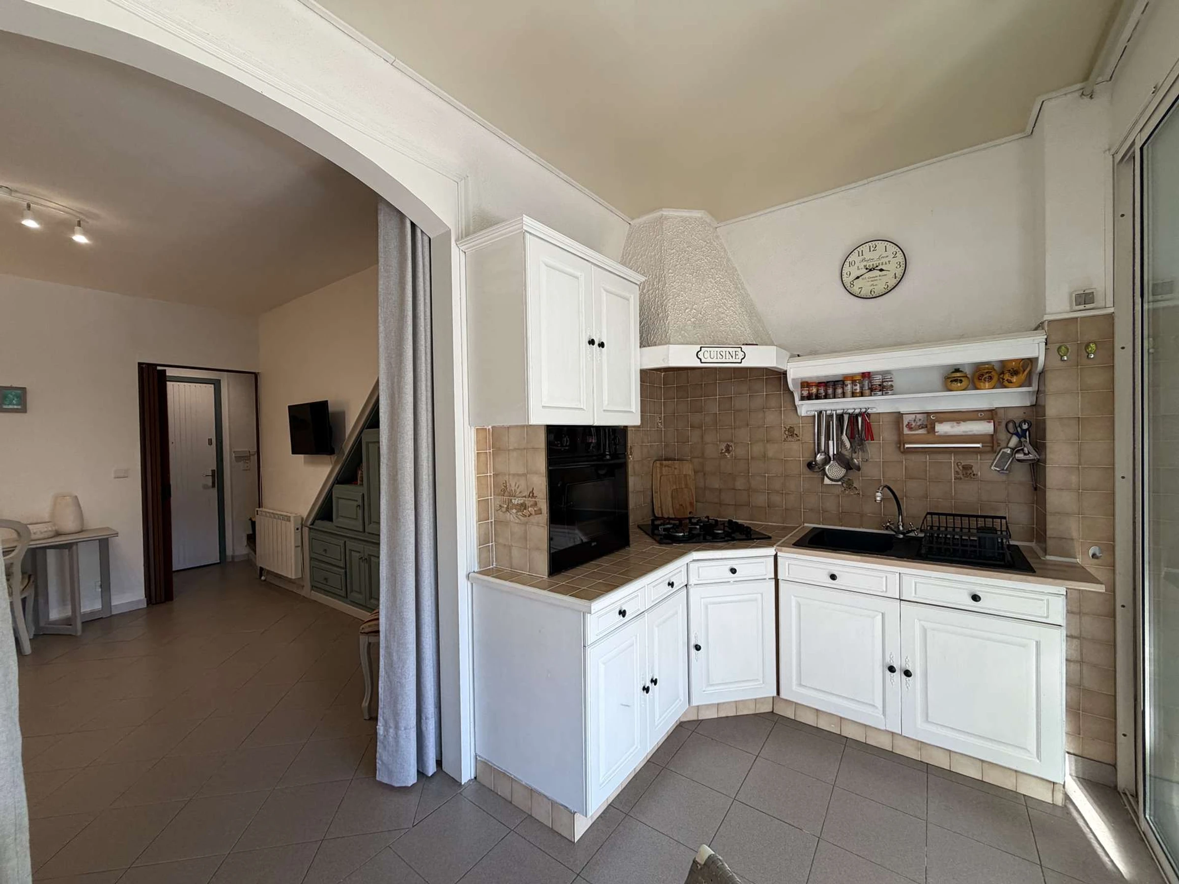 Cuisine ouverte entièrement équipée (plaques, four, hotte, réfrigérateur combiné, micro-ondes, cafetière,bouilloire, lave-linge, etc.) Salle d'eau avec douche, WC