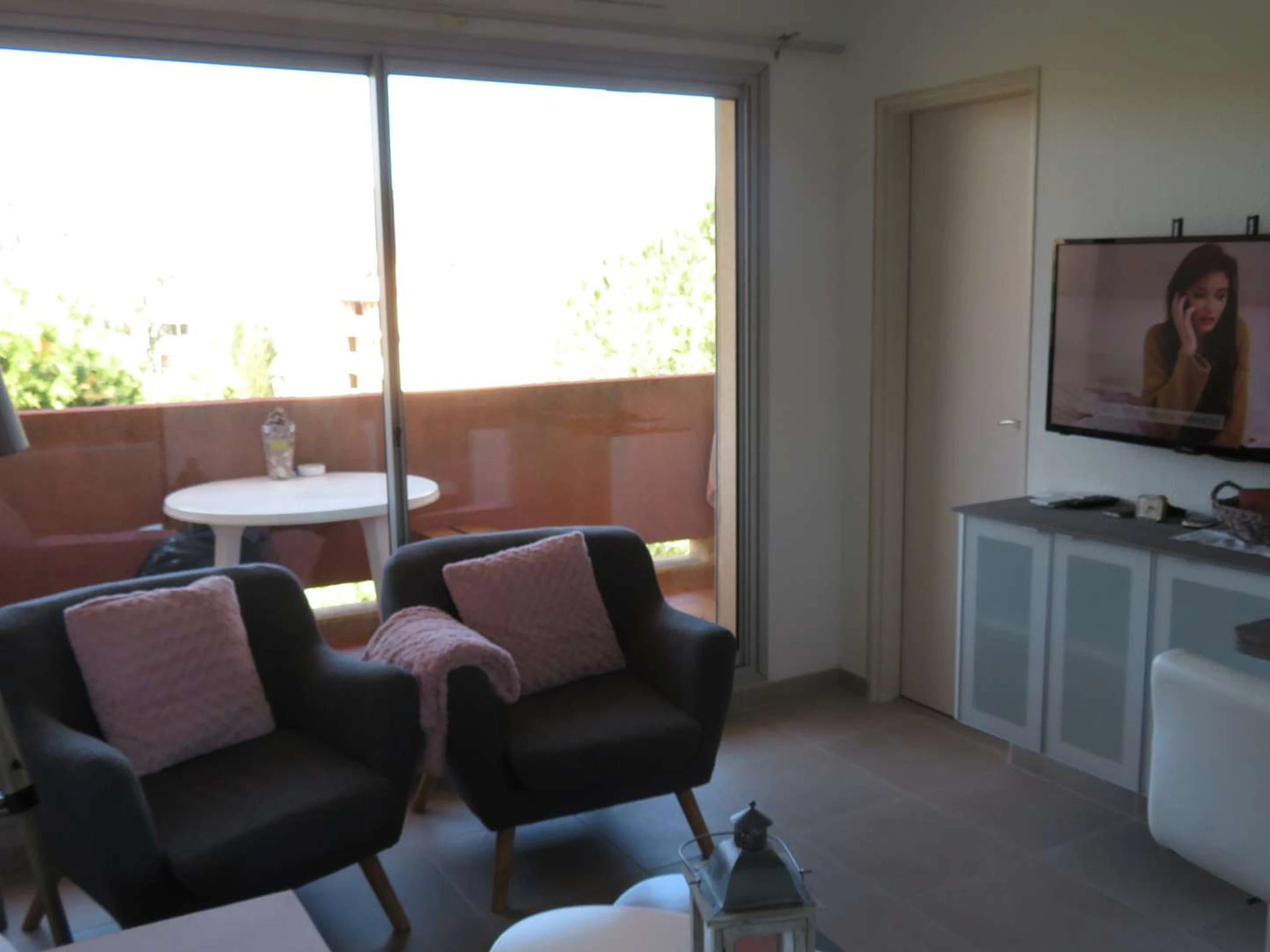 Charming, air-conditioned studio apartment with a sleeping alcove, 20m², accommodating up to 4 people. It features a living area with a fold-down bed (140x190cm), armchairs and a sofa, a wall-mounted TV, an open-plan kitchen fully equipped with a large integrated fridge/freezer in the wall cupboard, a small bedroom with a double bed (140cm) and a TV, a shower room/WC, a laundry room with a washing machine, and a large furnished terrace facing northeast. Underground garage. Pets are not allowed. Linens are available at an extra cost. Cleaning is included in the price. Swimming pool open from mid-June to mid-September.