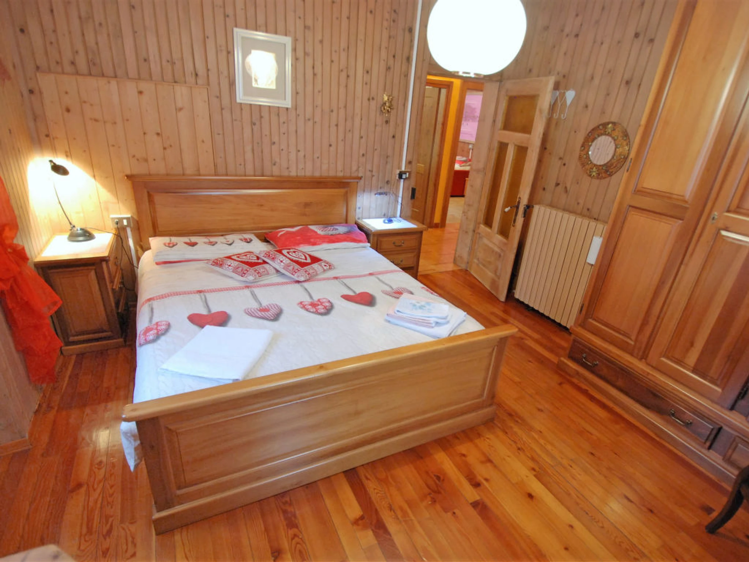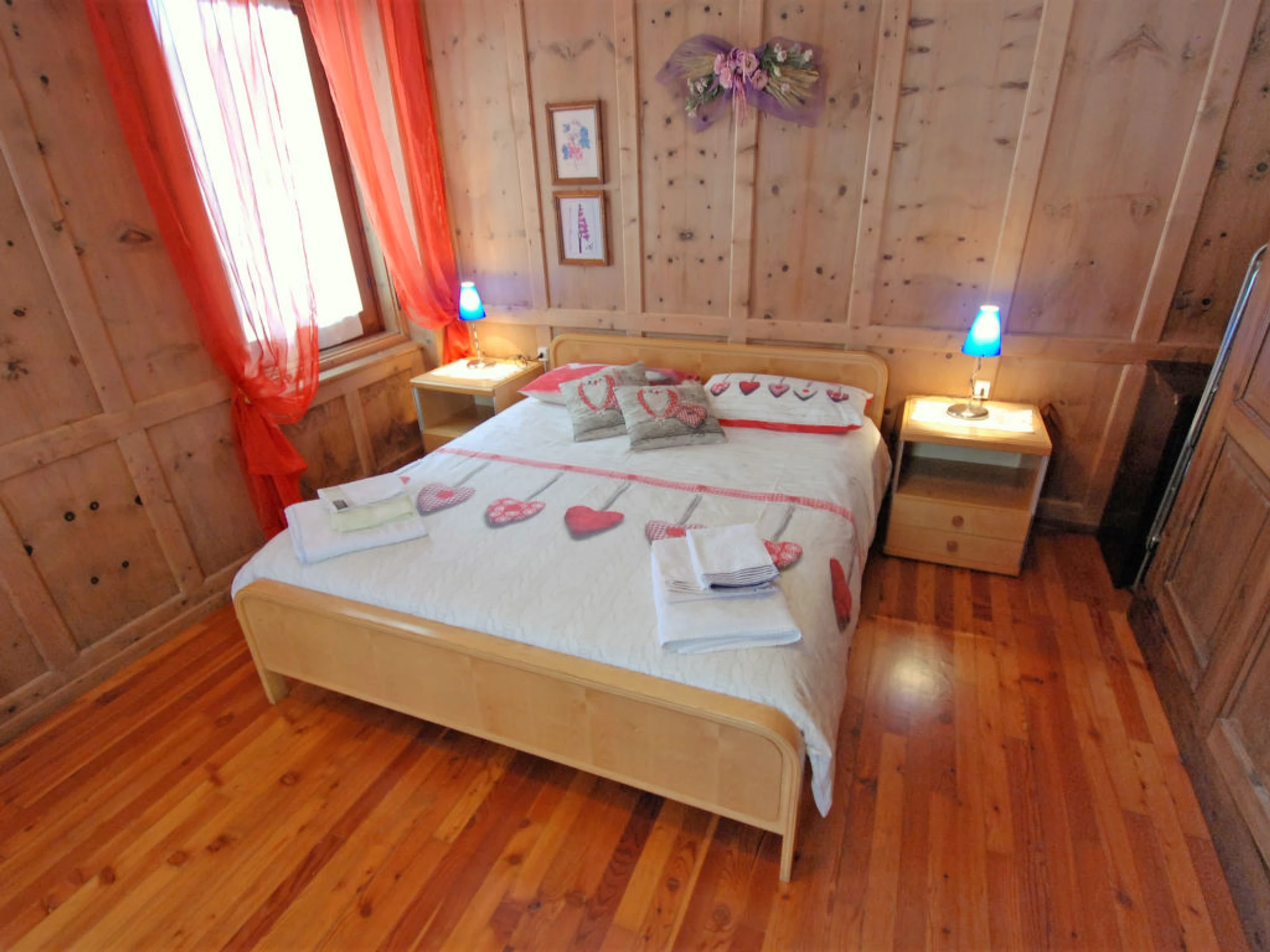 3-room apartment 85 m2, on the upper ground floor. Bright, comfortable and wooden furniture furnishings: entrance hall. Exit to the garden. 1 small room with 1 double sofabed and TV (flat screen). Living/sleeping room with 1 double bed. 1 room with 1 double bed. Kitchen (oven, dishwasher, 4 ceramic glass hob hotplates, microwave, freezer, electric coffee machine) with dining table, satellite TV (flat screen), wood-burning stove. Shower/bidet/WC. Heating, wood heating. Parquet floors. Deck chairs (6). View of the mountains, the valley and the river. Facilities: washing machine, iron, hair dryer. Internet (WiFi, free). Please note: non-smoking house. Maximum 1 pet/ dog allowed. Included: Pet, Heating, Wireless internet access (WIFI), ERV assurance annulation gratuite, Laundry (initial supply of bed linen and towels) Mandatory extra services on site: Local tax 1.3EUR per person/day, Final cleaning 10.0EUR per person
