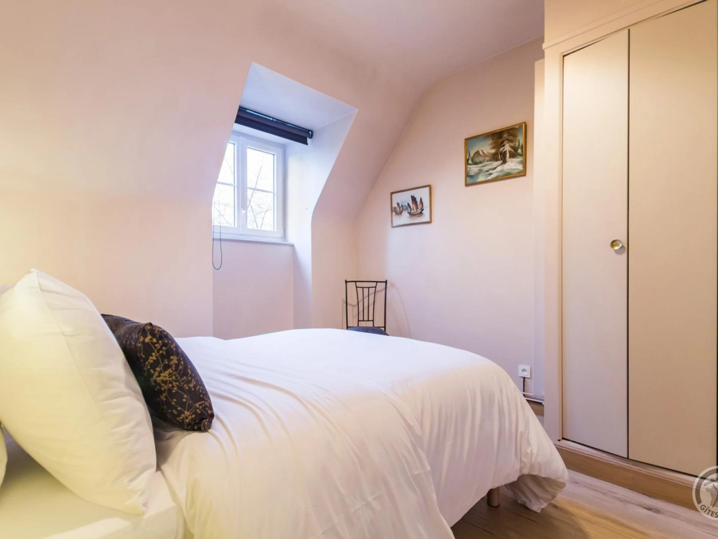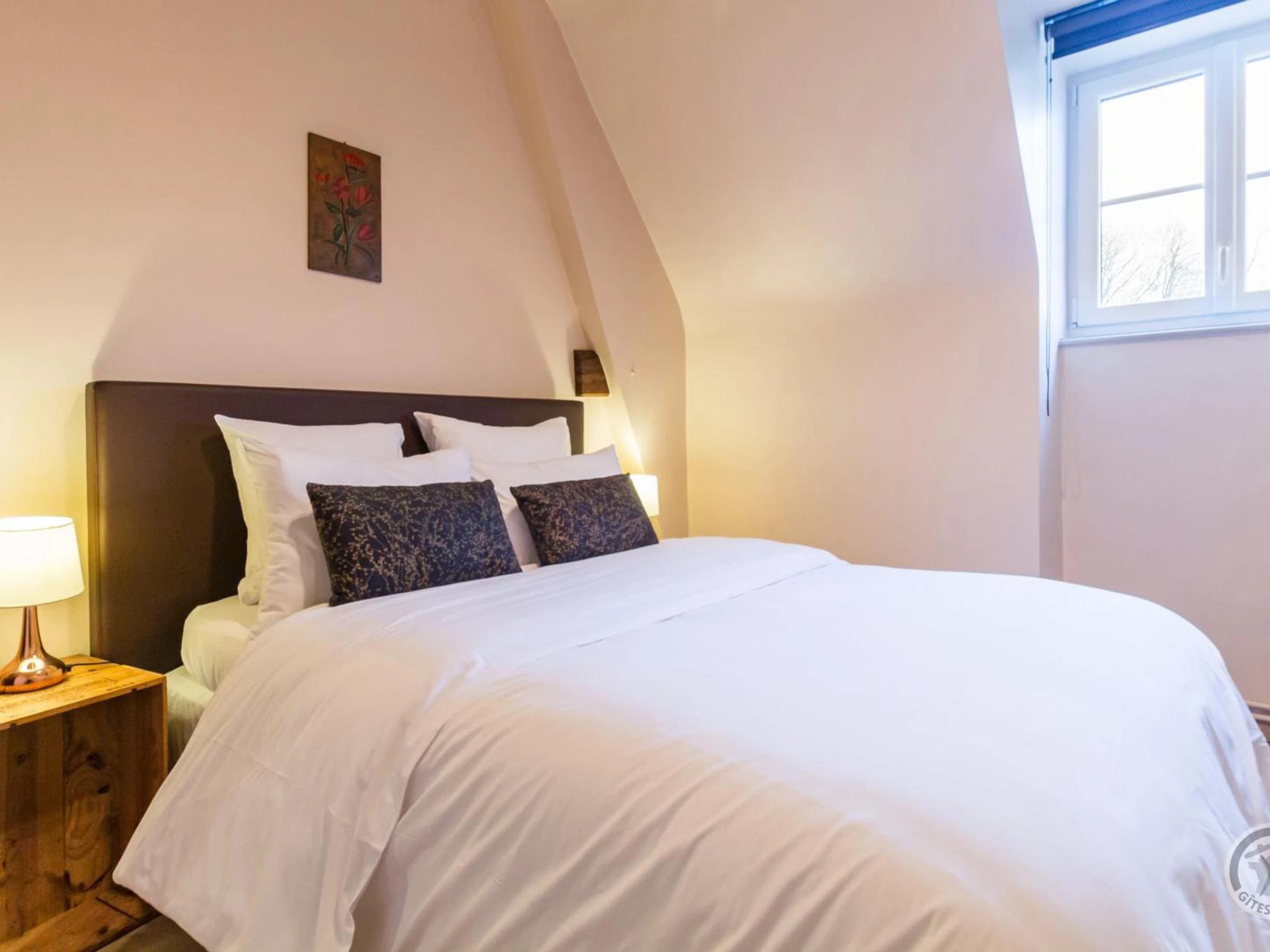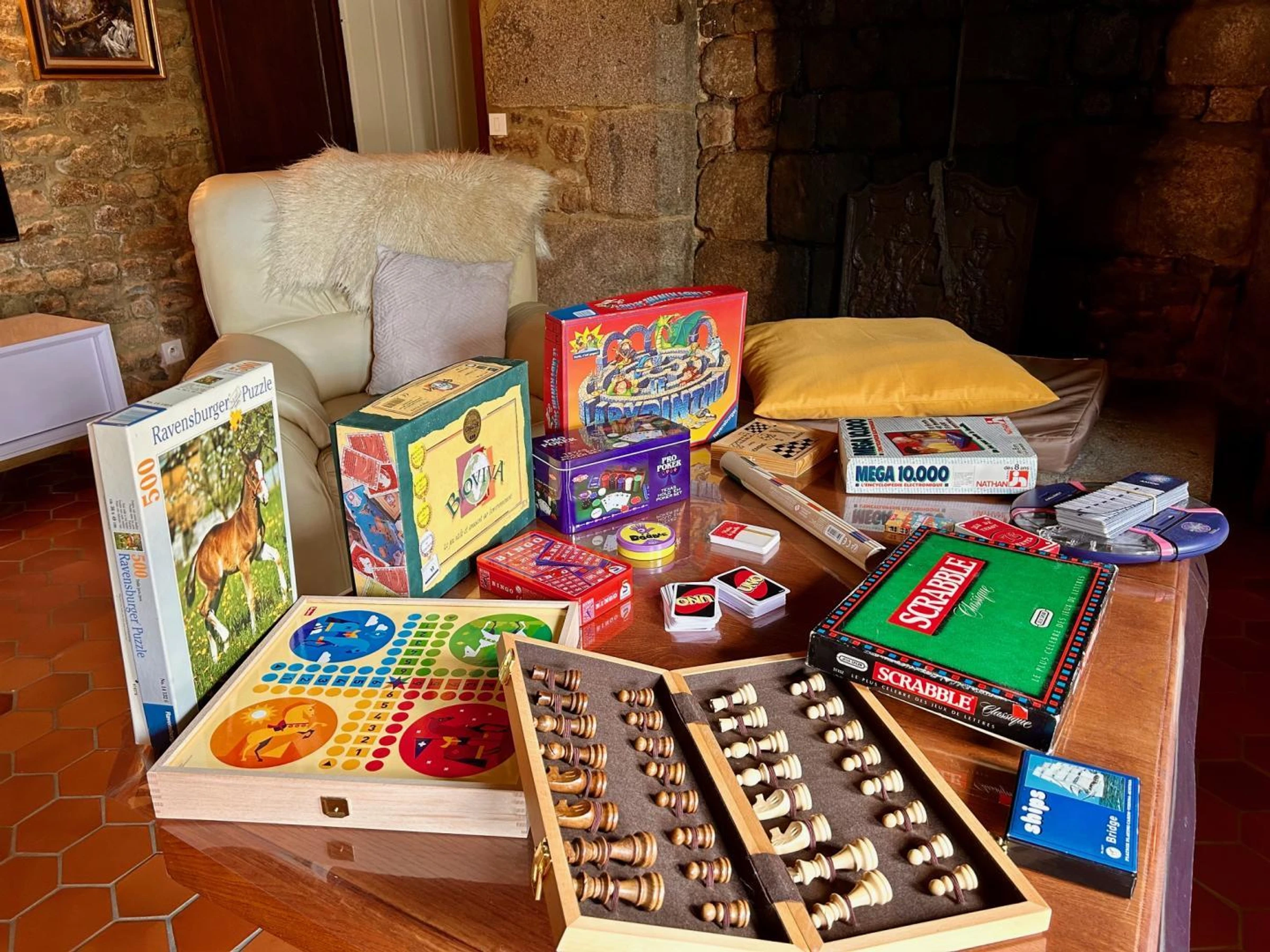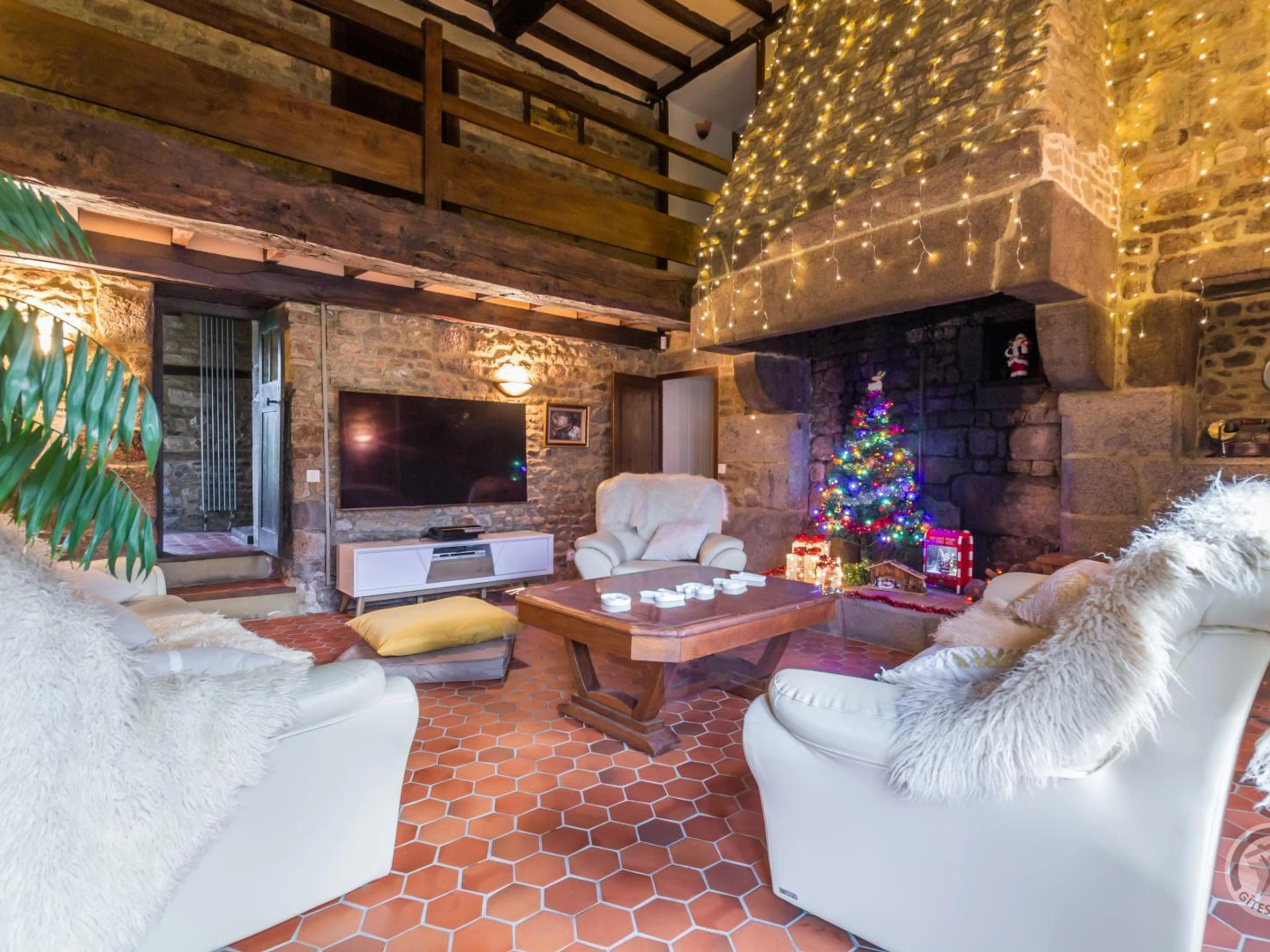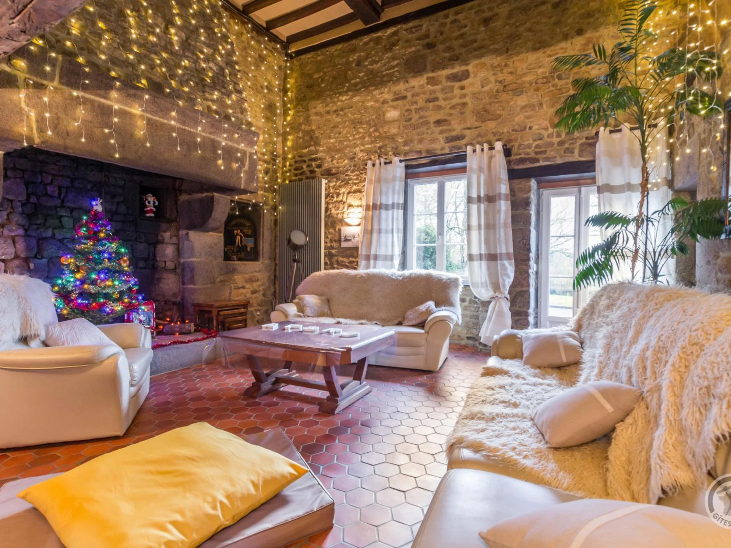 Detached house with different levels. Living room with open-plan kitchen (oven, electric hob, microwave, dishwasher, fridge with freezer), lounge (smart TV, internet, DVD player, PS3 console, Bluetooth speaker). On the ground floor: Bedroom 1 (queen-size bed) with en-suite bathroom and toilet. Laundry room (washing machine, tumble dryer) with additional shower room and toilet. On the first floor: Bedroom 2 (two single beds), Bedroom 3 (queen-size bed), washroom (toilet and sink), Bedroom 4 (queen-size bed), Bedroom 5 (two single beds) and a sofa bed (double bed) and bathroom. Baby equipment available on request (one wooden cot, one folding bed, two high chairs). Geothermal central heating included. Bed linen provided. Towels available for hire. Cleaning service included. Caution: Pre-authorization by credit card required. Large, private, unfenced grounds (5000m²). Garden furniture. Barbecue. Sun loungers. Clubhouse with ping-pong, foosball, darts, children's playhouse, and outdoor games (balls, volleyball, badminton, molkky). Petanque court. Free parking. The path leading down to Rochelu gradually immerses you in greenery. Chestnut trees greet you, and your mind immediately wanders in this unspoiled environment. You will be warmly welcomed by Caroline in this authentic family home, which sleeps up to 12. Everything is perfectly arranged for your comfort and well-being. Families, in particular, will spend happy days here, barely disturbed by birdsong and the whisper of the wind in the trees. With a little patience, you might spot the rich wildlife of our countryside (squirrels, hedgehogs, deer, etc.). With its monumental fireplace, the beautiful living room is the heart of the house and will be the perfect place for your convivial evenings. But when the warmer weather arrives, the old porch and its magnificent granite wine press offer a superb setting for an aperitif at twilight. A timeless charm pervades the 154m² of this longère (traditional Breton farmhouse) and envelops you in a very comforting atmosphere.
