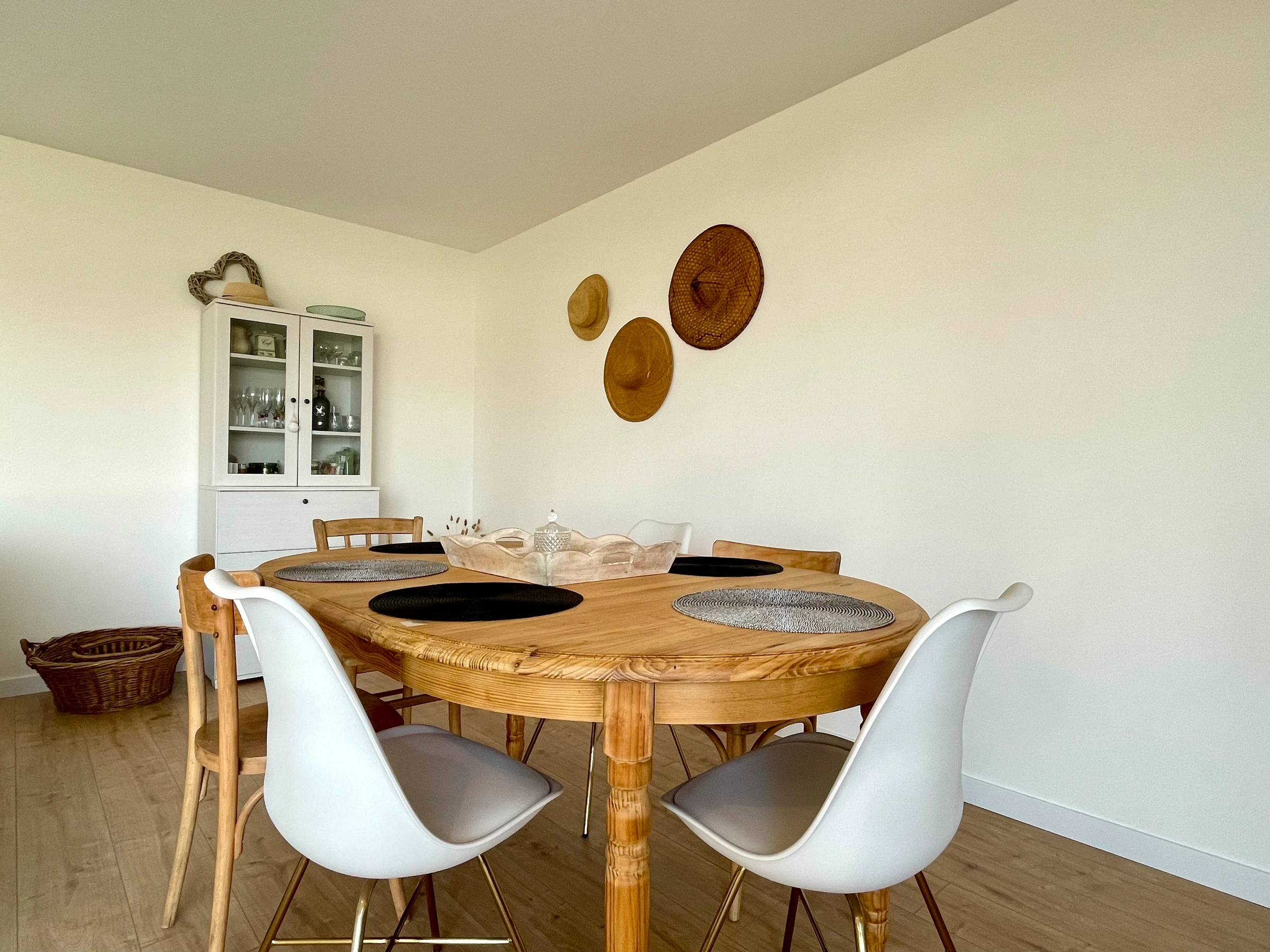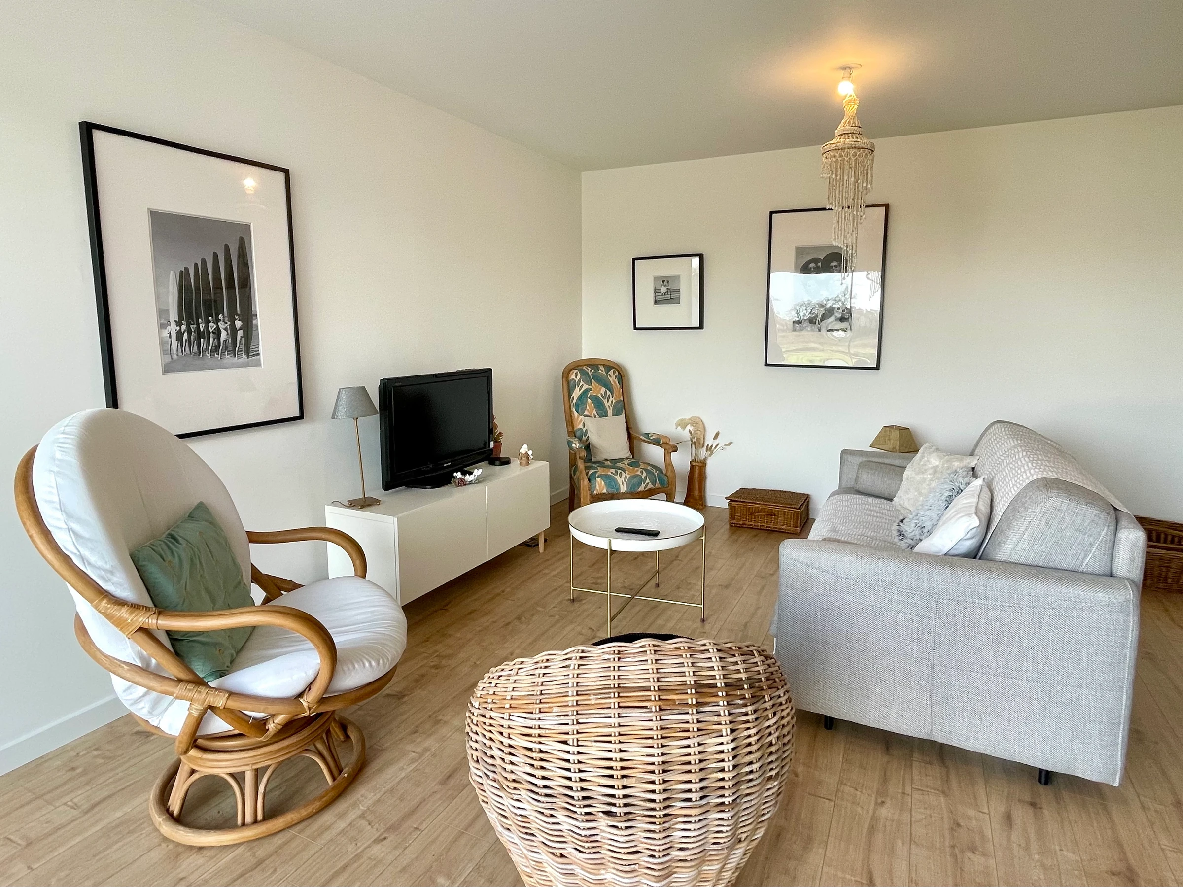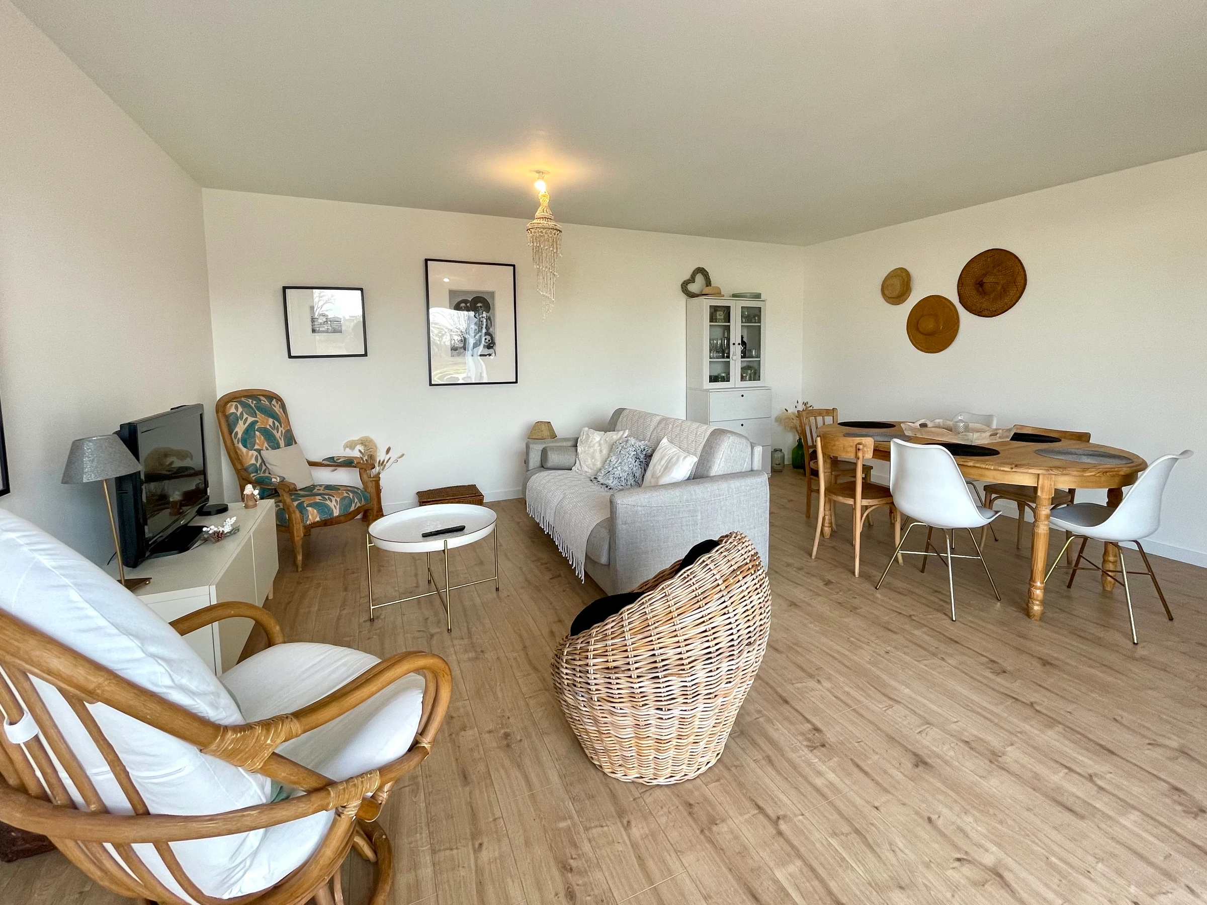 An entrance hallway with a toilet leads to a spacious 36m² living room with a fitted and equipped kitchen (induction hob, extractor hood, dishwasher, oven, and a large refrigerator) opening onto the living area with a dining area (table, chairs, and sideboard) and a lounge/relaxation area (TV, sofa, armchairs, and coffee table). Wi-Fi access is available.