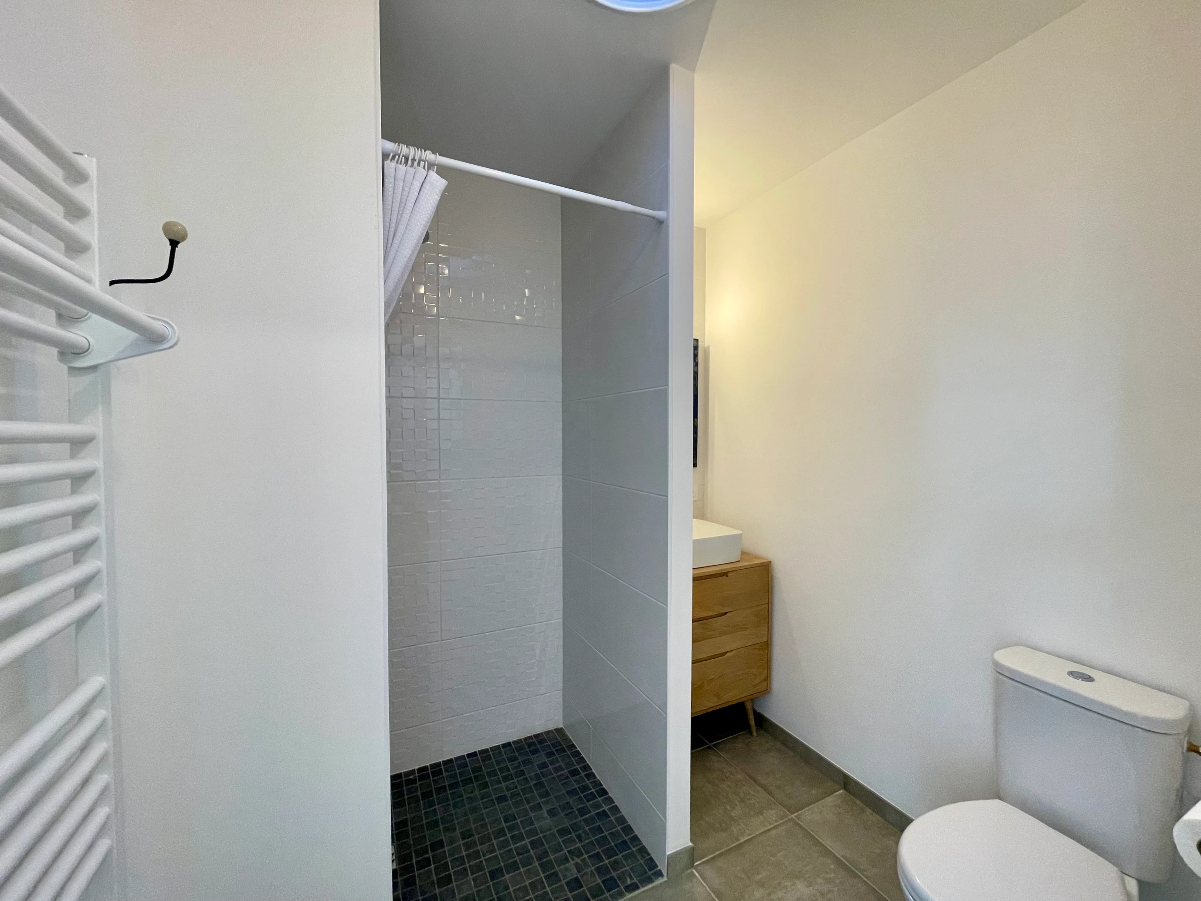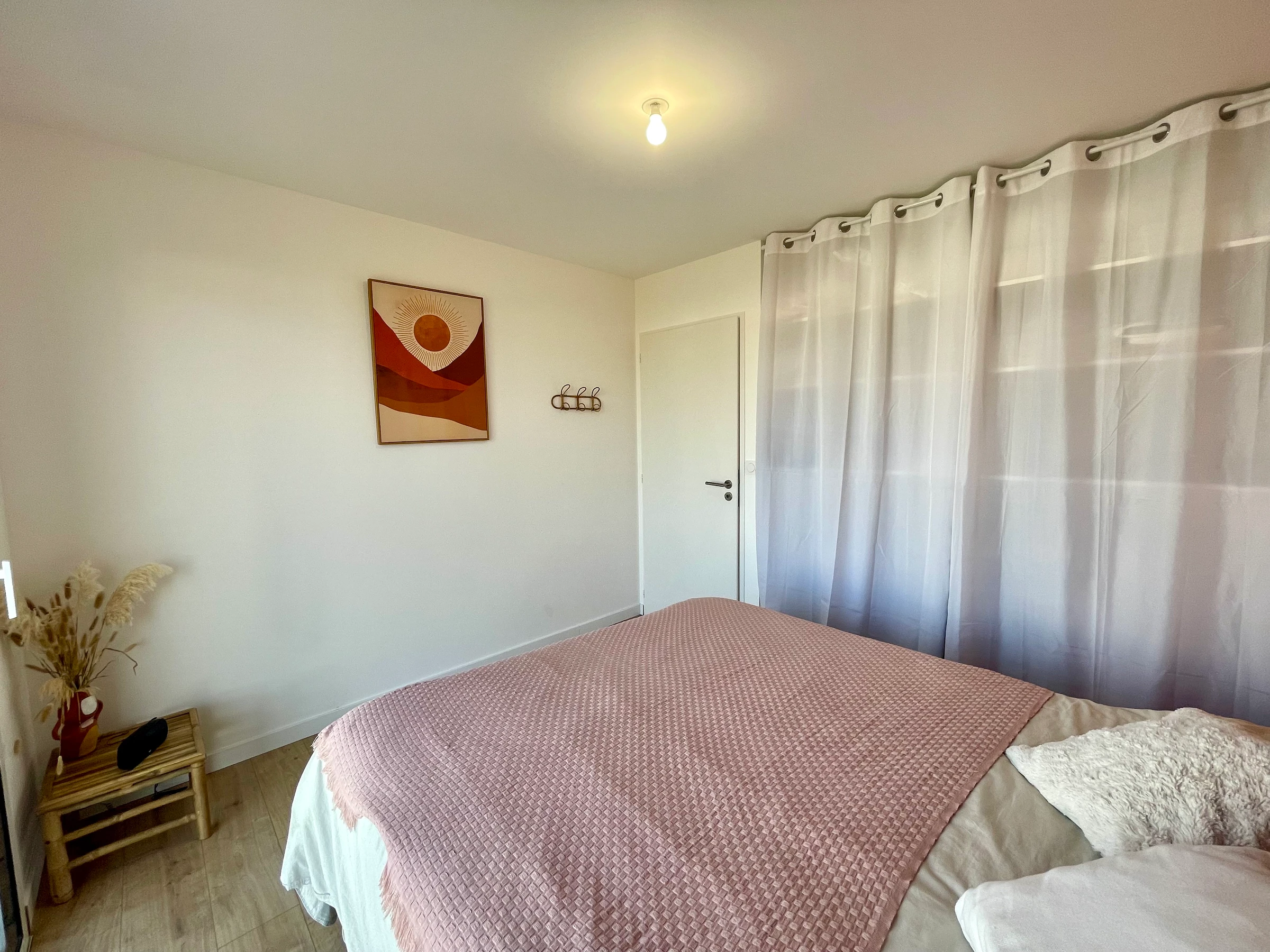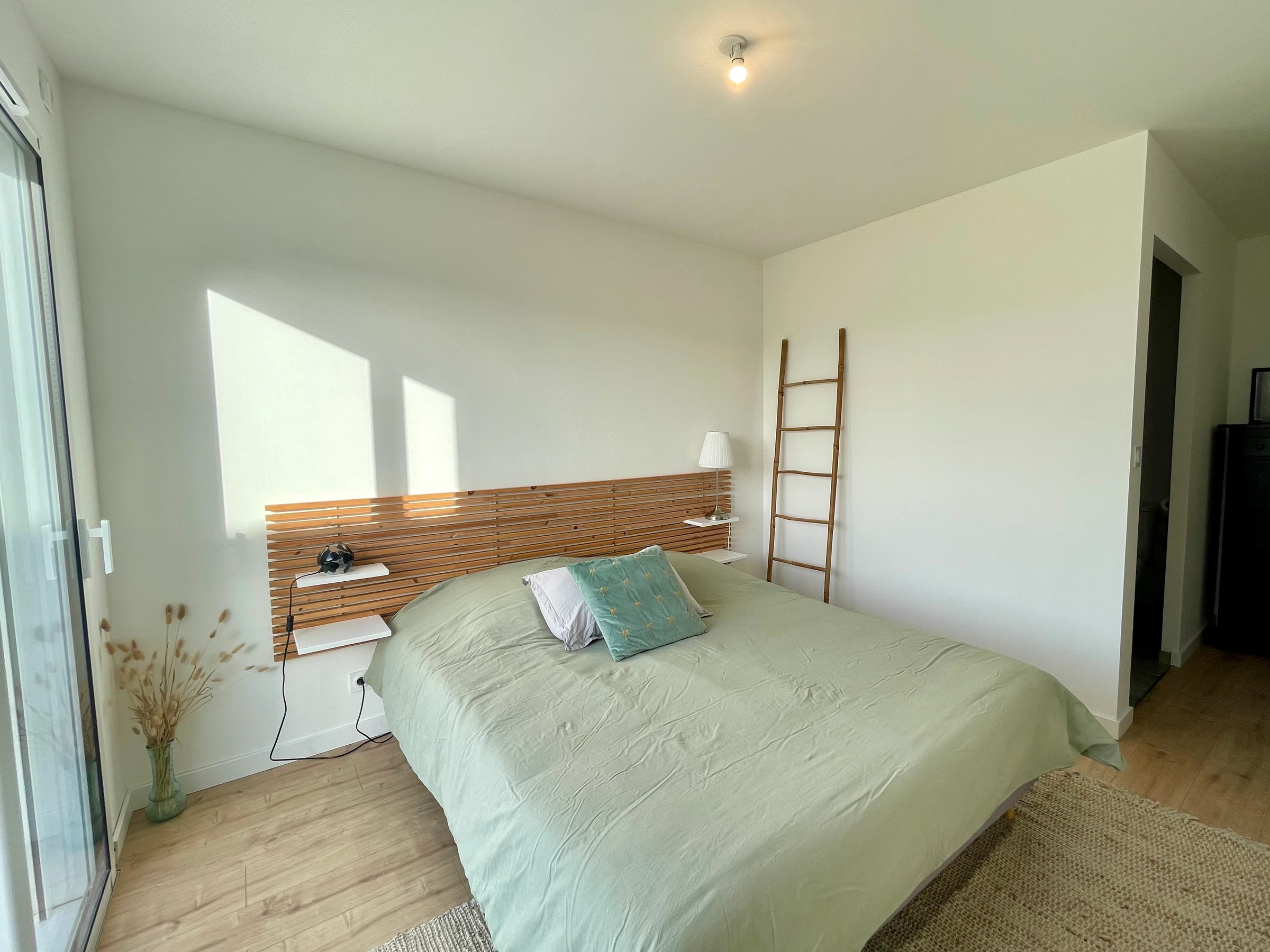 On the other side of the living room, a hallway leads to two bedrooms and a second bathroom (shower, vanity unit, heated towel rail, and toilet). Bedroom 2: a double bed (160 x 200) + walk-in closet. Access to the terrace from the bedroom.