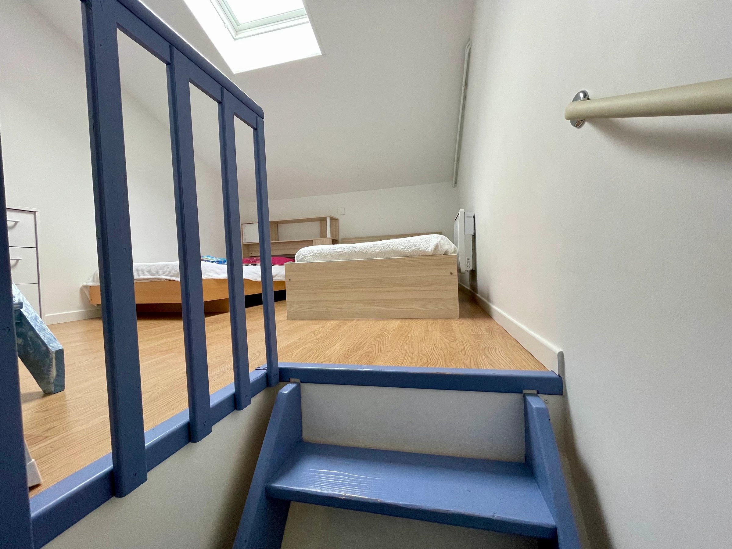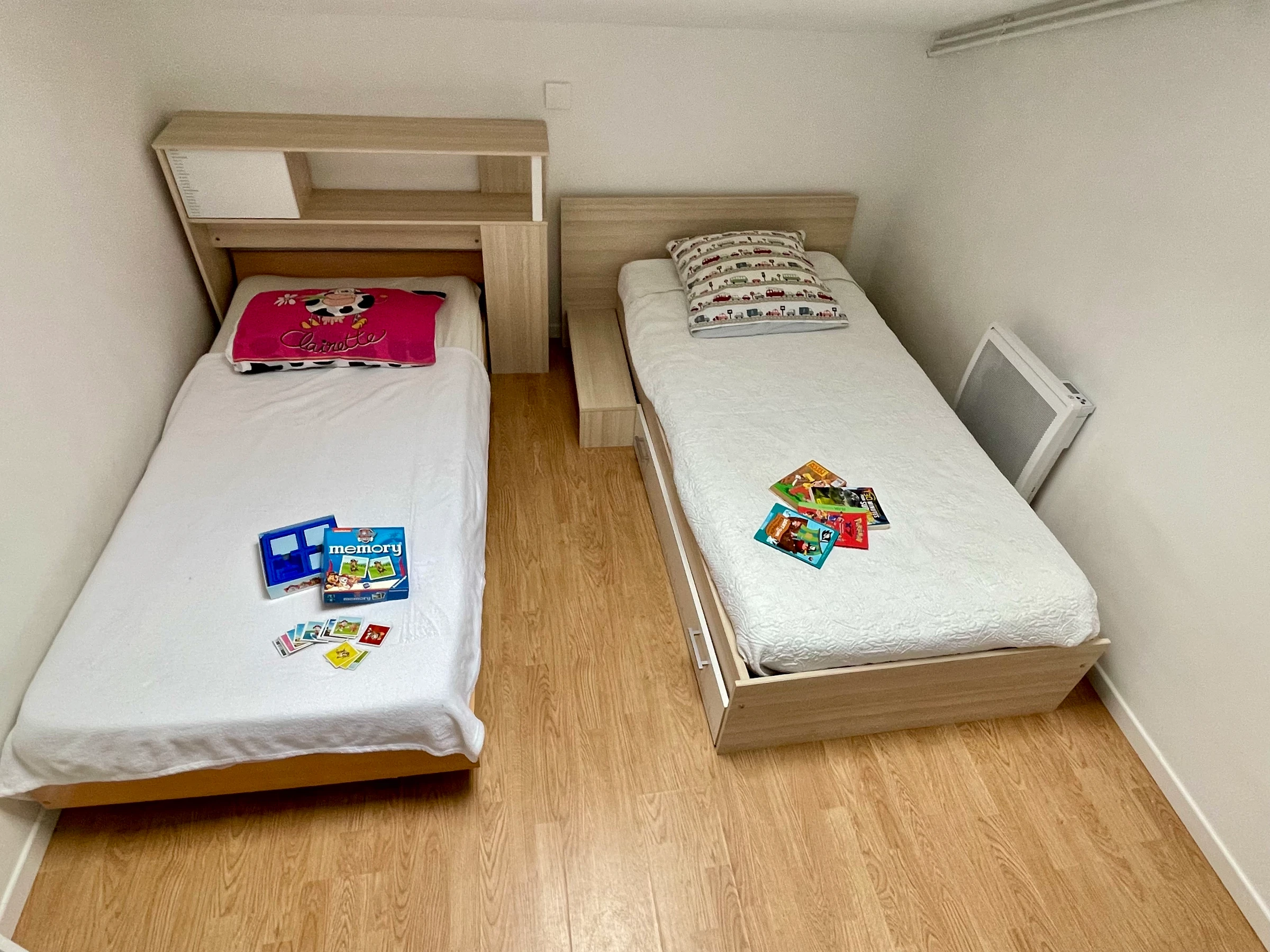 Opposite this sleeping area, a third bedroom is accessible via a few steps. Bedroom 3 (children's room under the eaves): 2 single beds (90 cm).