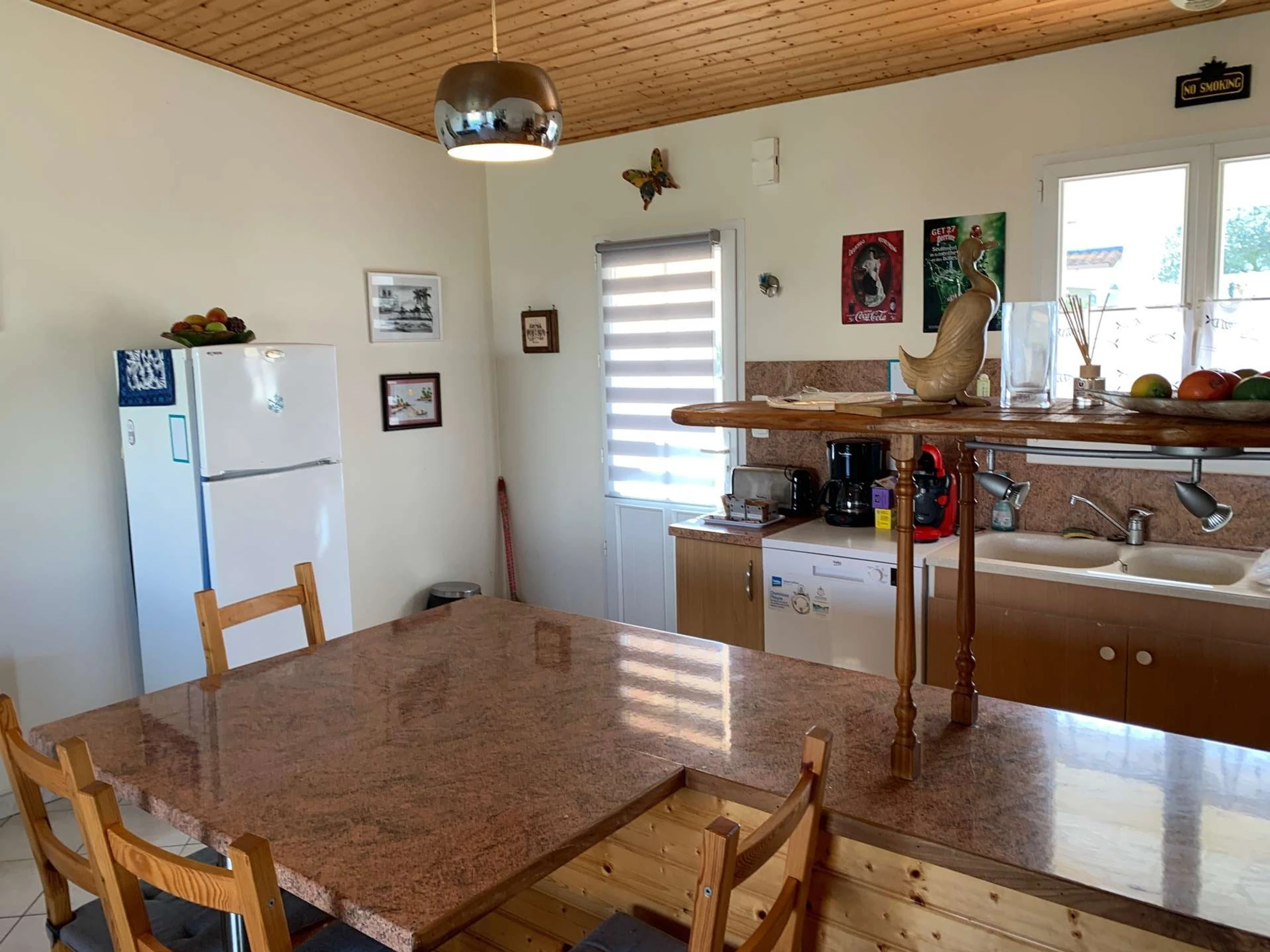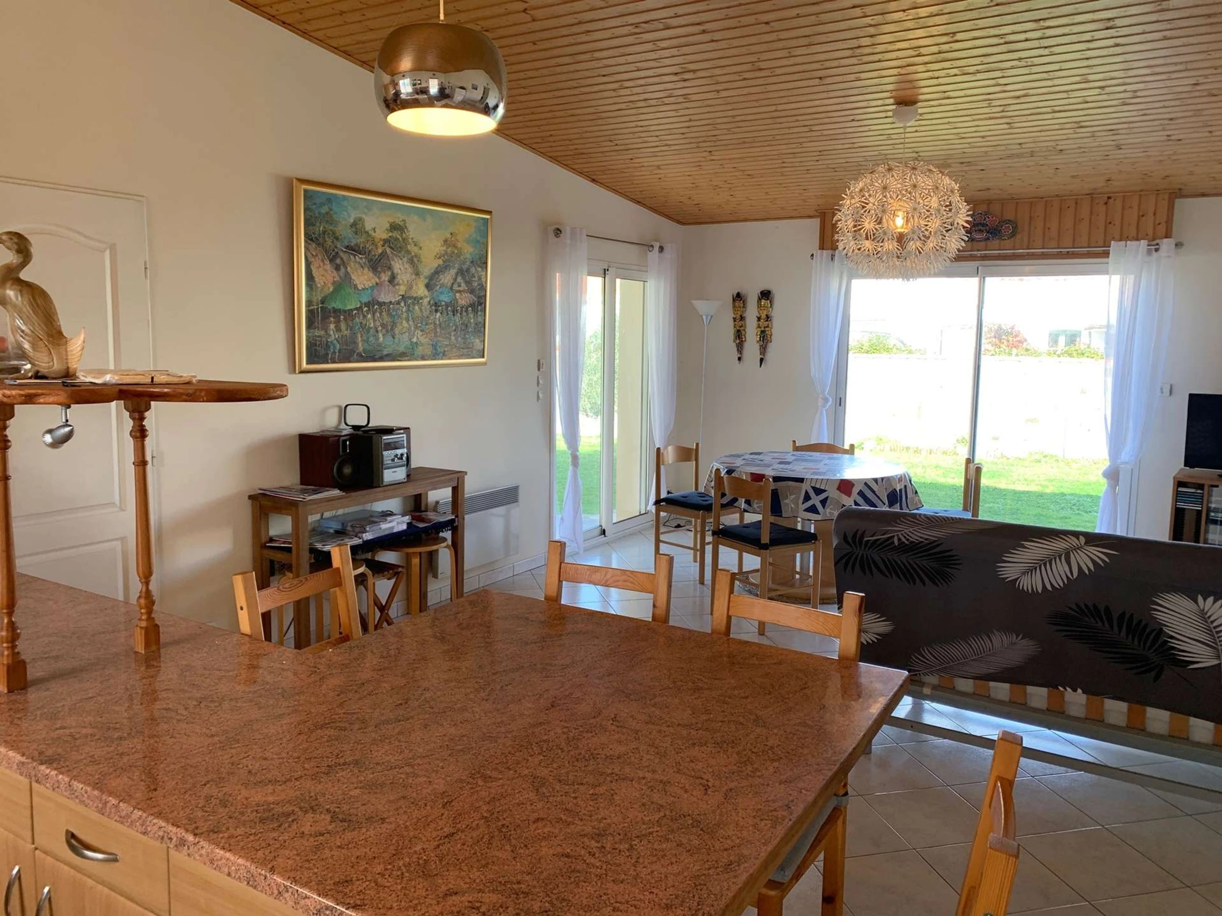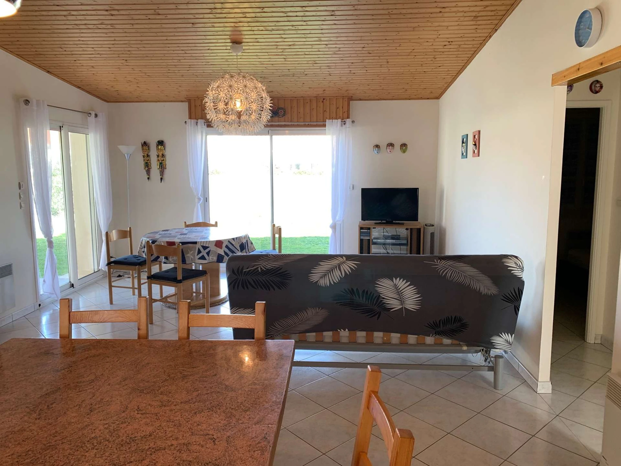 Une grande pièce de vie avec un coin cuisine aménagée et équipée (réfrigérateur-congélateur, lave-vaisselle, plaques de cuisson, micro-onde, four, petit électroménagers), un espace repas avec table et chaises, un espace salon avec canapé, table basse, et une télévision, un accès sur l'espace extérieur avec salon de jardin et terrain clos.