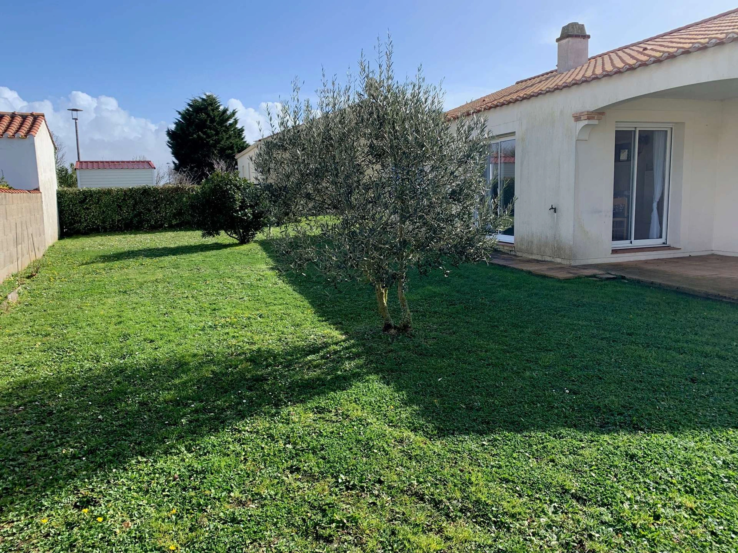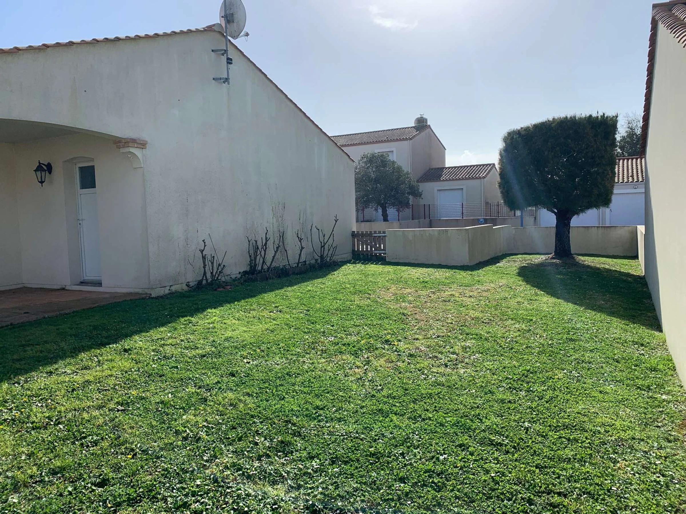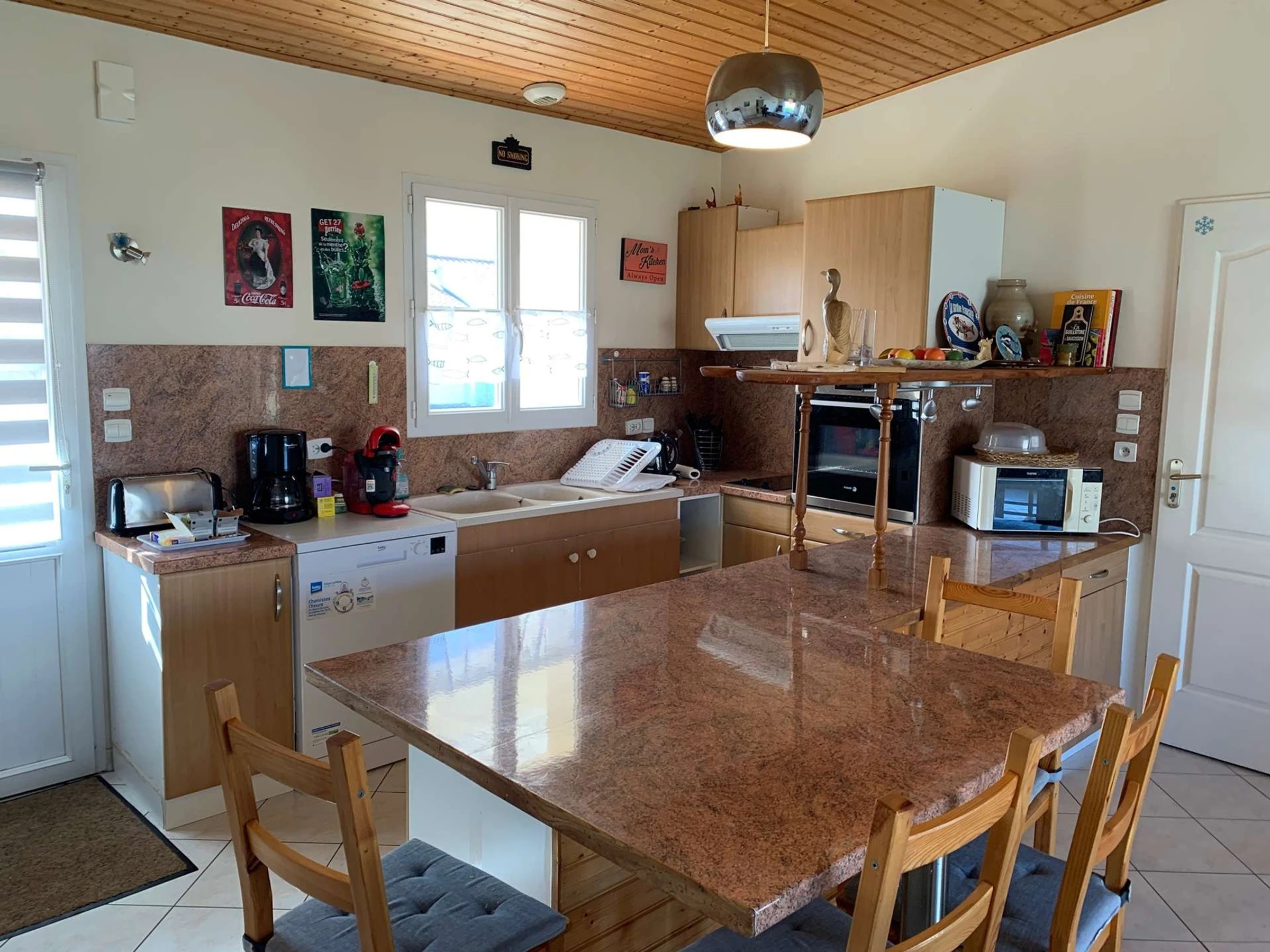 Une grande pièce de vie avec un coin cuisine aménagée et équipée (réfrigérateur-congélateur, lave-vaisselle, plaques de cuisson, micro-onde, four, petit électroménagers), un espace repas avec table et chaises, un espace salon avec canapé, table basse, et une télévision, un accès sur l'espace extérieur avec salon de jardin et terrain clos.
